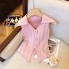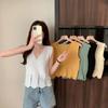 Camiseta de manga corta con cuello en U, corte entallado y hombros rectos para mujer, diseño de botones de verano, estilo corto, talla pequeña, de algodón puro con hilo.
