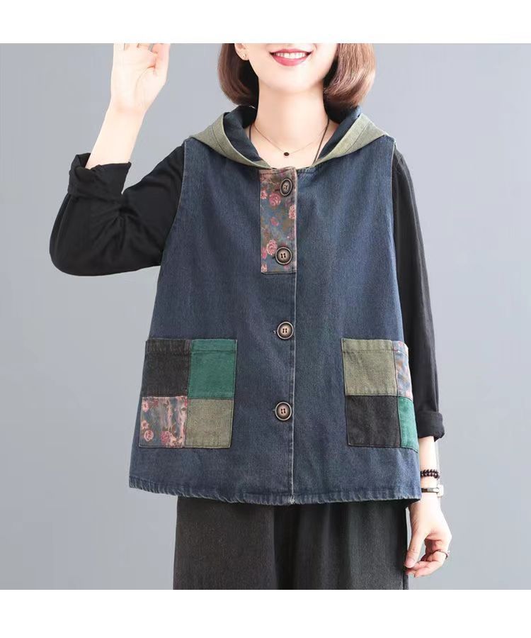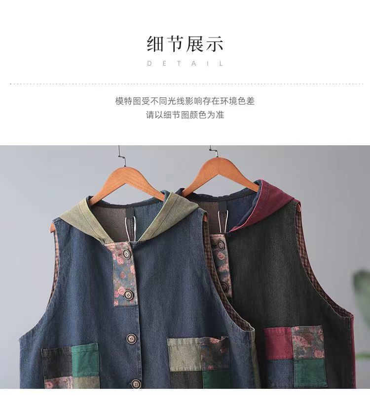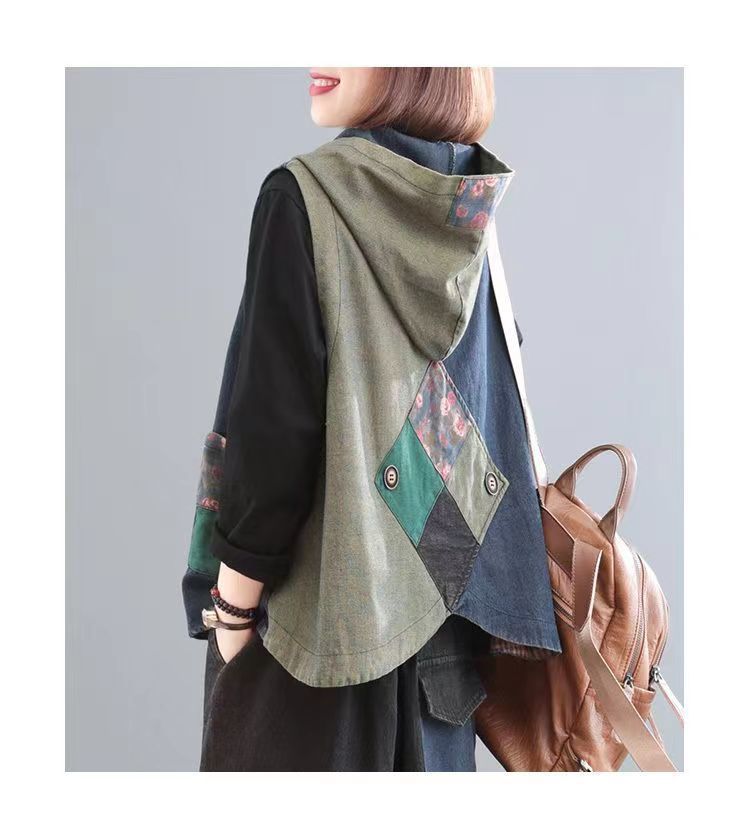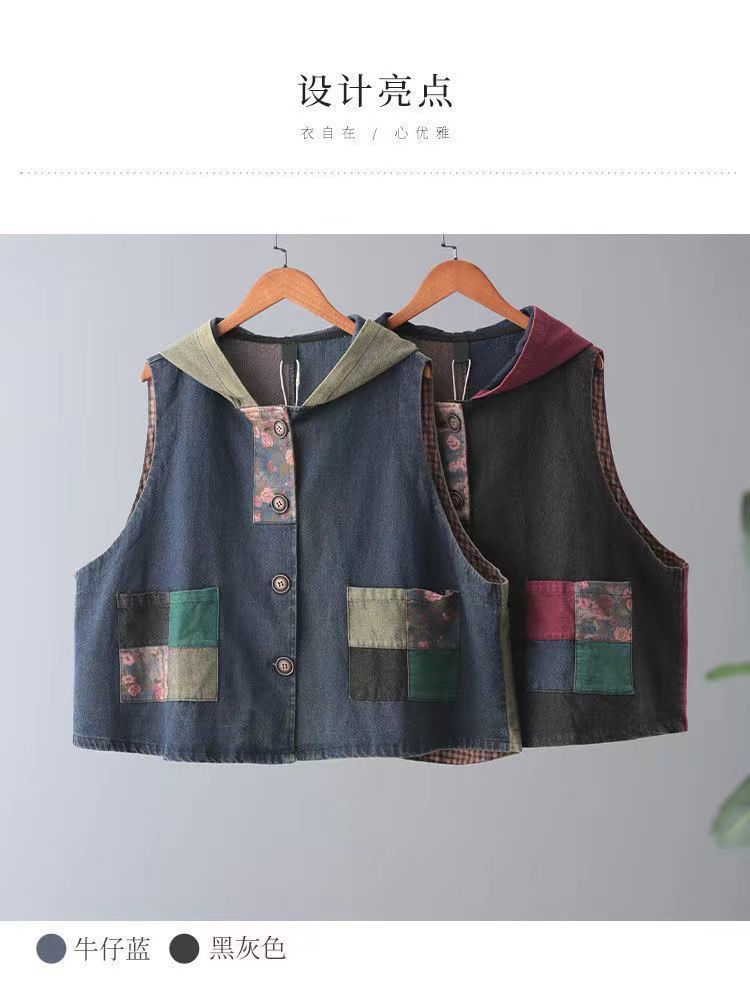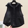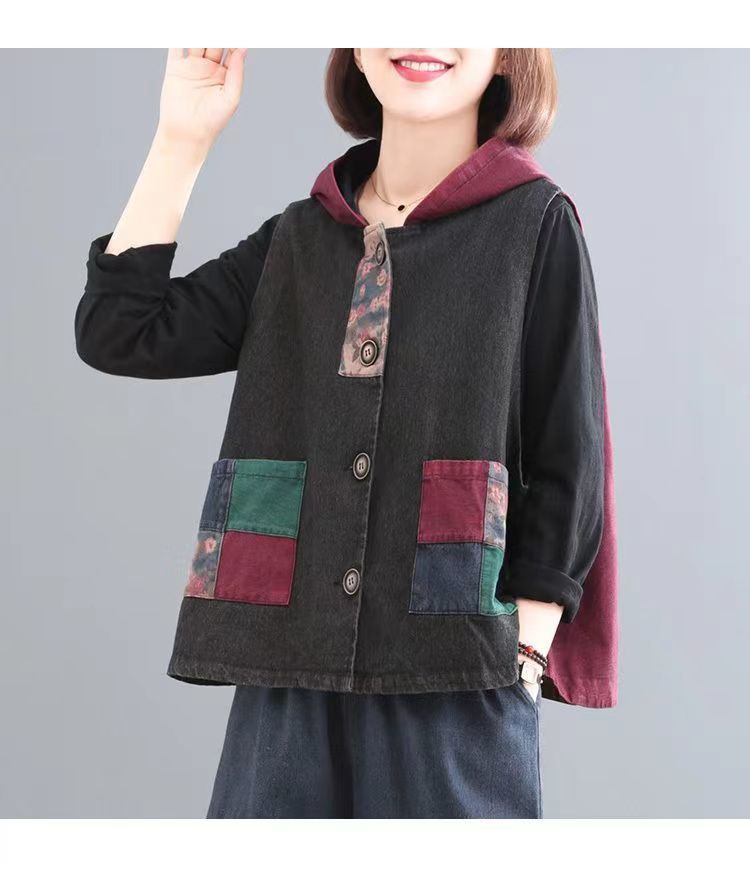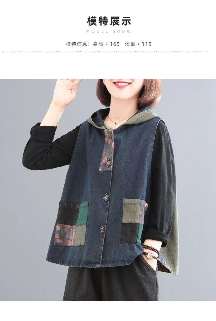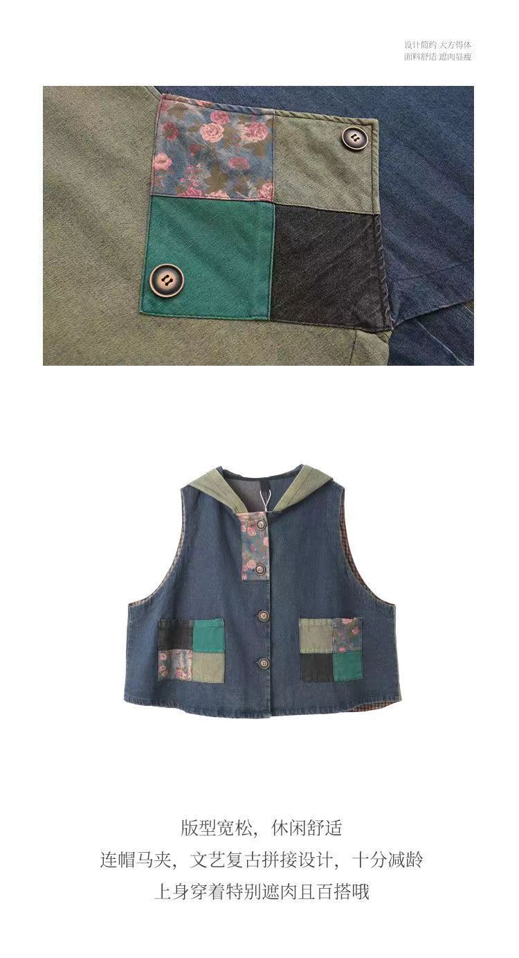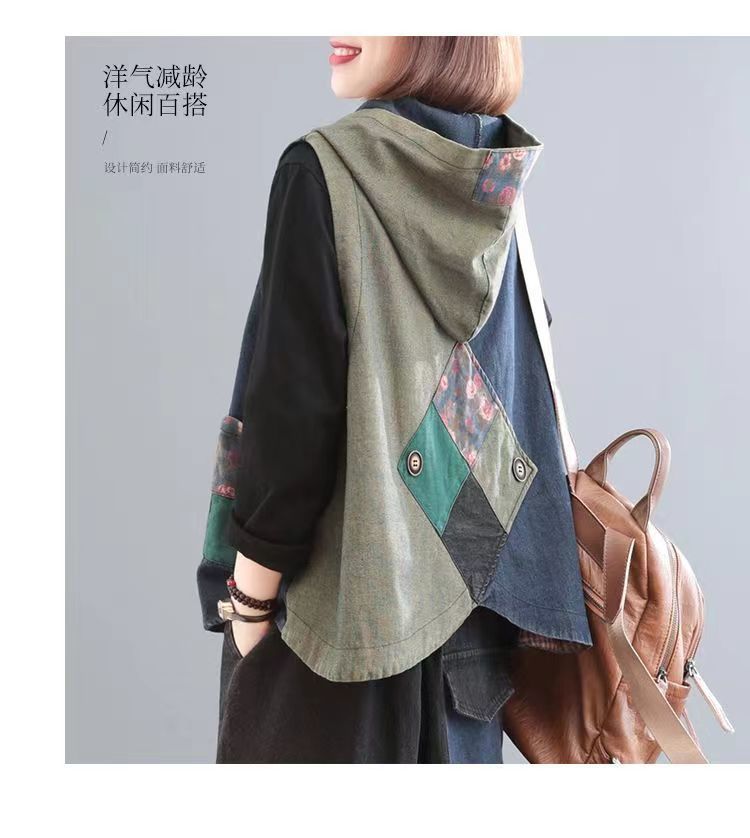 Chaleco de mezclilla con capucha y empalme estampado estilo coreano nuevo de primavera y otoño 2025, talla grande que cubre la carne, retro desgastado para mujer