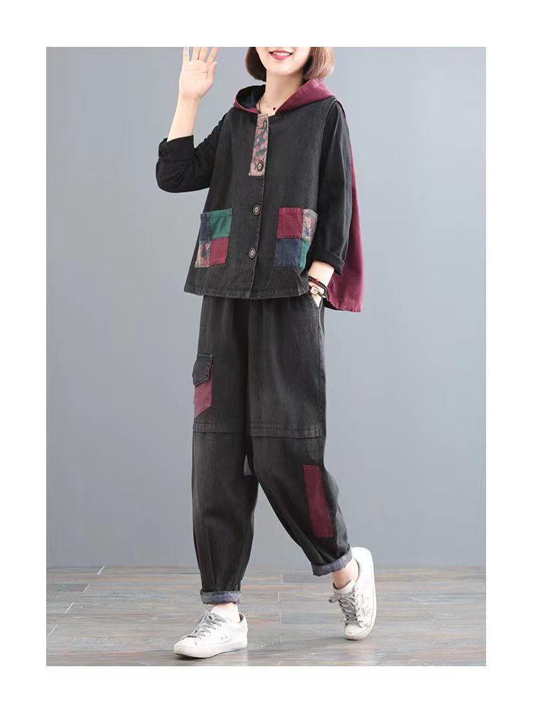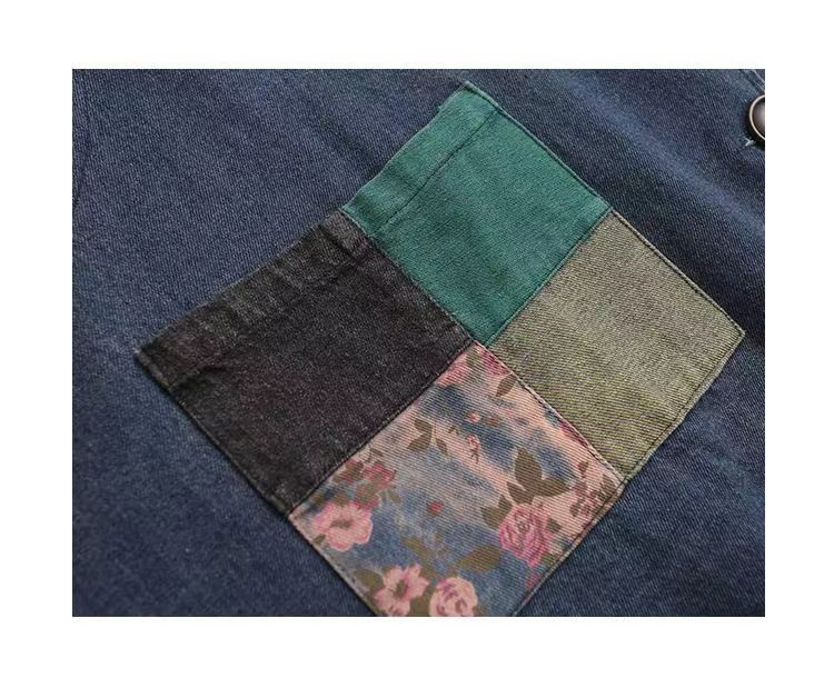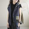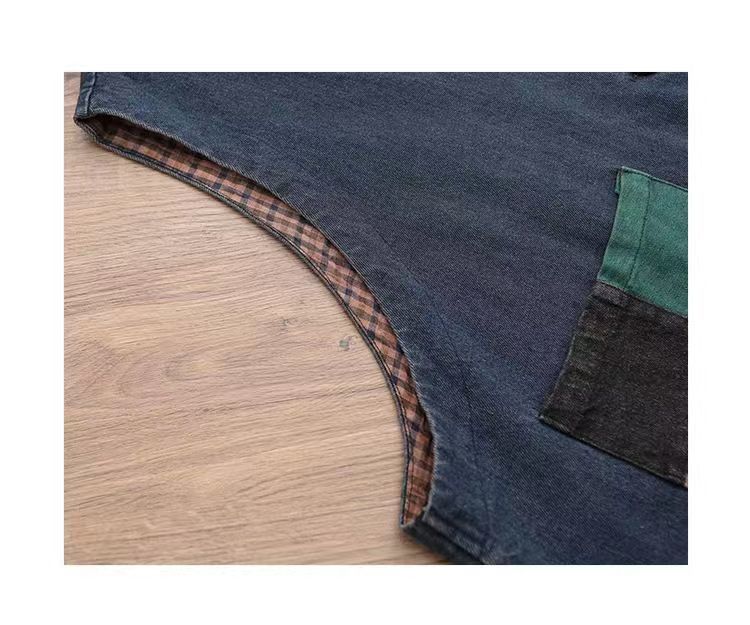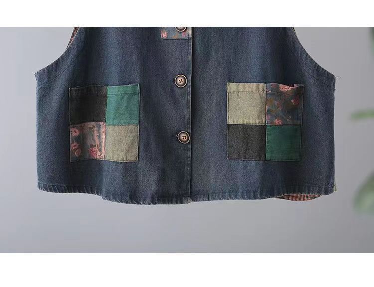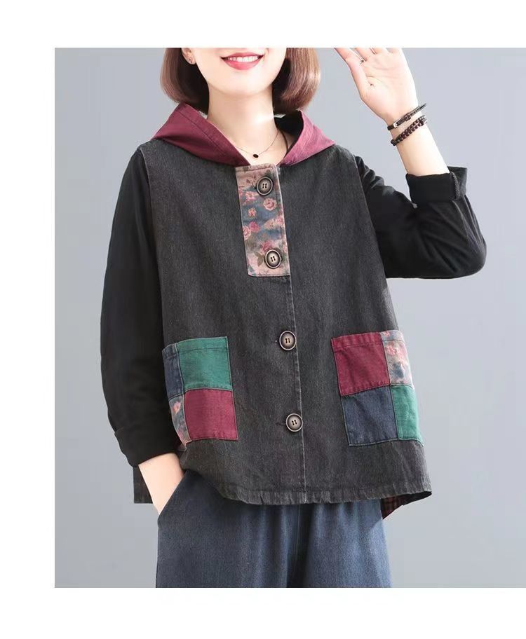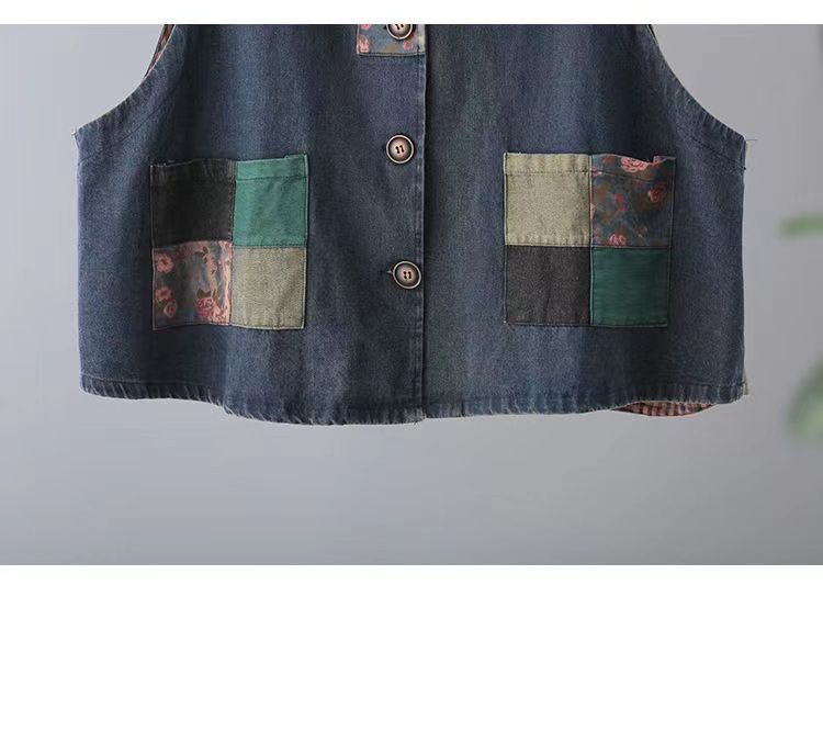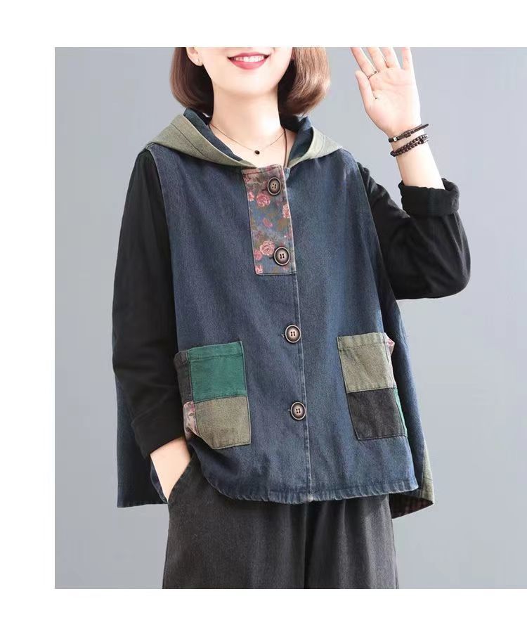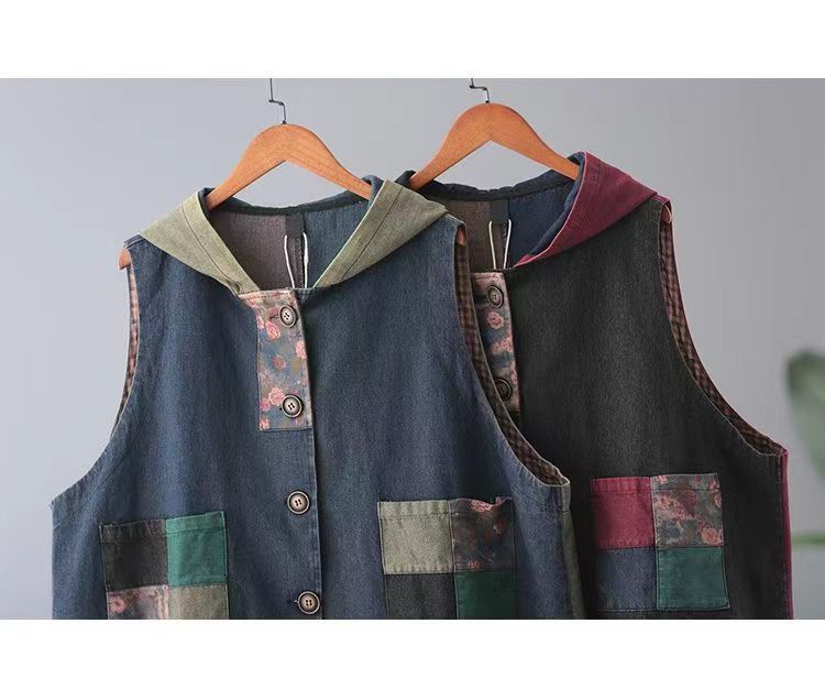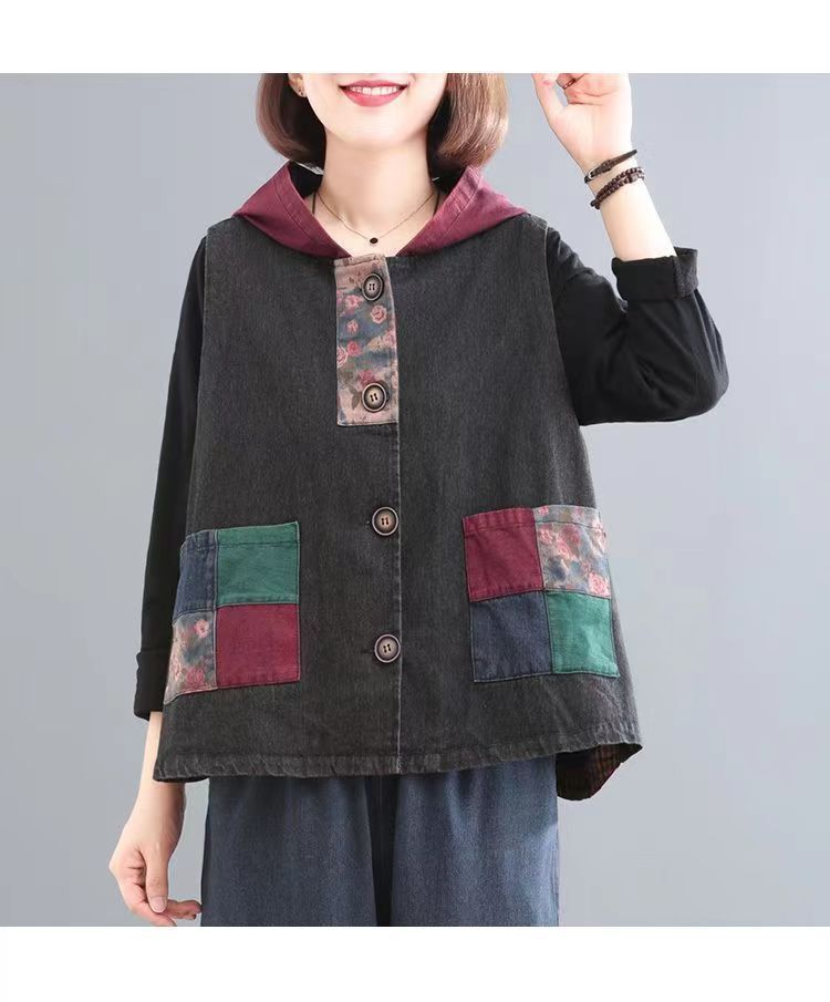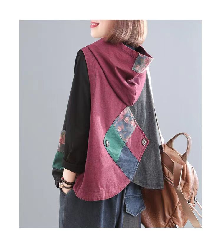 Chaleco de mezclilla con capucha y empalme estampado estilo coreano nuevo de primavera y otoño 2025, talla grande que cubre la carne, retro desgastado para mujer