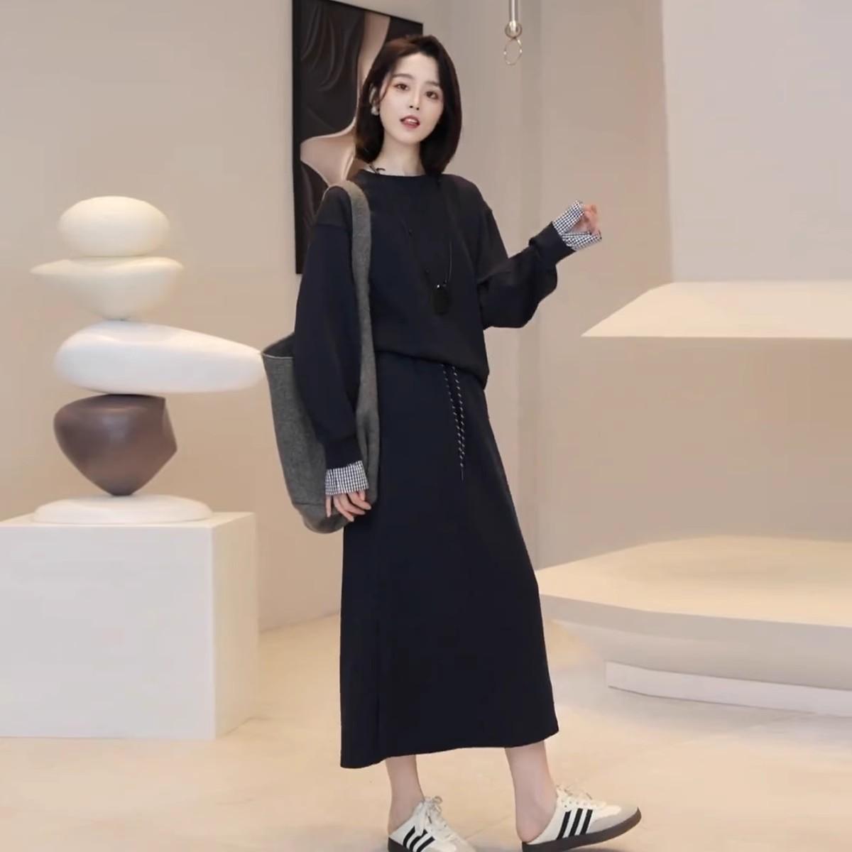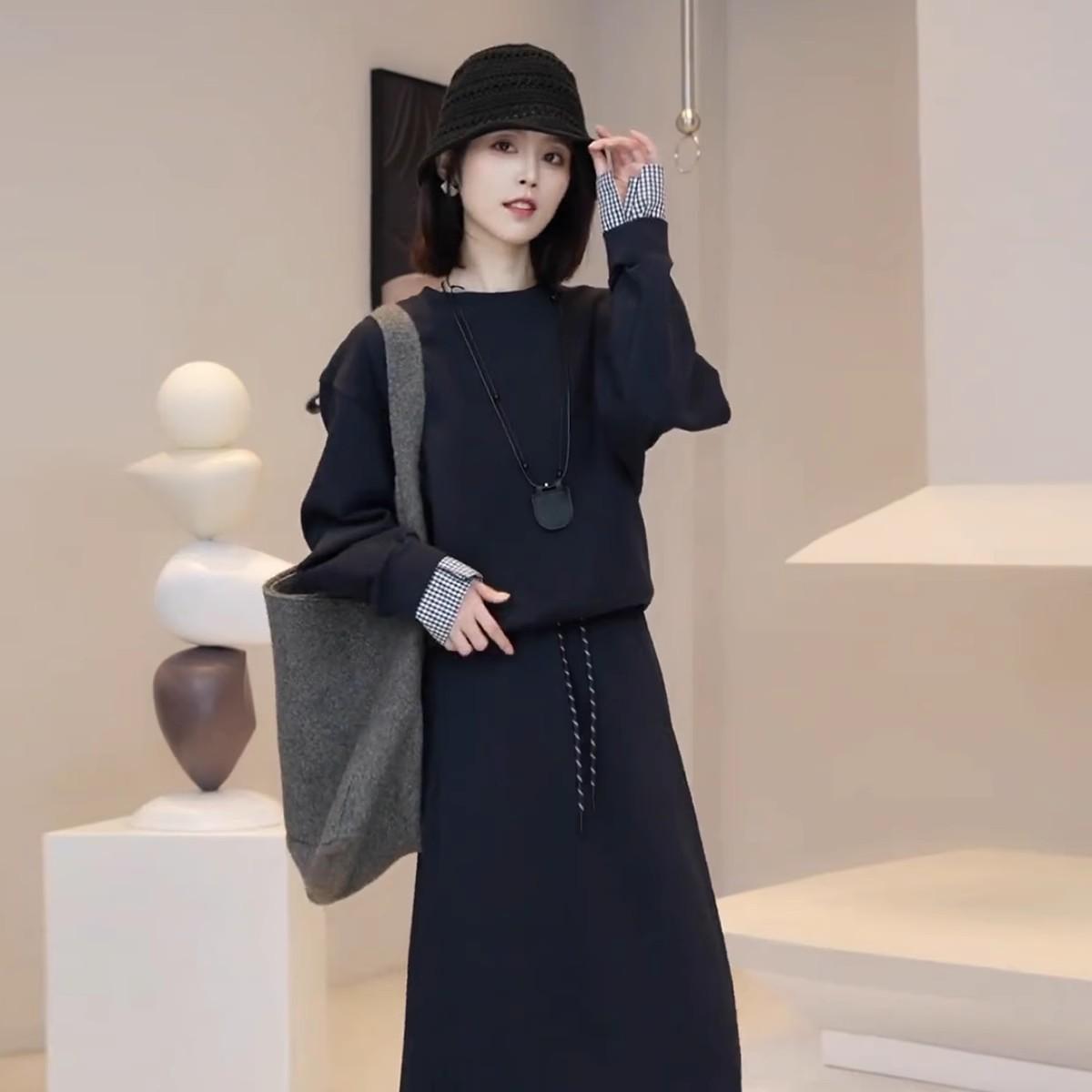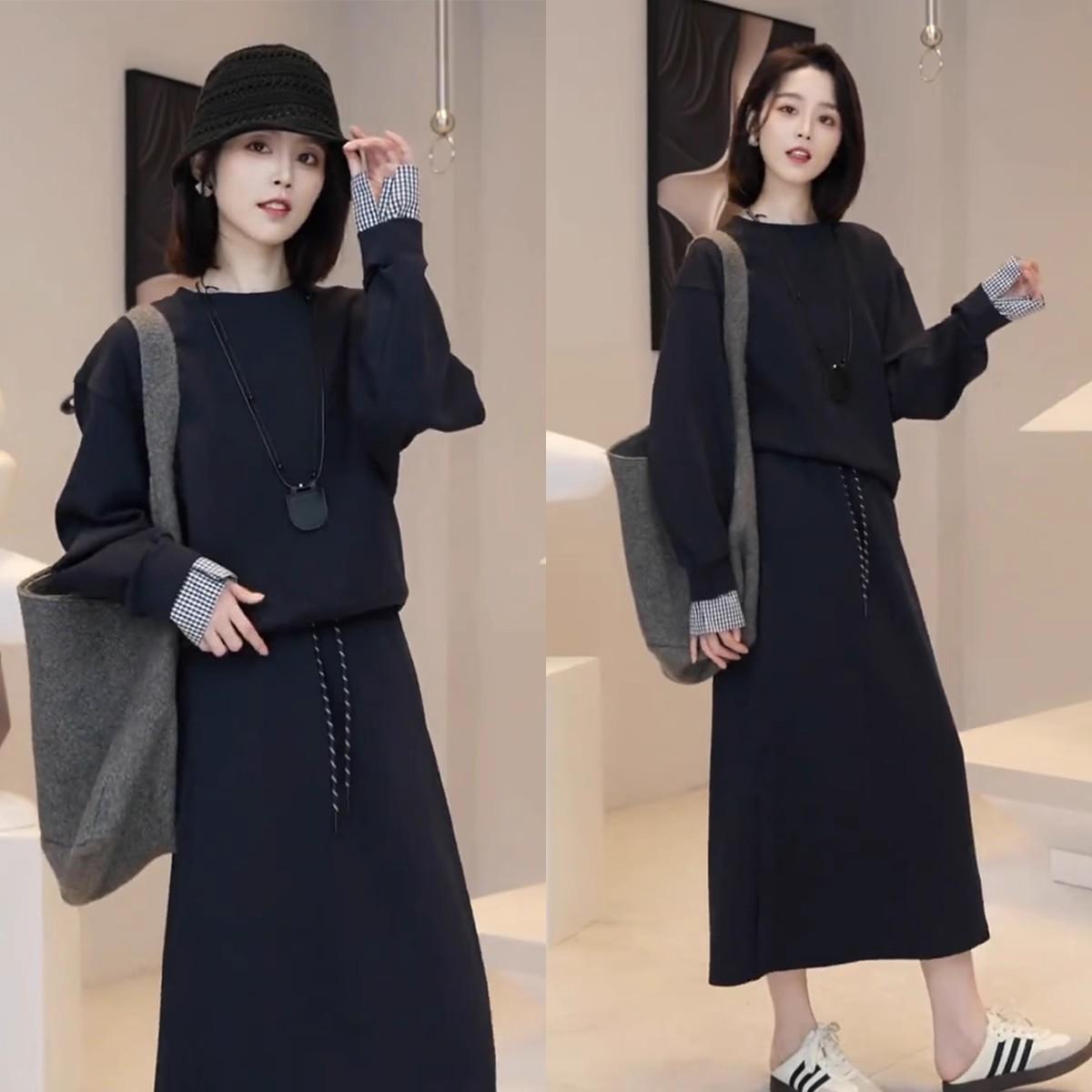 Cintura Alta Adelgazante Estilo Casual Pequeño Recién Llegado Costuras Azul Xizang Estilo Occidental Cuello Redondo Falda Línea A Conjunto de Dos Piezas para Mujer