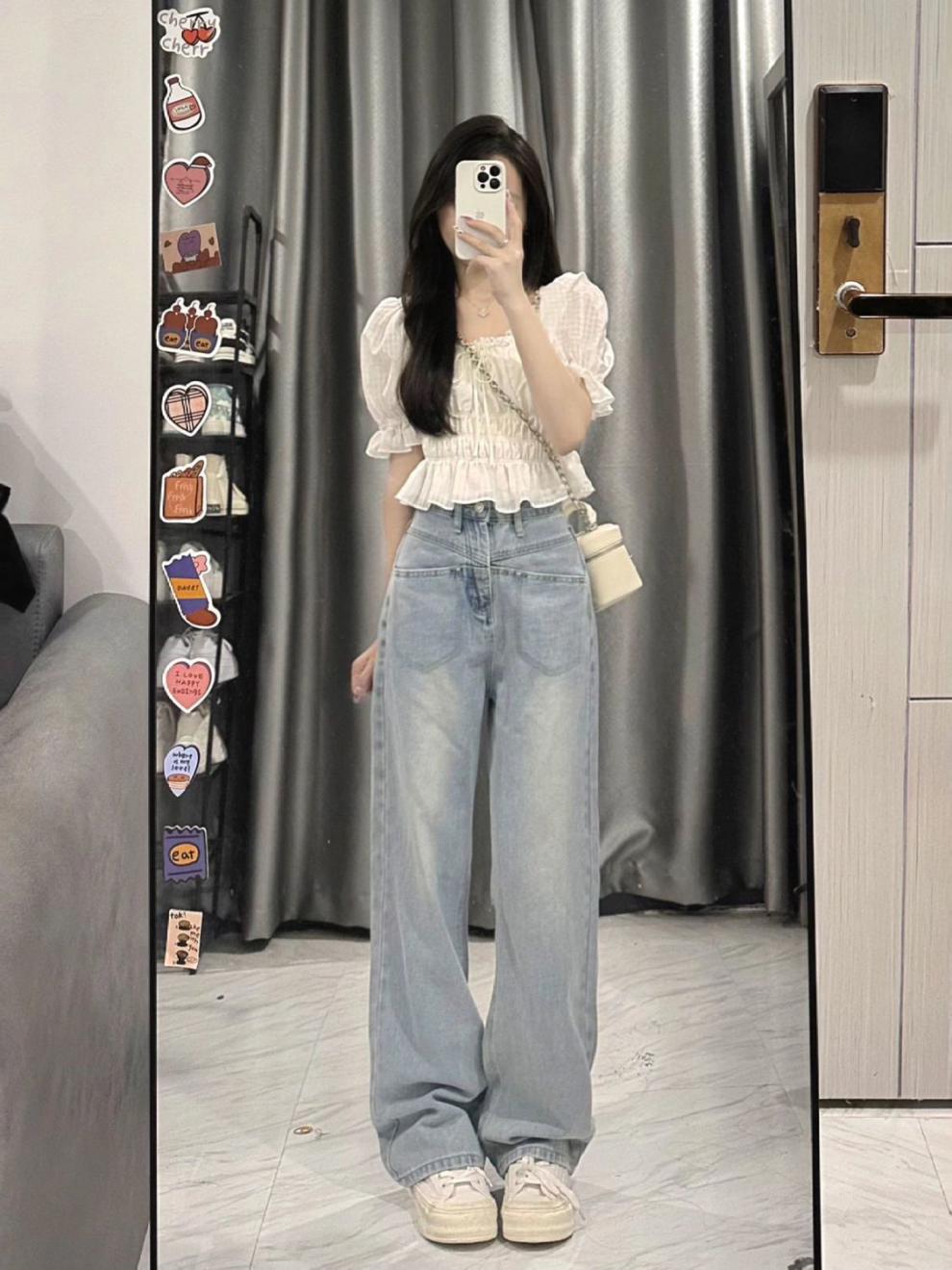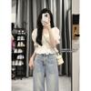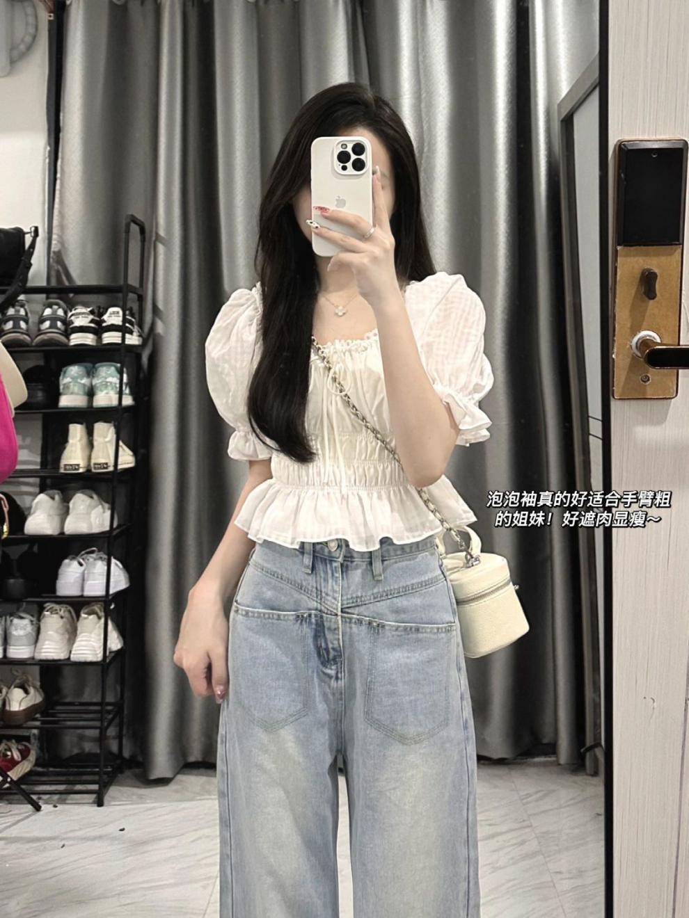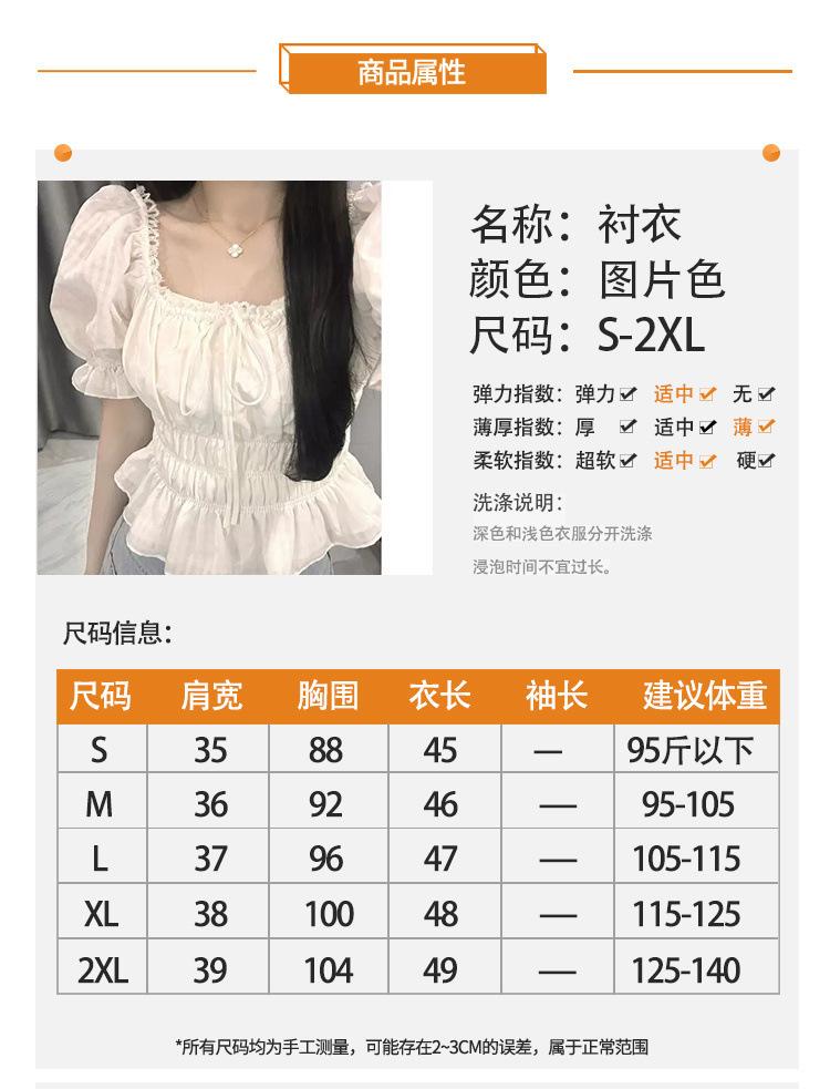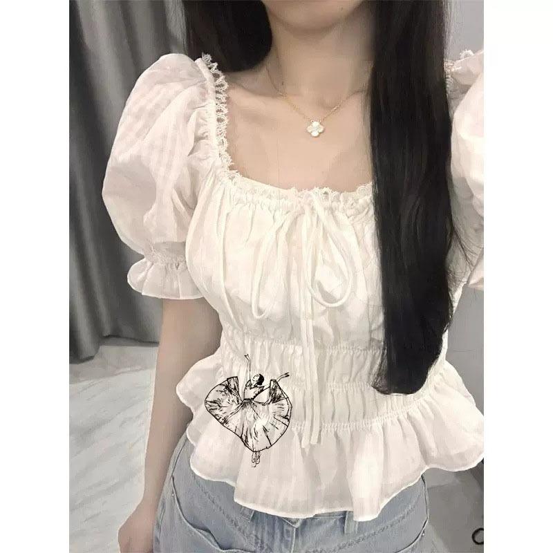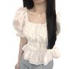 Camisa Blanca de Burbujas de Manga Corta para Mujer Verano Estilo Francés Chic Cuello Cuadrado Diseño de Cintura Plisada Top Corto Nicho