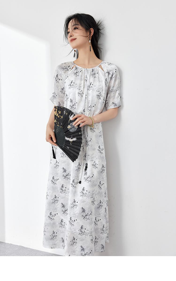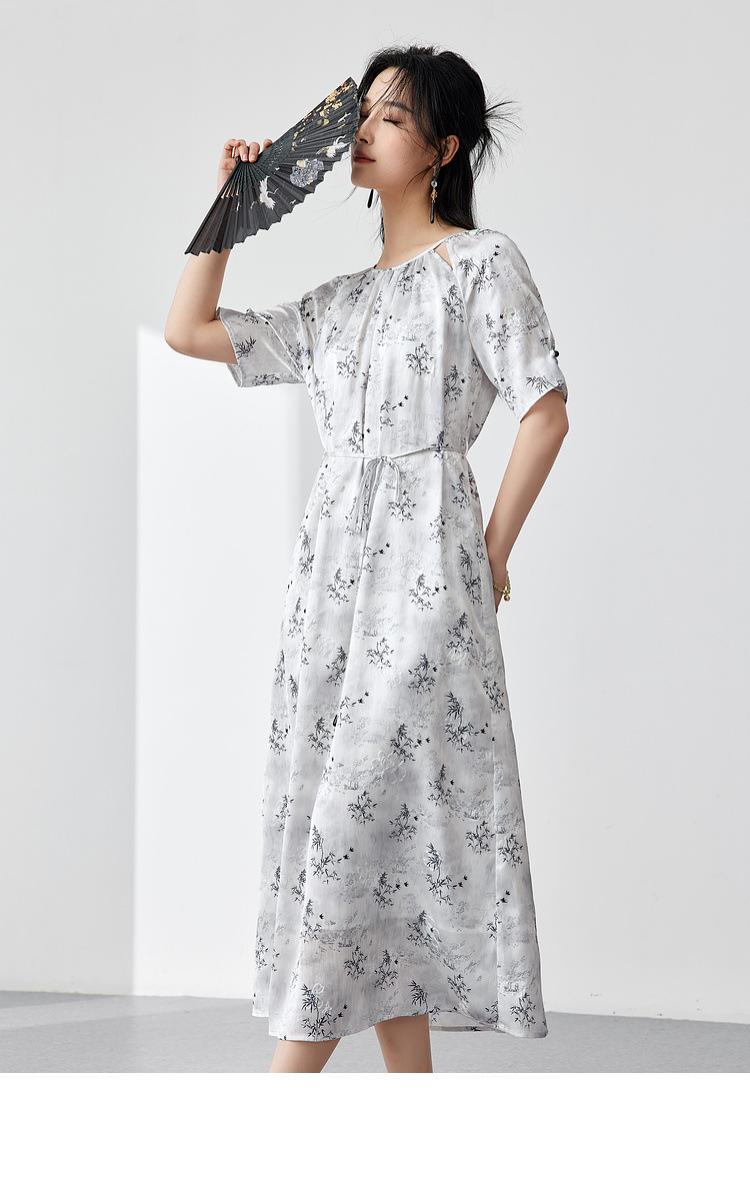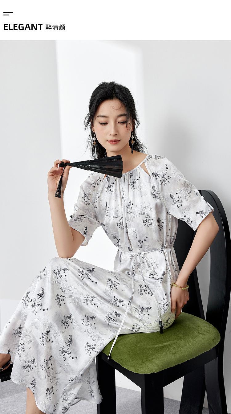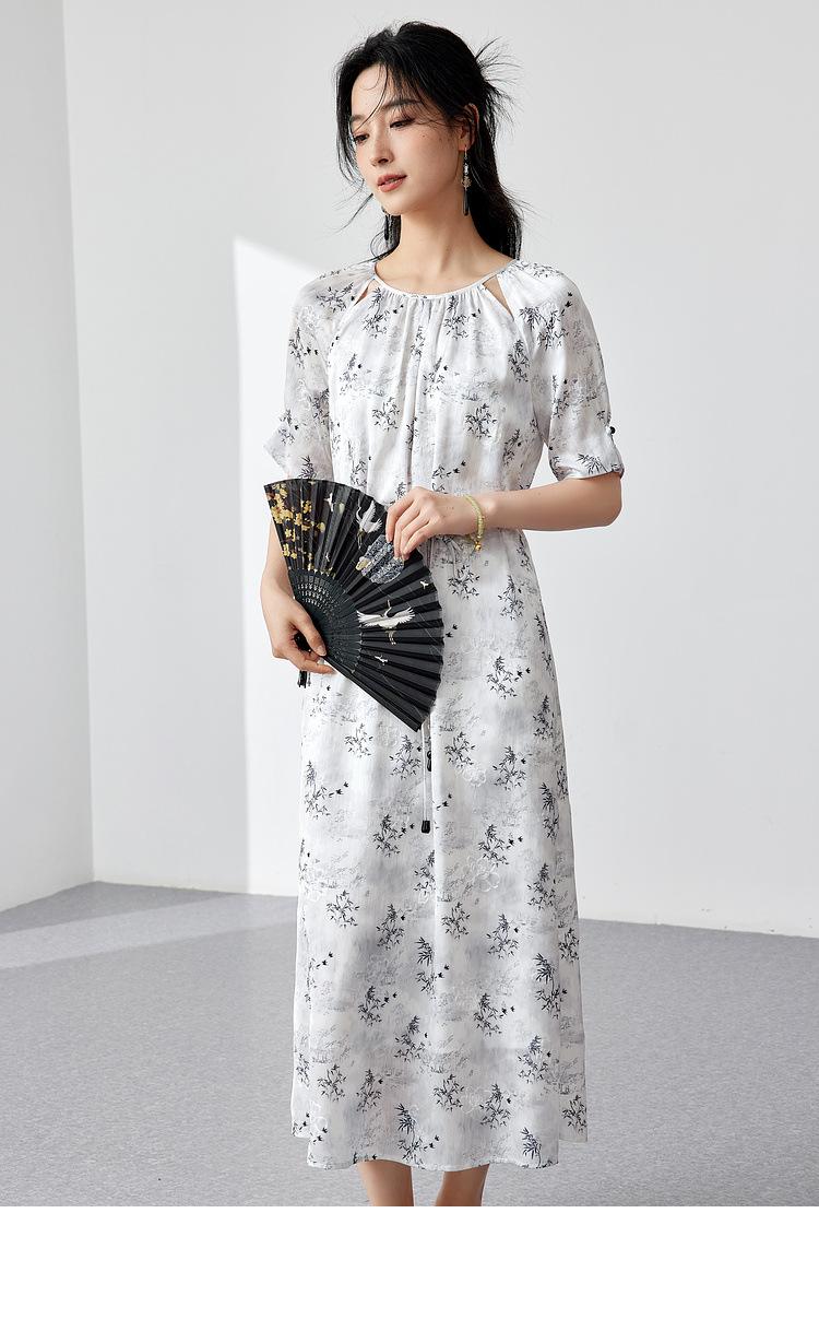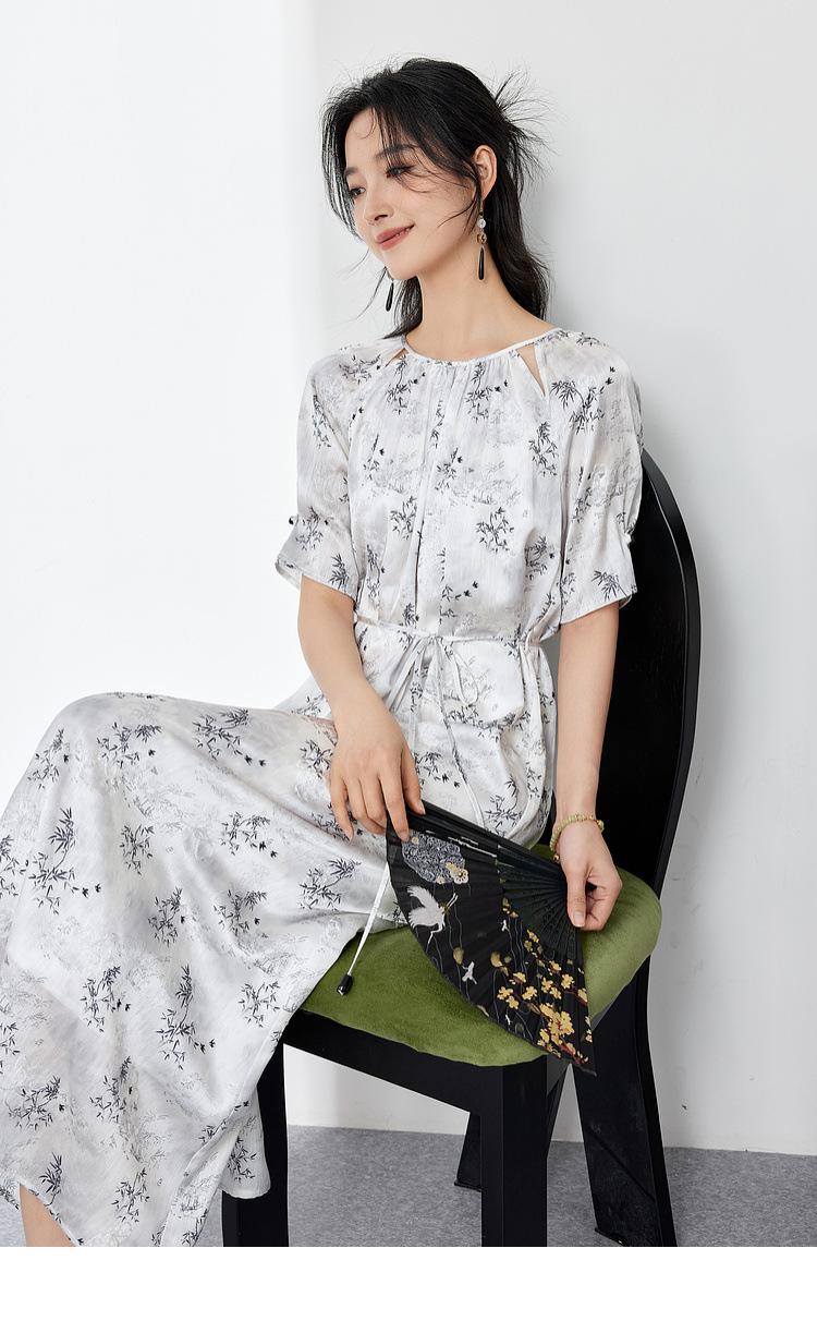 Zhen Xi - Vestido de satén con cuello redondo y manga corta para mujer, nuevo estilo chino, estampado, cintura alta, cordones, DP297