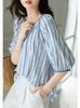 Camisa elegante de gasa con escote en V pequeño y diseño de cinta francesa, novedad de verano 2024, camisa holgada con mangas abullonadas para desplazamientos diarios.