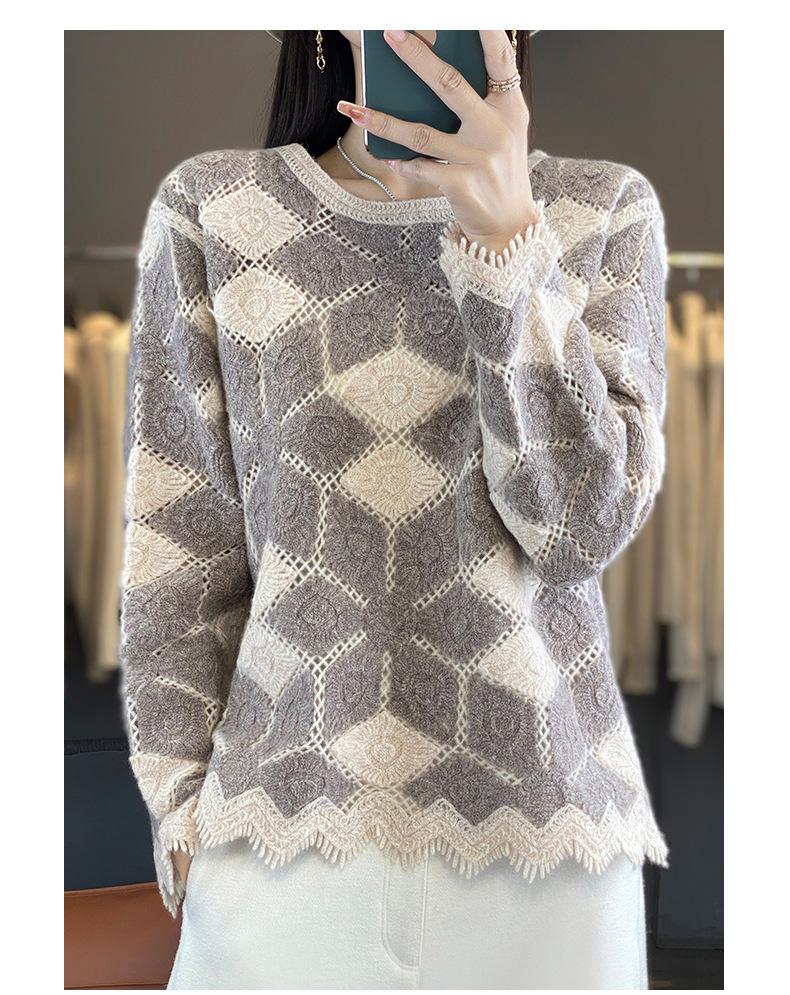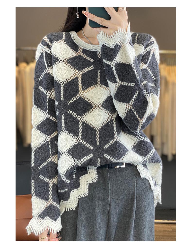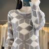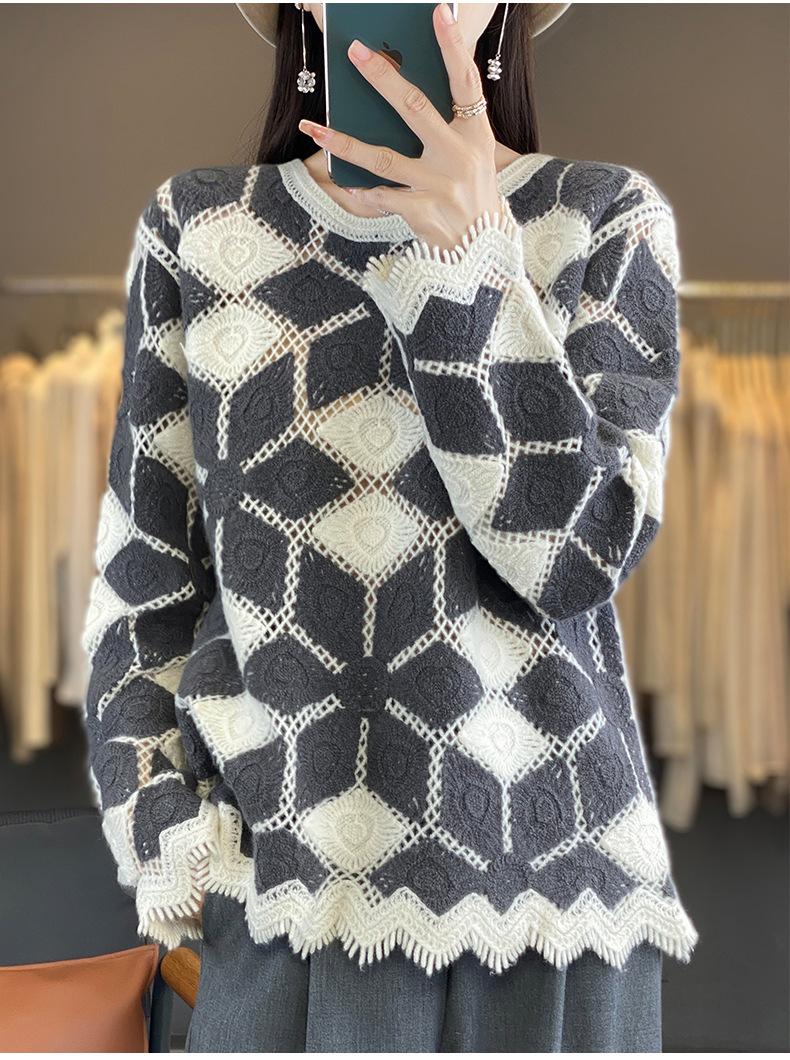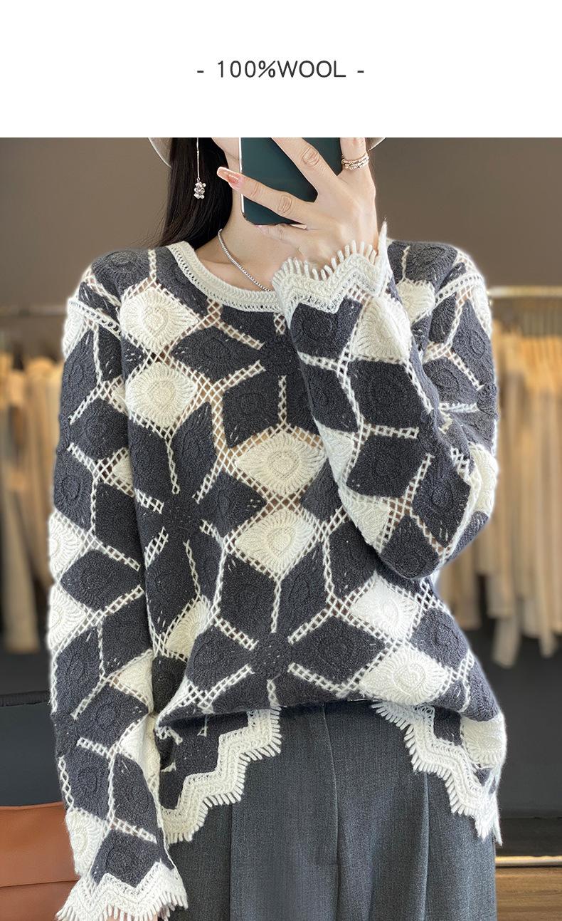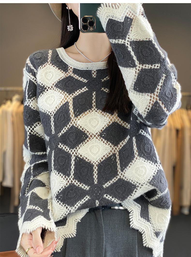 Suéter de Lana para Mujer Otoño Invierno 2025 Cuello Redondo Jacquard Combinación de Colores Corte Calado Suéter Pulóver de Moda Cachemira Suéter Base