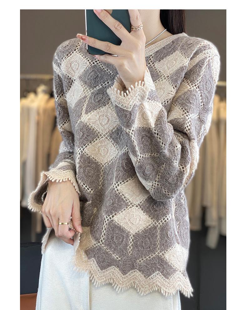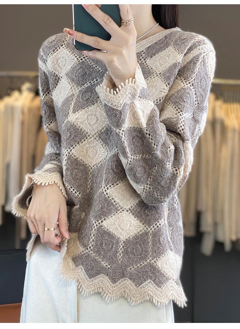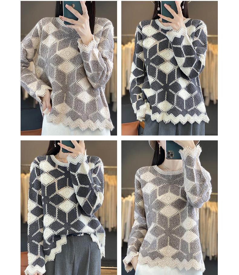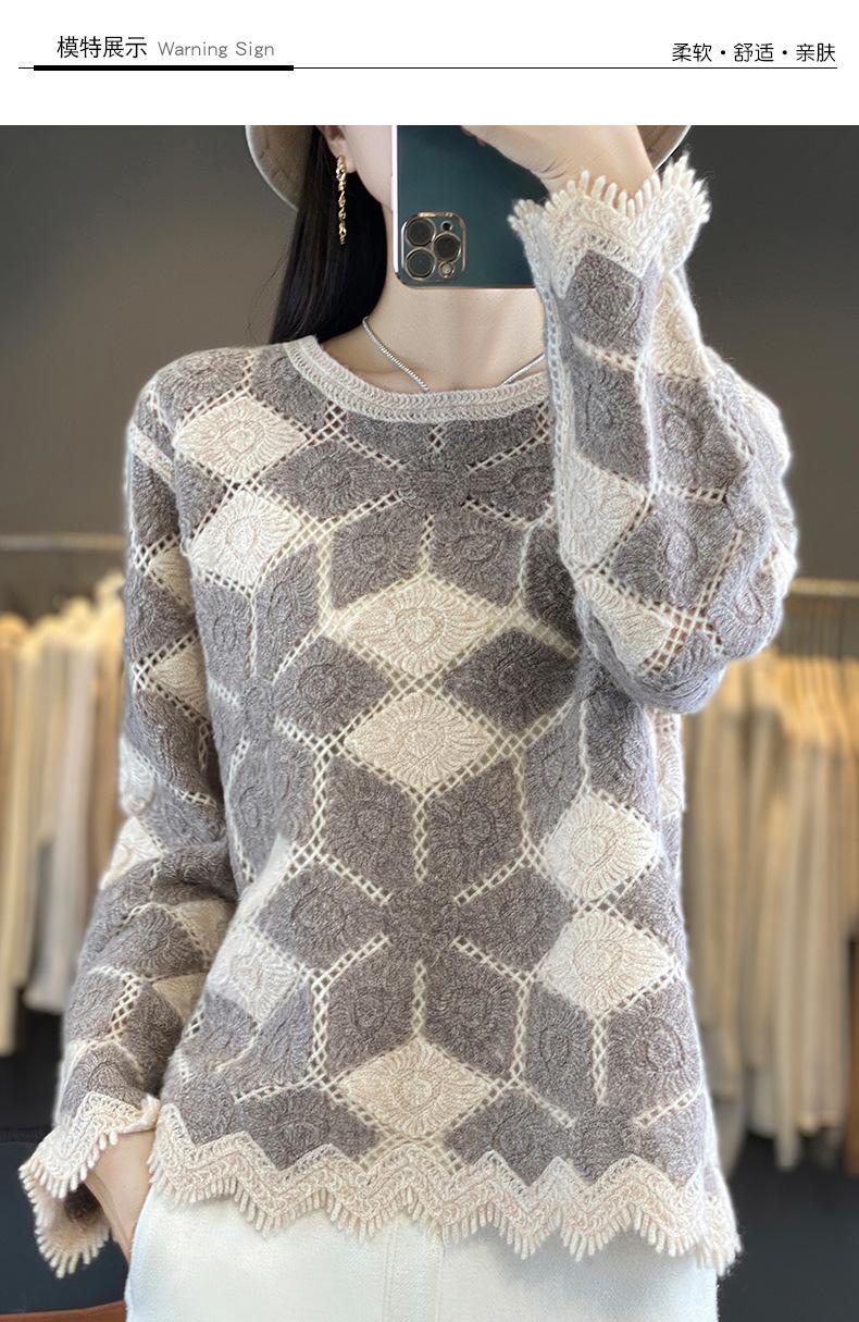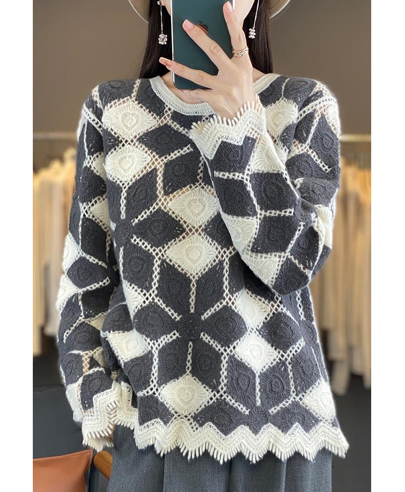 Suéter de Lana para Mujer Otoño Invierno 2025 Cuello Redondo Jacquard Combinación de Colores Corte Calado Suéter Pulóver de Moda Cachemira Suéter Base