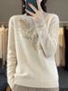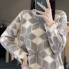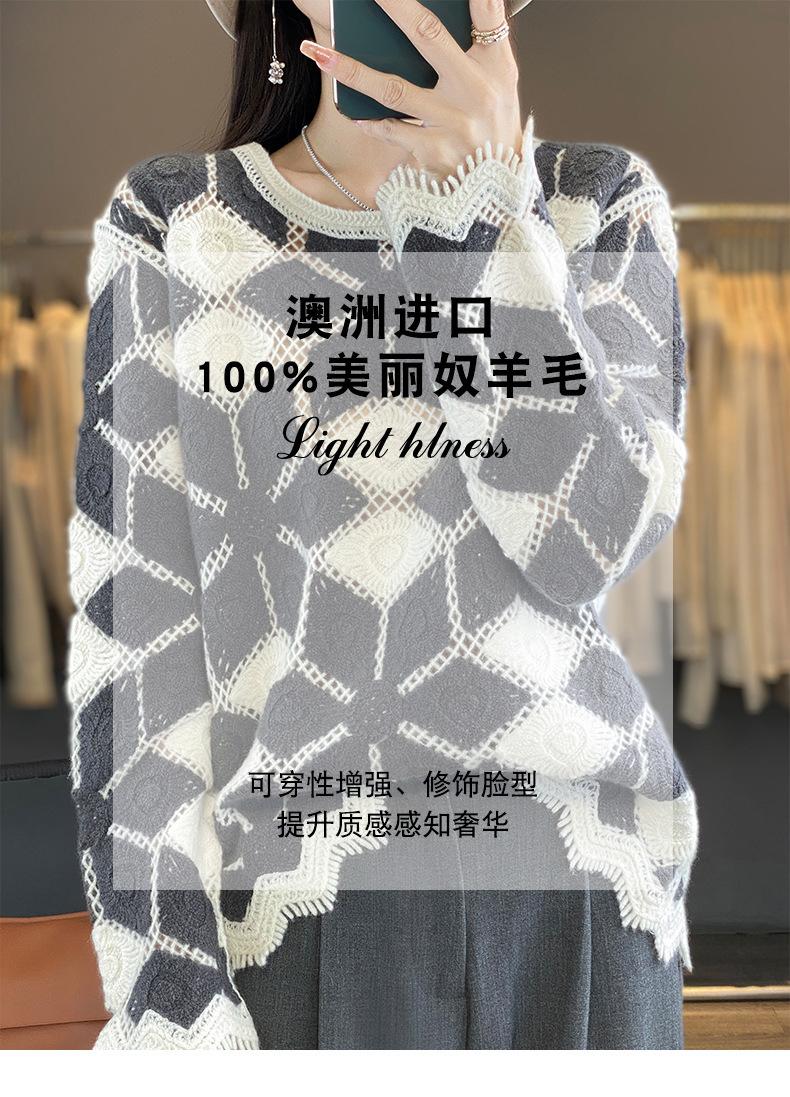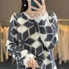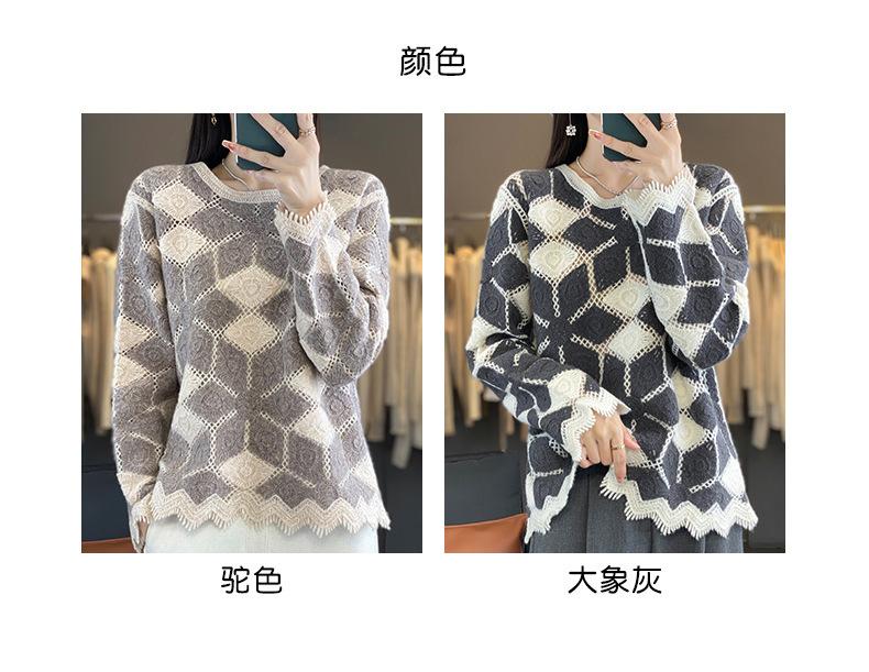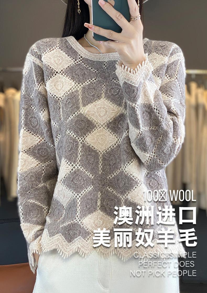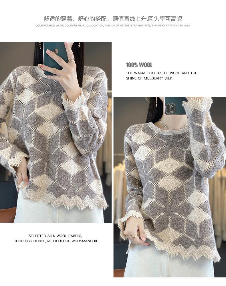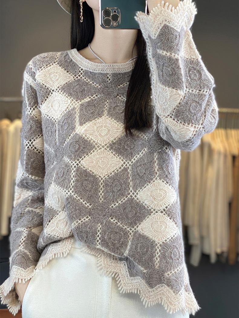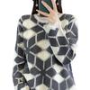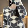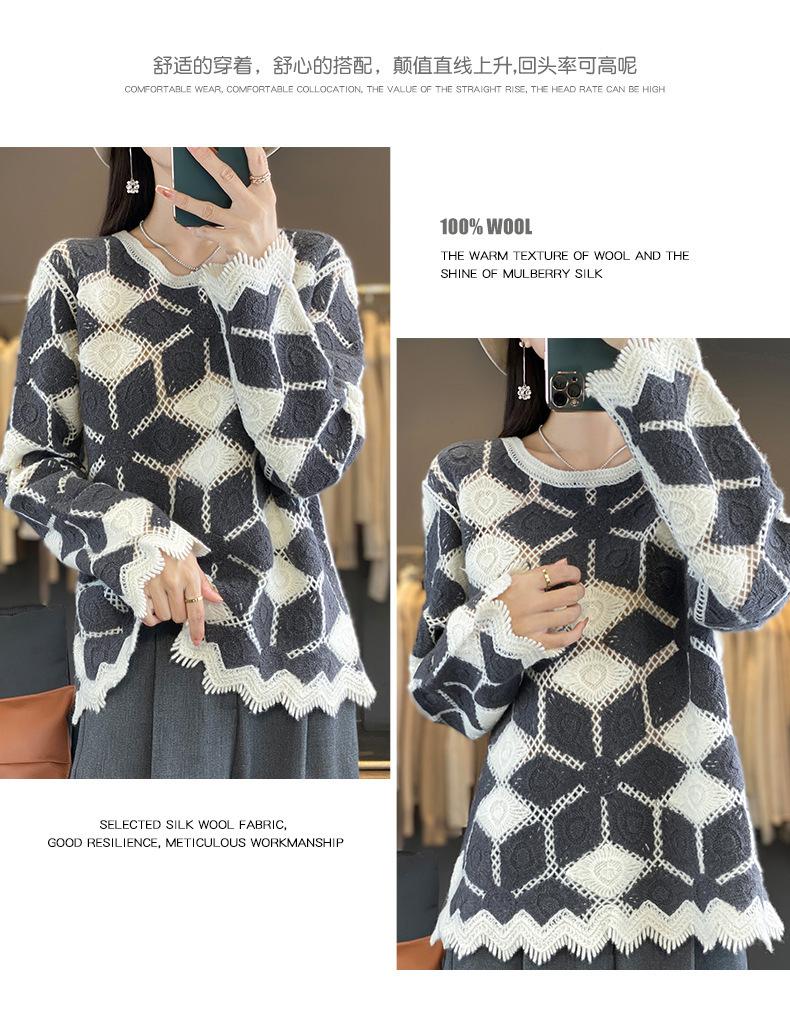 Suéter de Lana para Mujer Otoño Invierno 2025 Cuello Redondo Jacquard Combinación de Colores Corte Calado Suéter Pulóver de Moda Cachemira Suéter Base