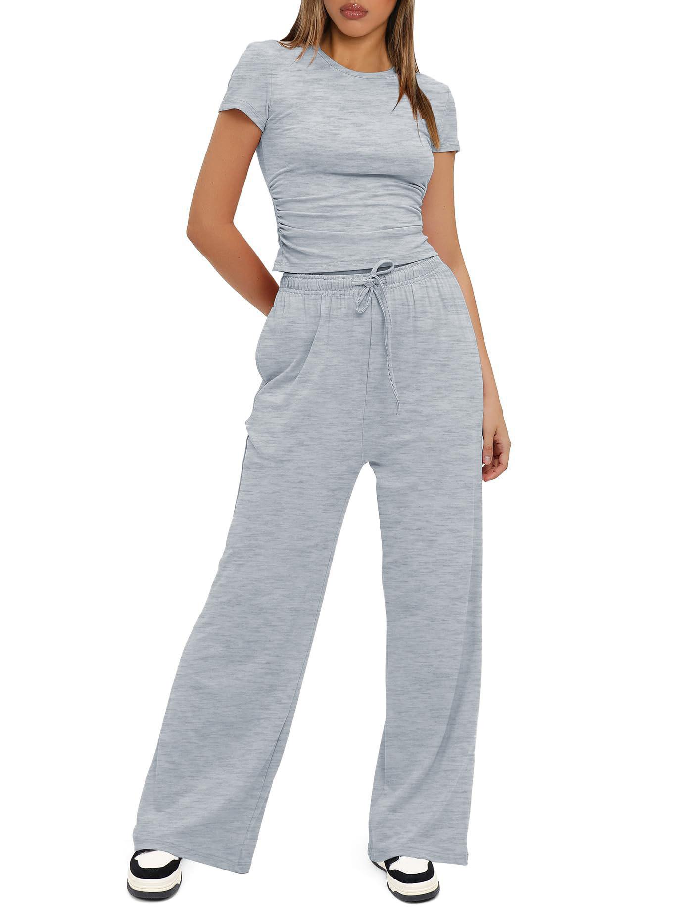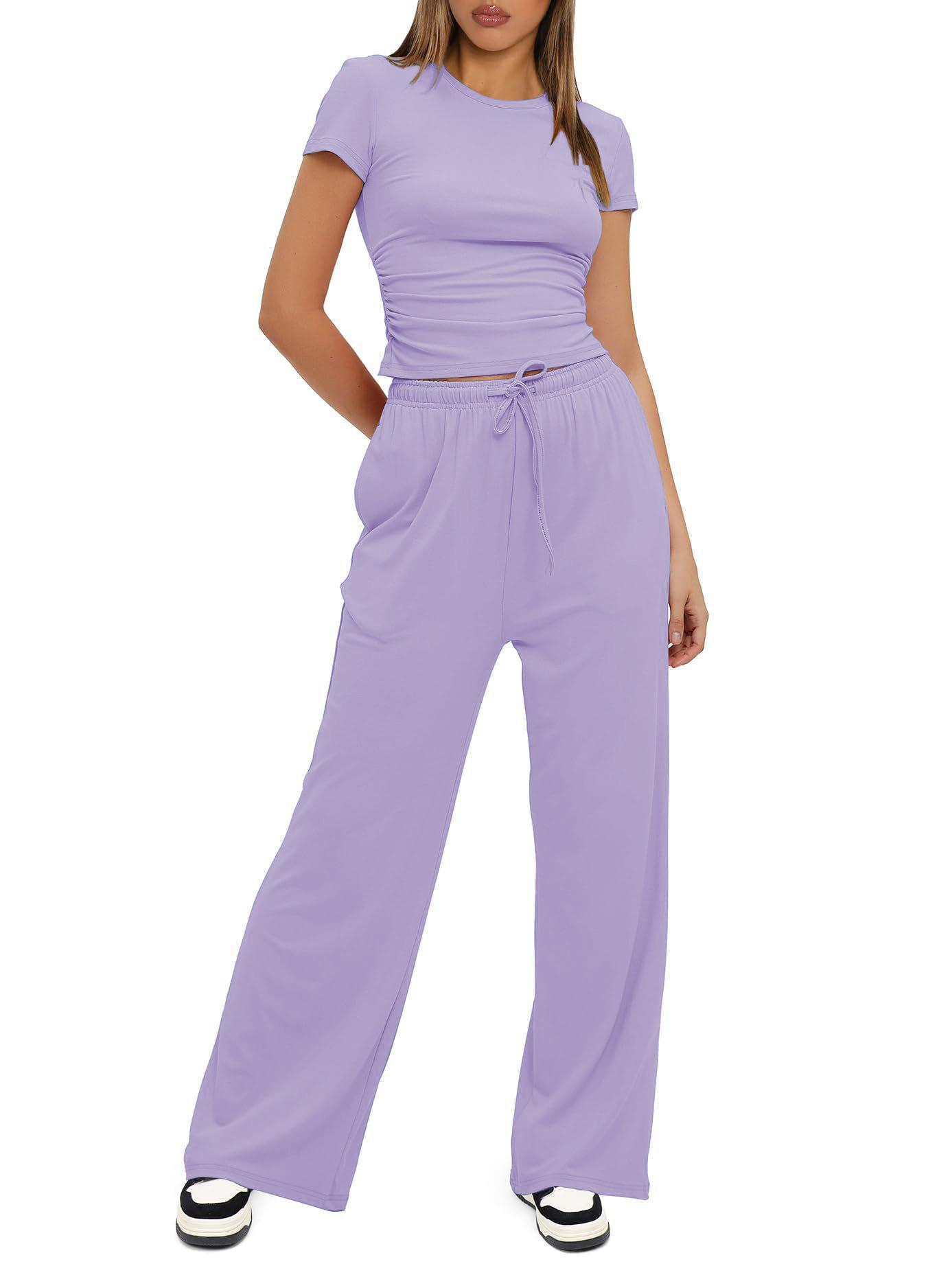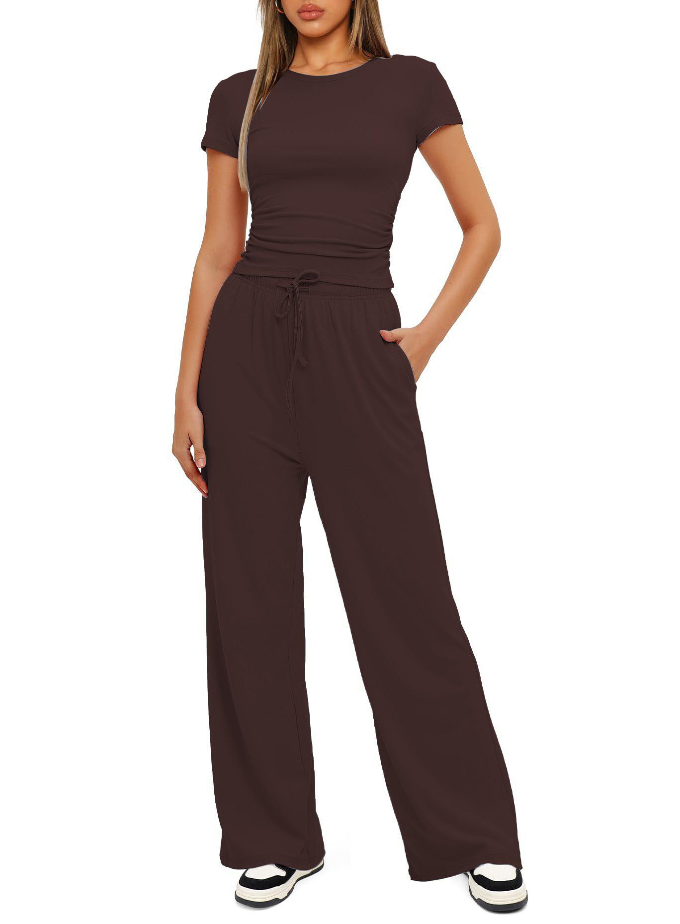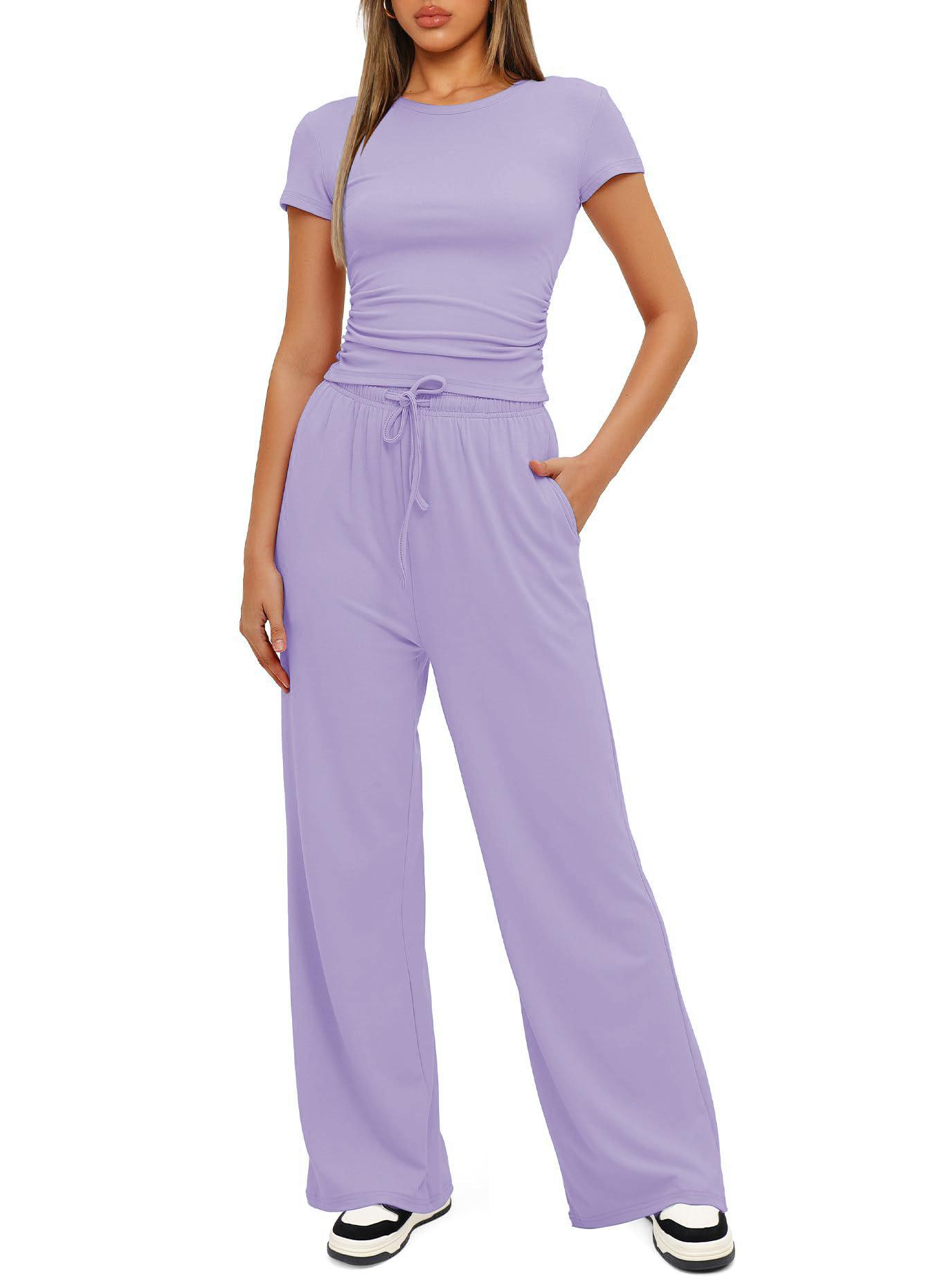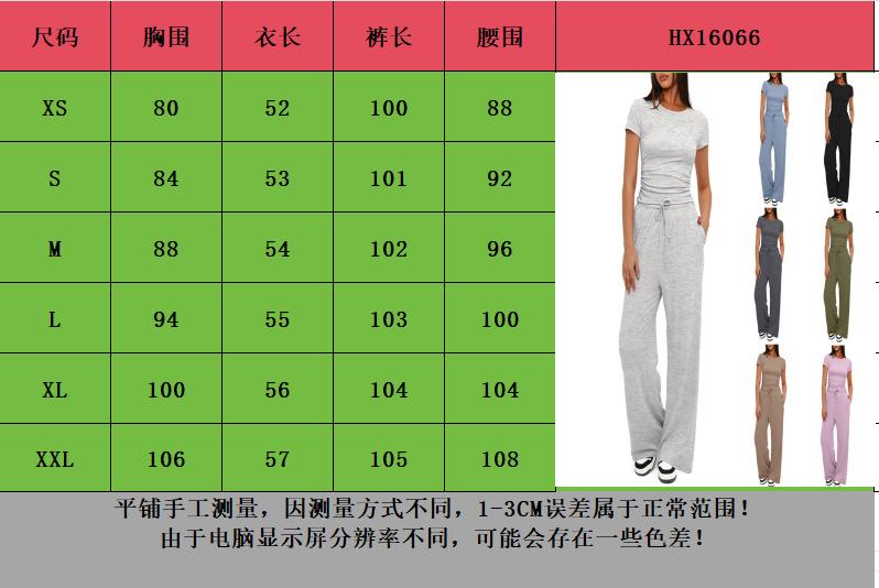 Traje casual plisado 2024 europeo y americano Amazon nuevo color sólido manga corta top cintura alta pantalones anchos ropa deportiva