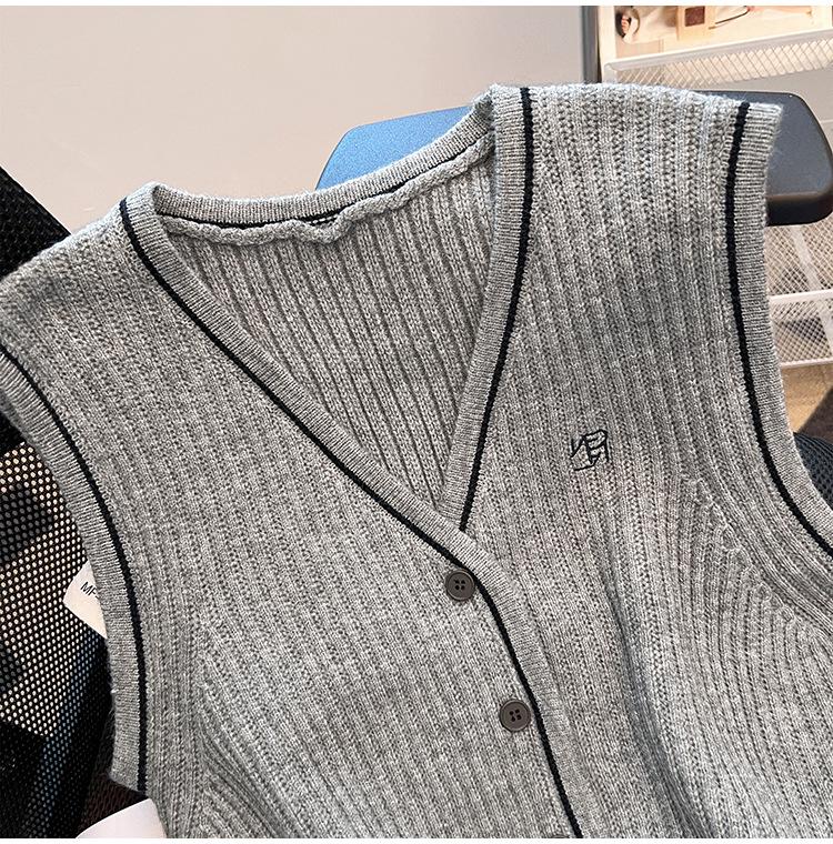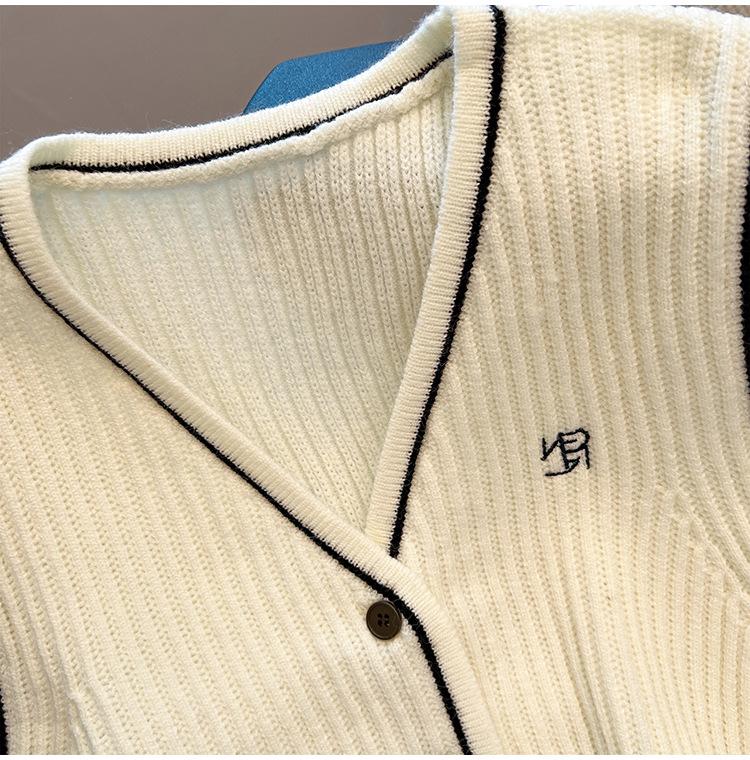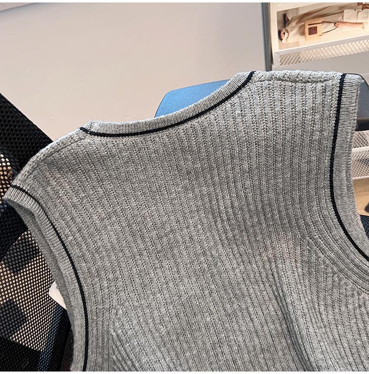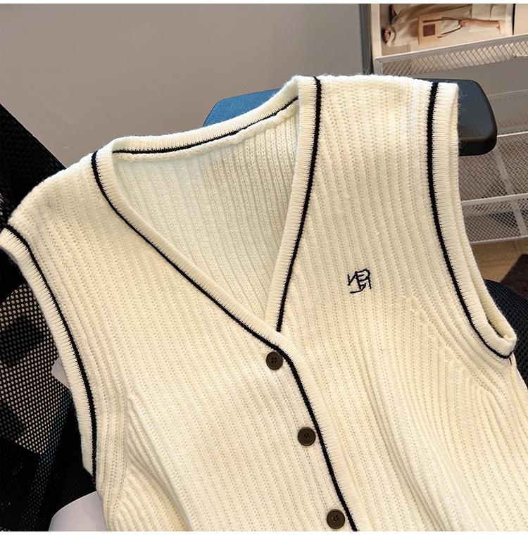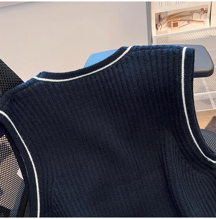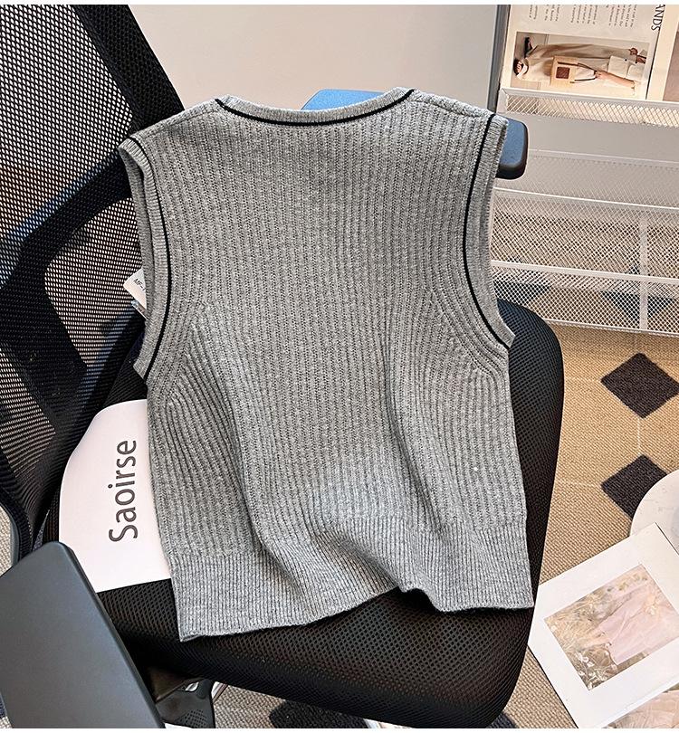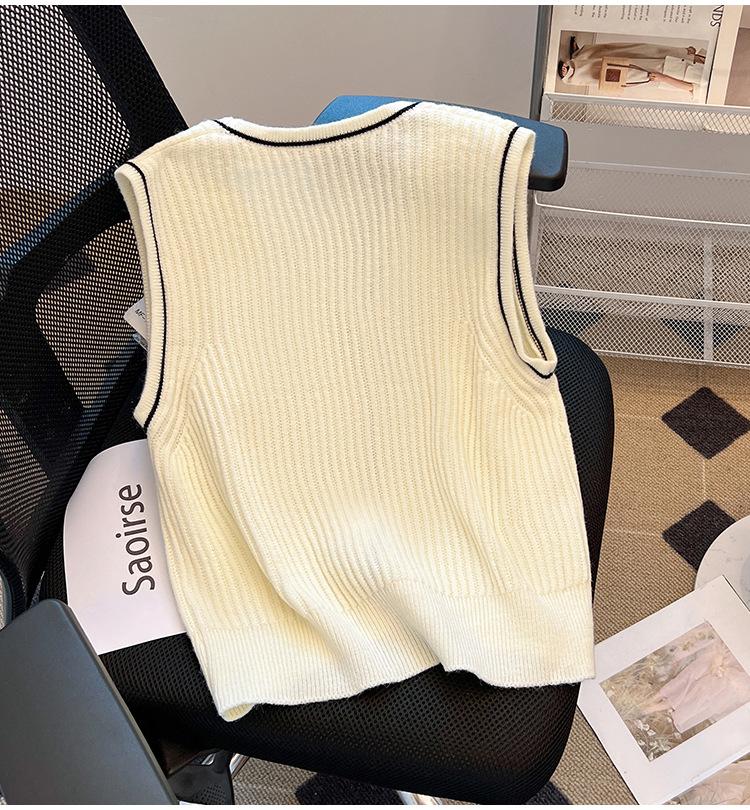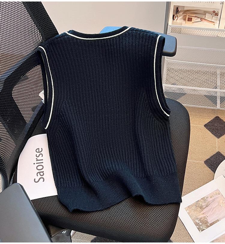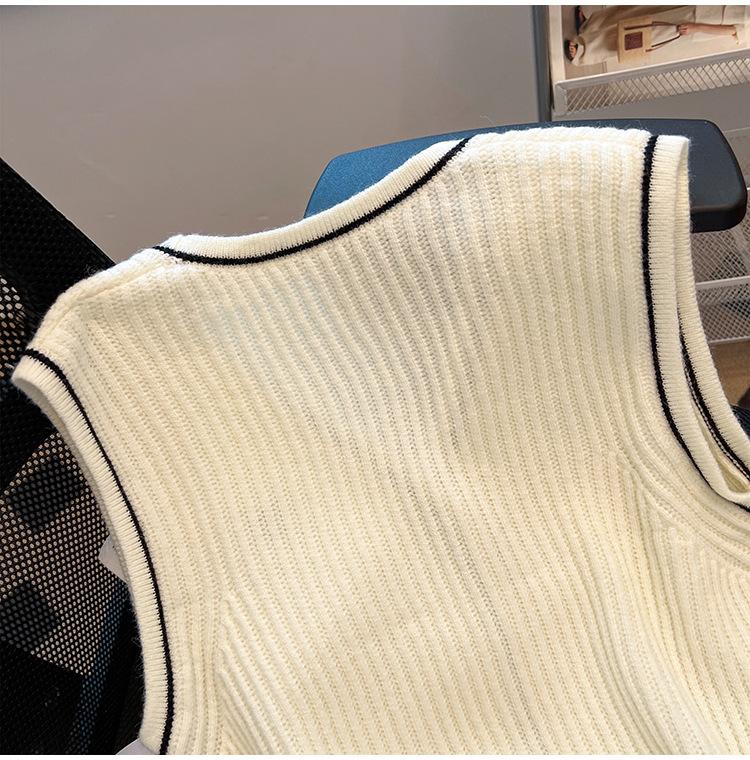 Chaleco de Punto de Color en Contraste Estilo Universitario para Mujer Otoño 2024 Estilo Cuello en V Apilado Combinable Sin Mangas Ropa Exterior Top Corto