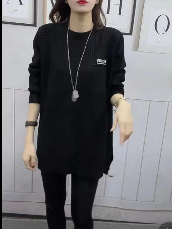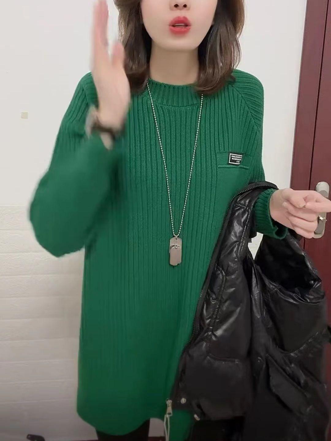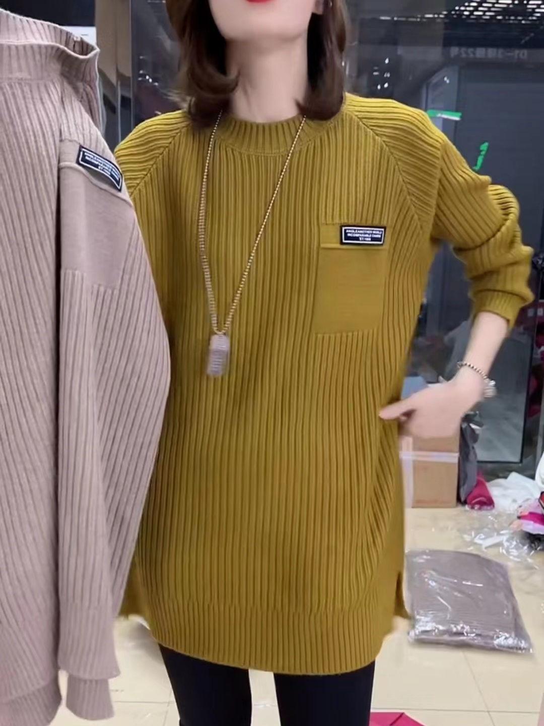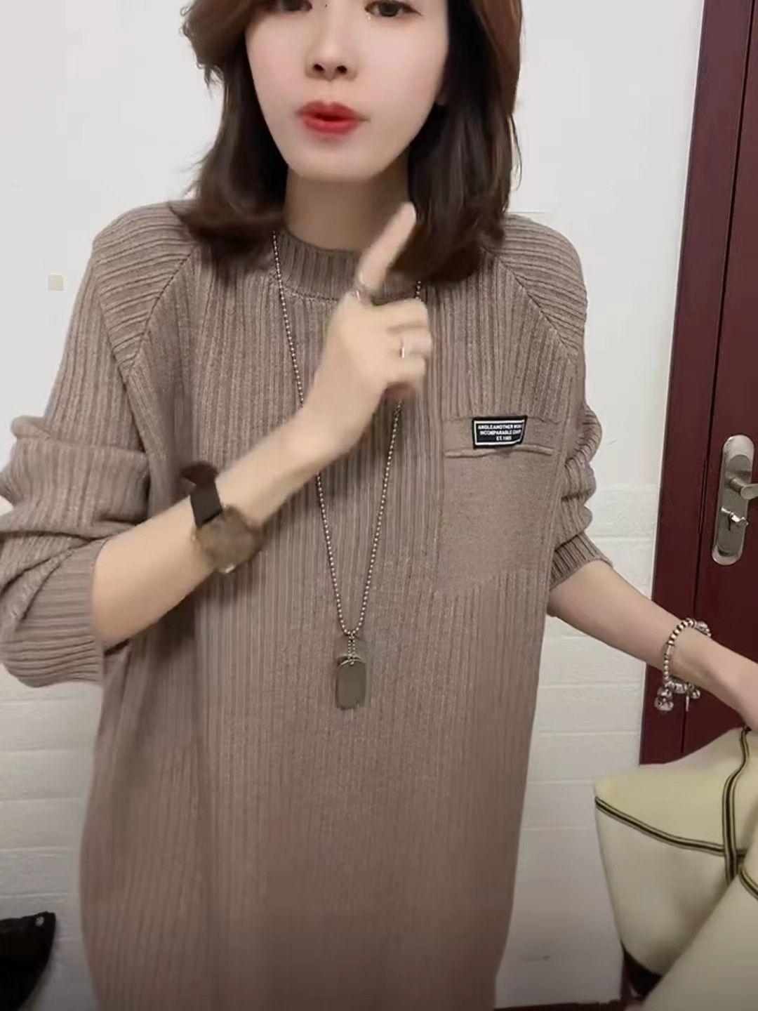 Suéter de cuello redondo de talla grande para mujer, camisa de punto holgada de longitud media para uso exterior, cálida, para otoño e invierno.