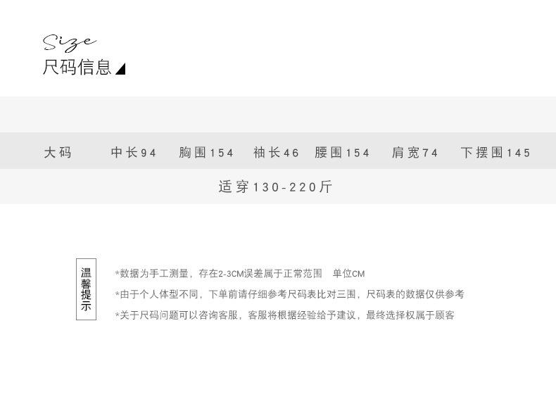 Debido a los diferentes métodos de medición manual, puede haber un margen de error de 1-3 cm. Talla grande: Largo medio: 94 cm; Busto: 154 cm; Largo de manga: 46 cm; Cintura: 154 cm; Ancho de hombros: 74 cm; Dobladillo: 145 cm.