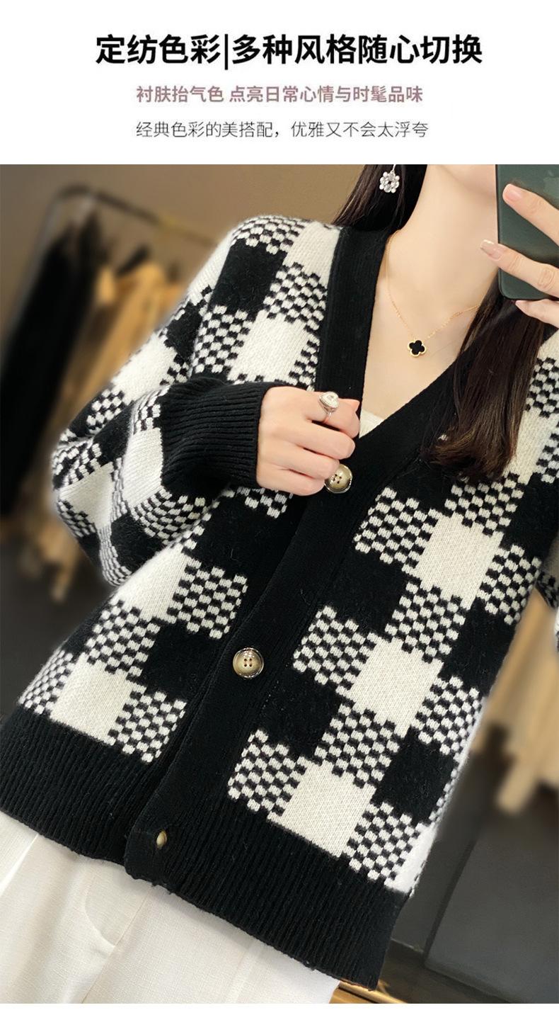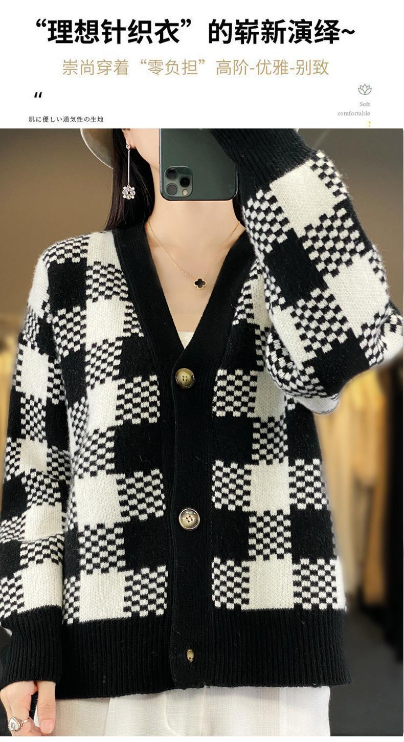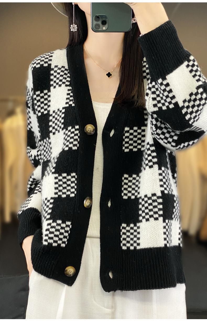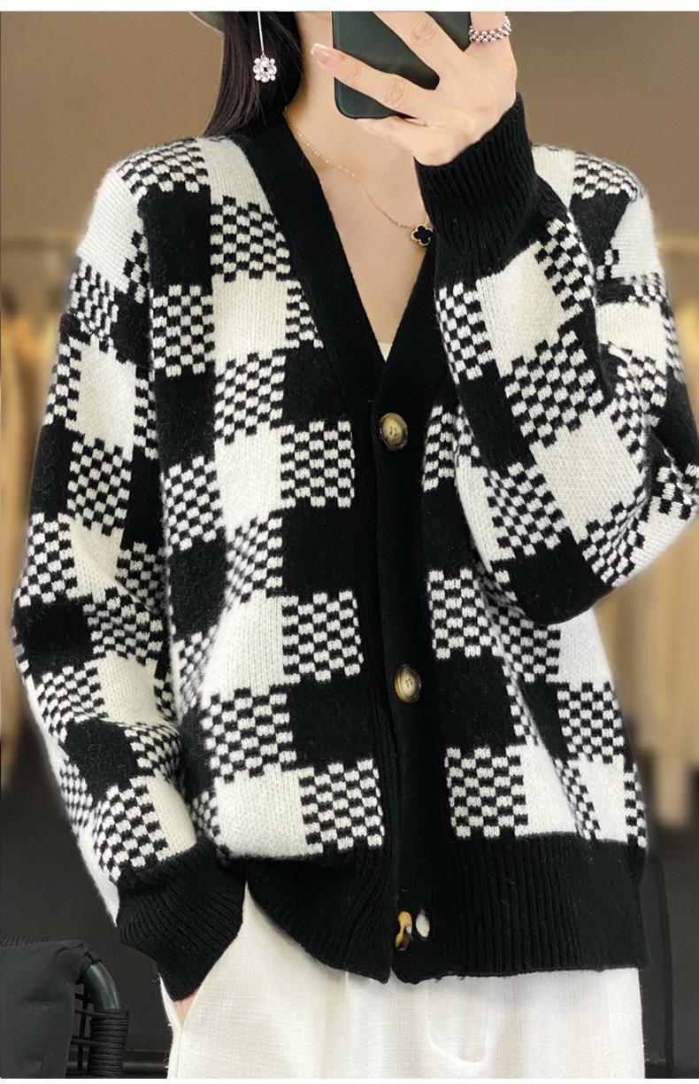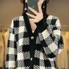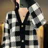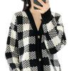 Suéter de punto a cuadros en blanco y negro con contraste elegante para otoño e invierno, chaqueta holgada para mujer, prenda exterior informal para mujer