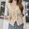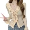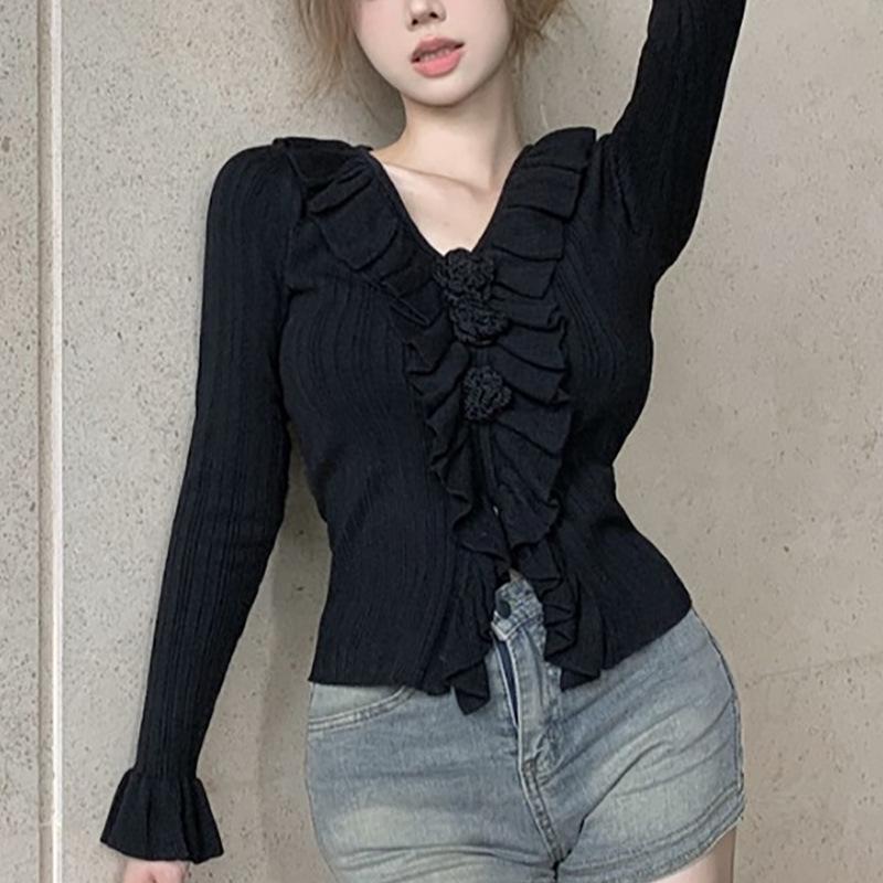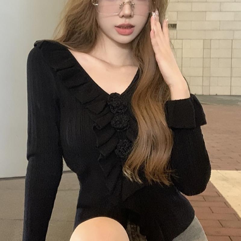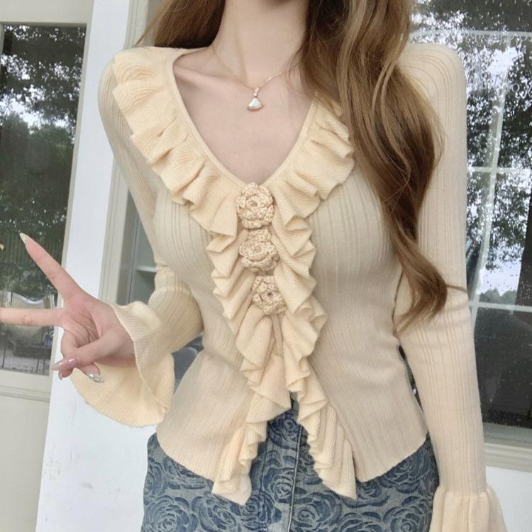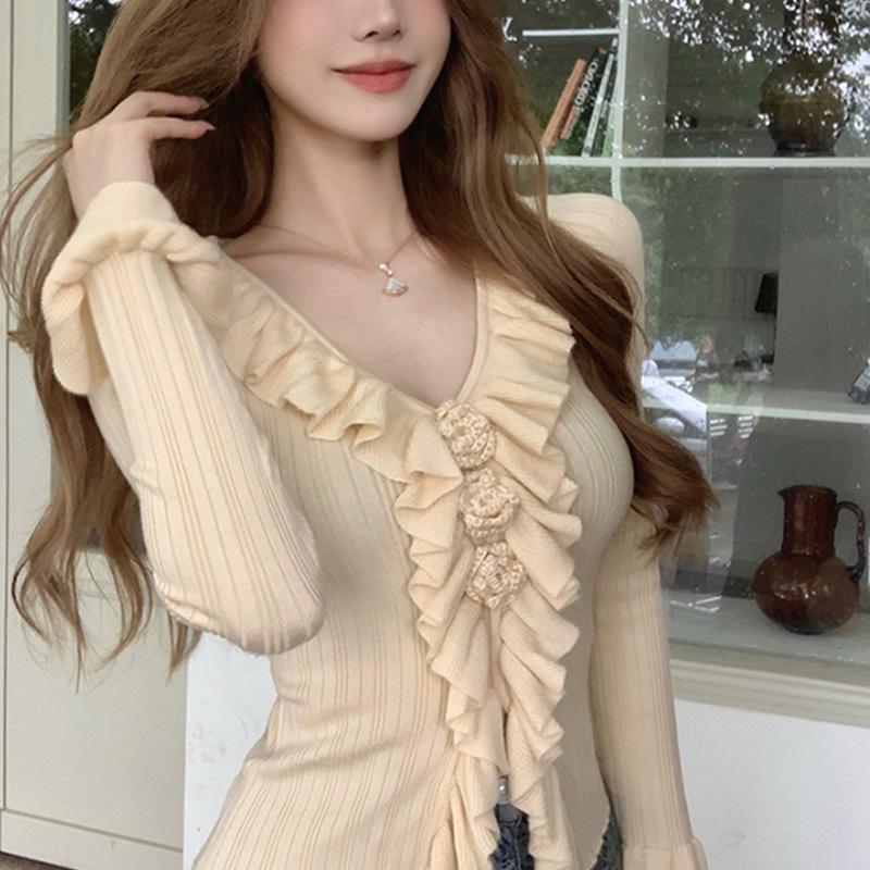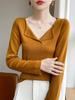 Camisa de punto ajustada con cuello en V y orejas de madera, diseño chic de nicho, manga larga, interior, primavera y otoño