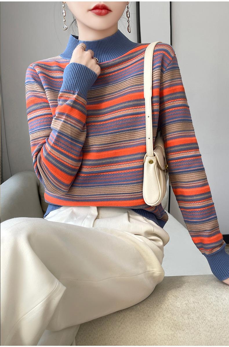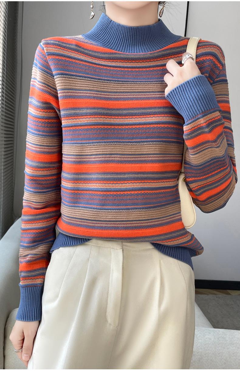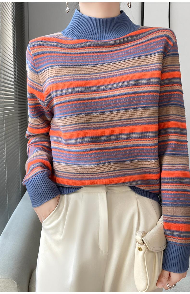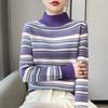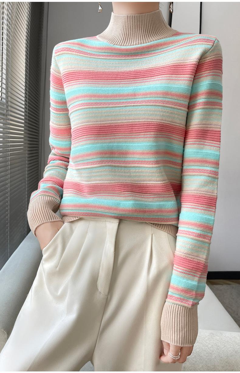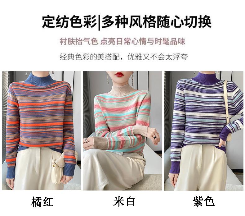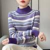 Suéter de Punto de Lana Nueva de Otoño e Invierno con Rayas de Color para Mujer, Base de Cuello Alto, Estilo Étnico para Mujer, Top Grueso para Mujer