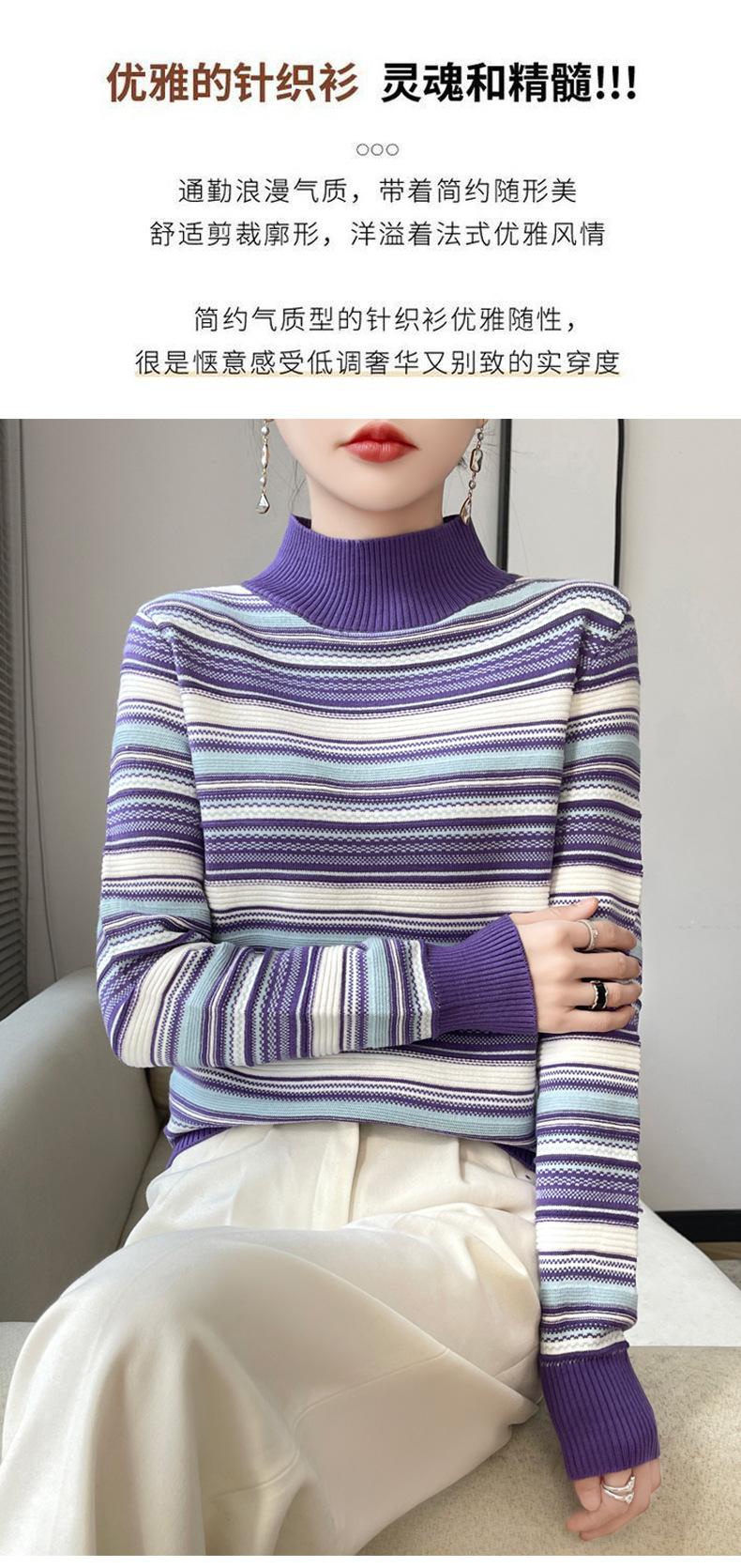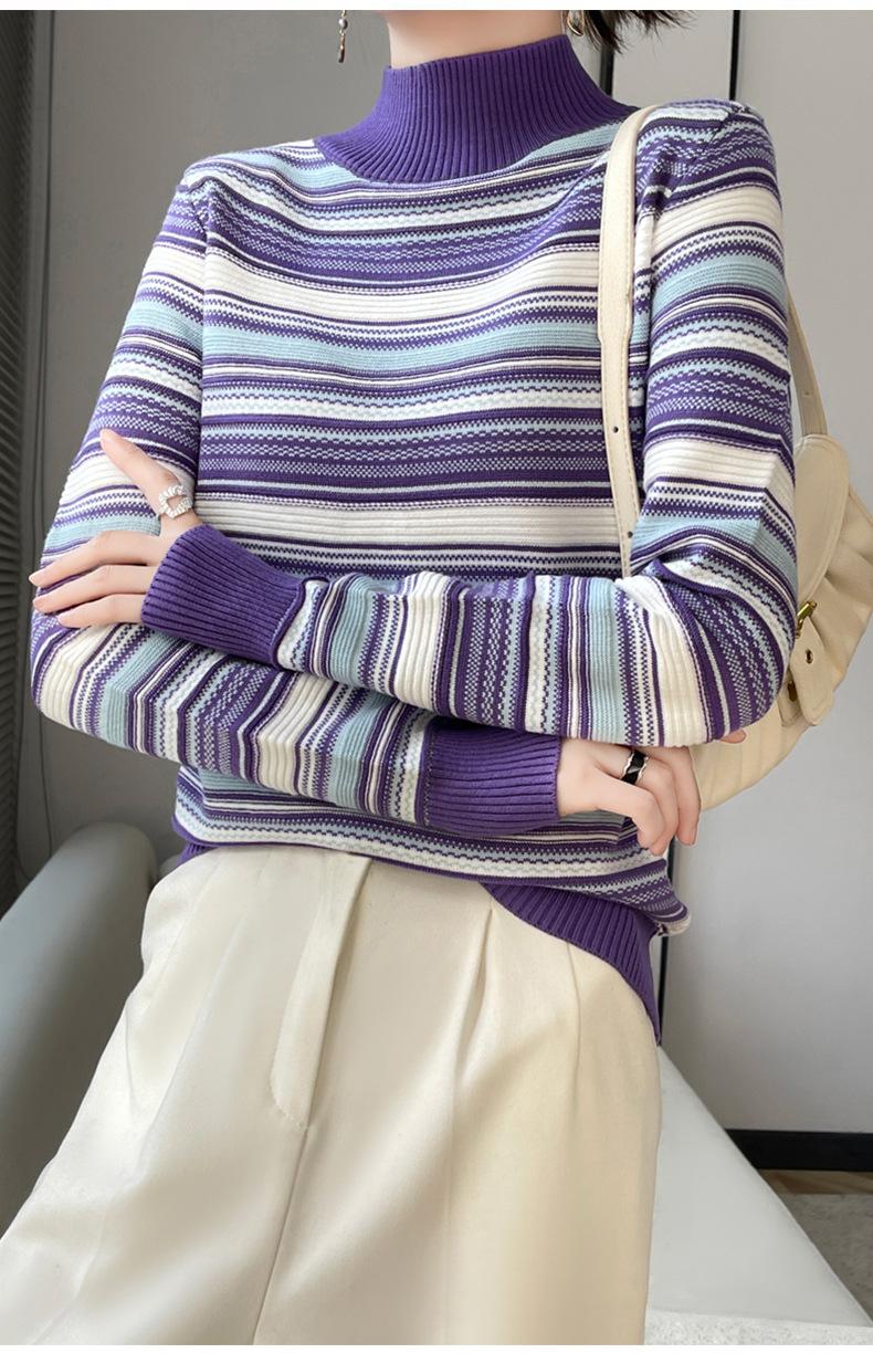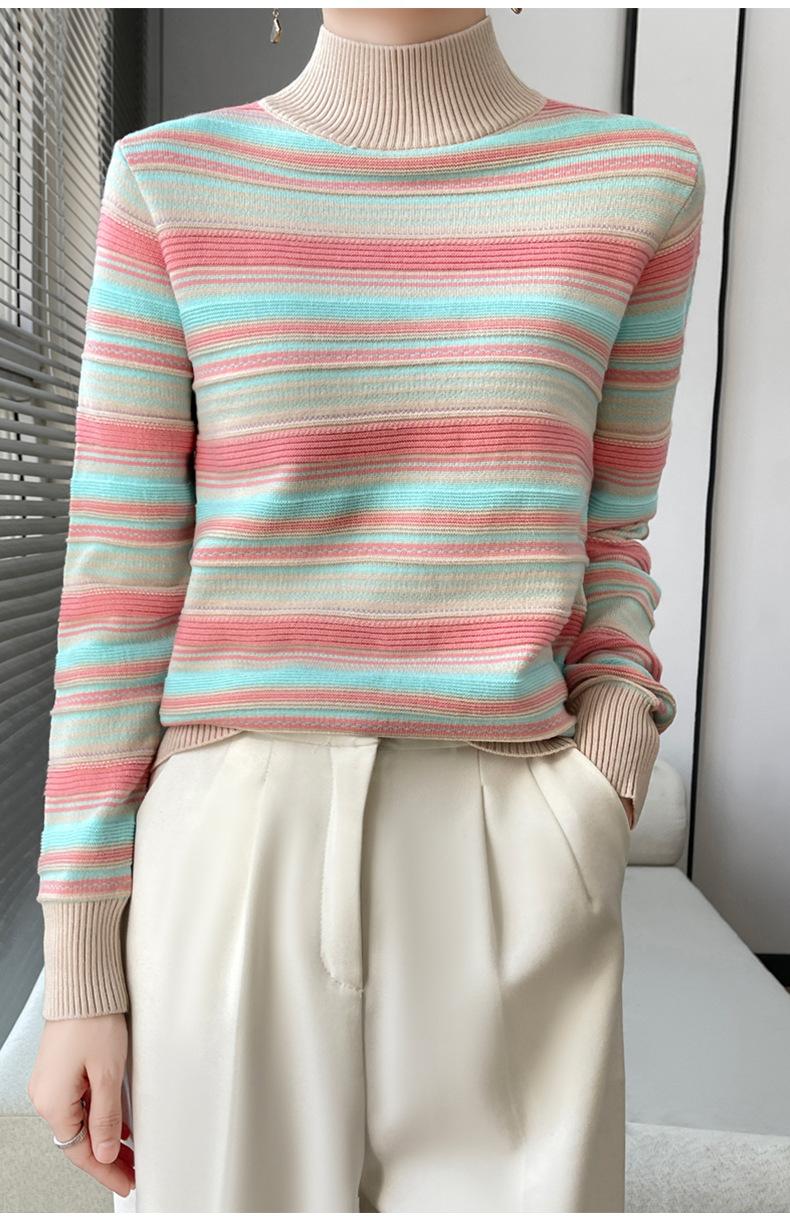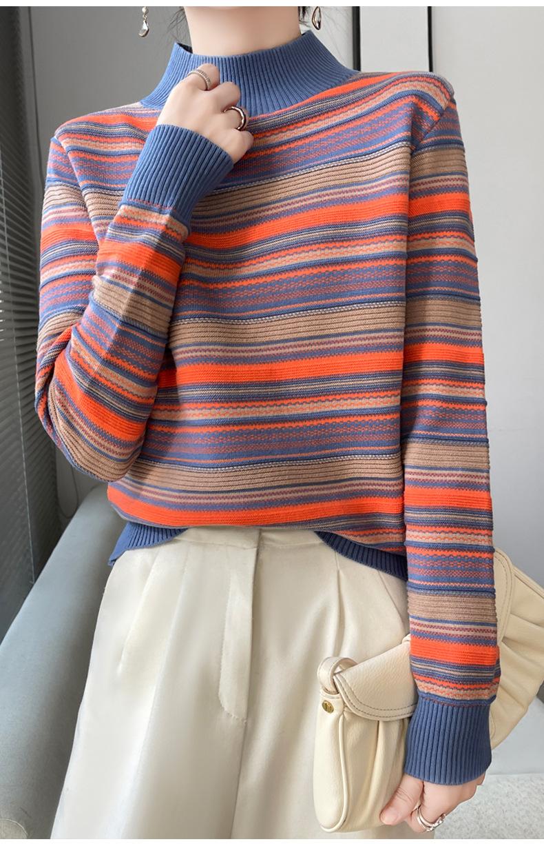 Suéter de Punto de Lana Nueva de Otoño e Invierno con Rayas de Color para Mujer, Base de Cuello Alto, Estilo Étnico para Mujer, Top Grueso para Mujer