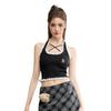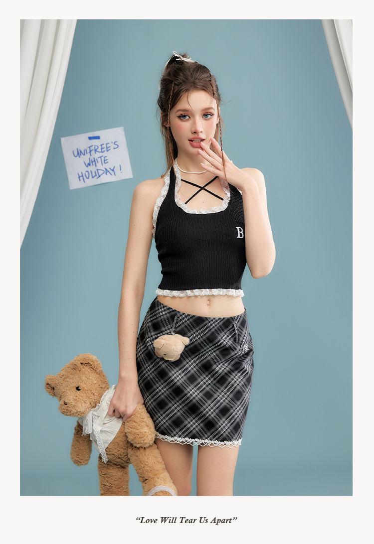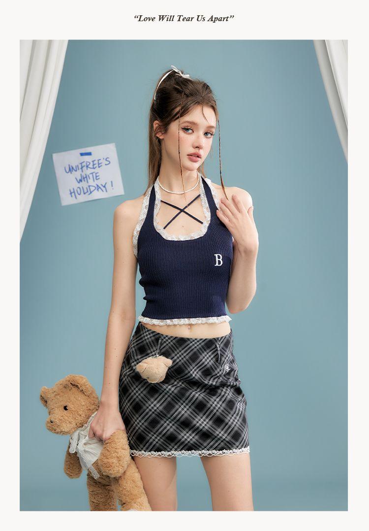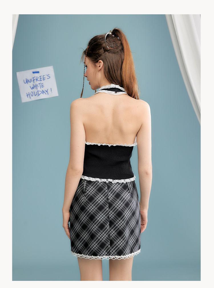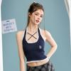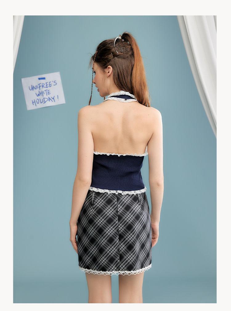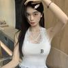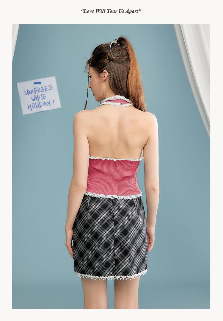 Camisola de verano para chica sexy, estilo nuevo, prenda exterior, dulce, sexy, sin espalda, corta, sin mangas, de punto, con encaje, costuras ajustadas.