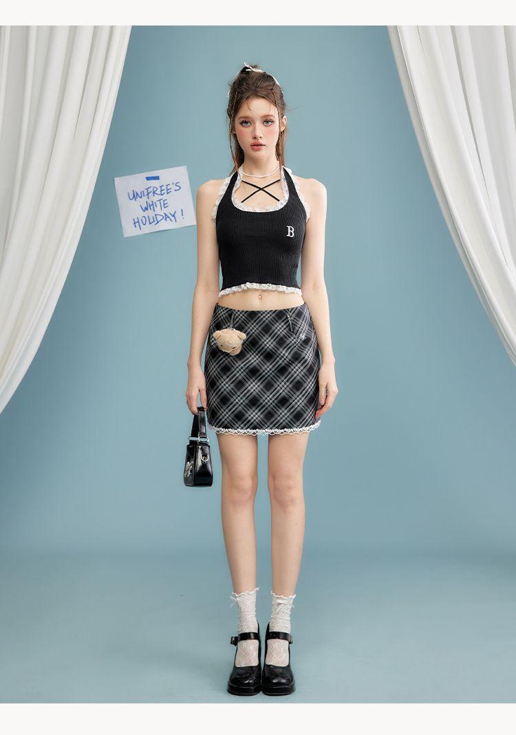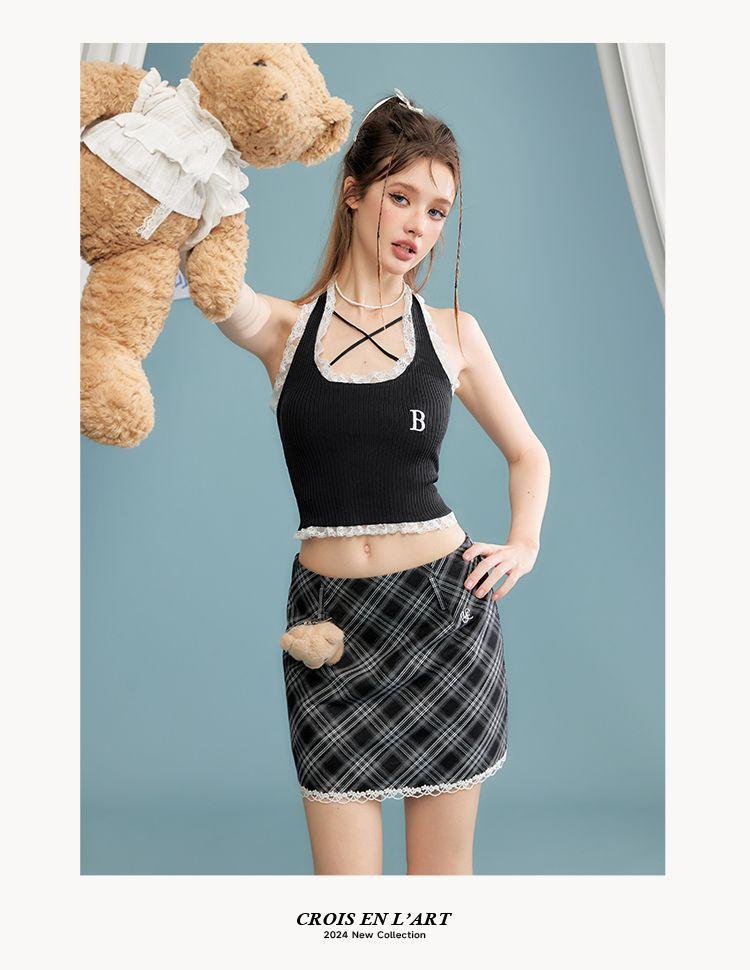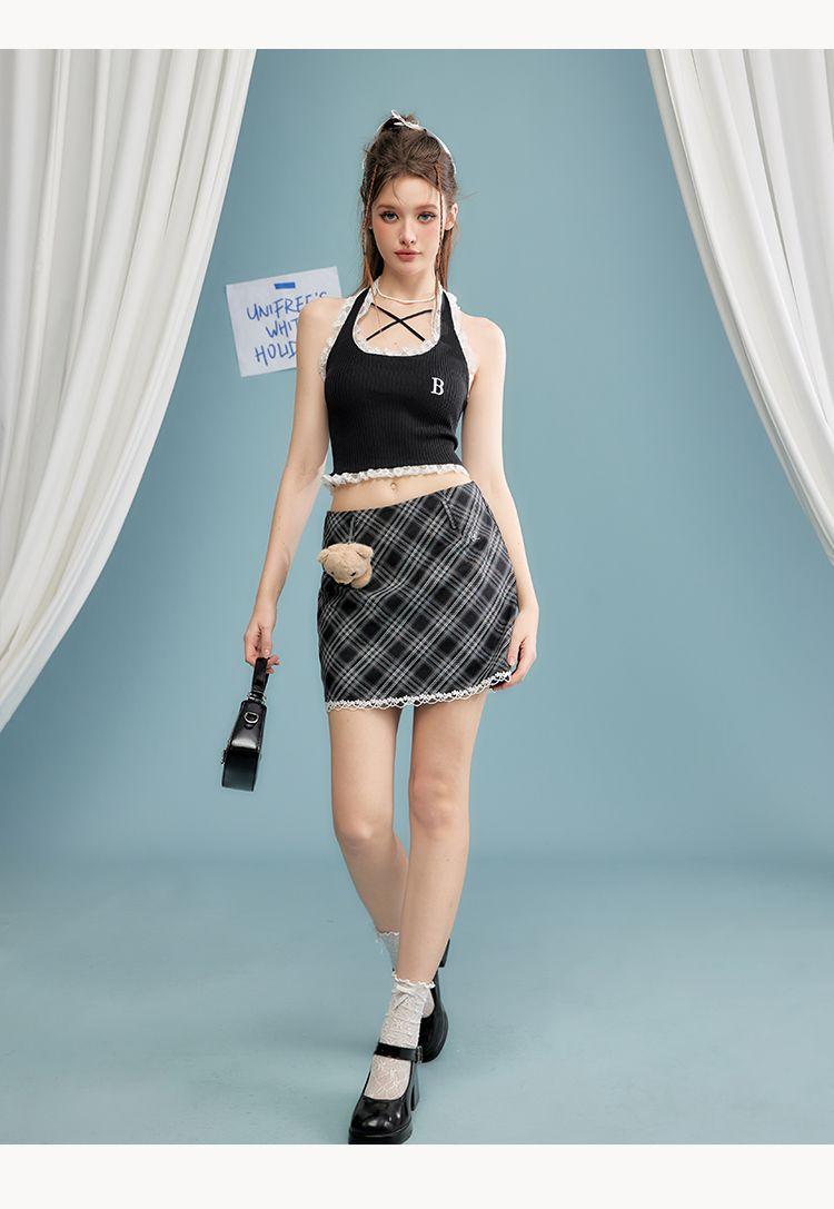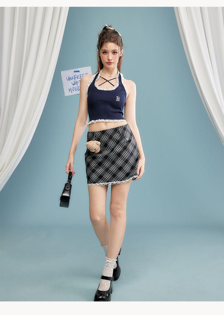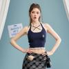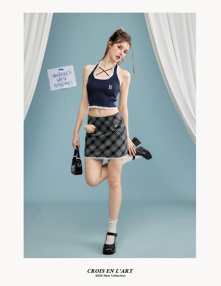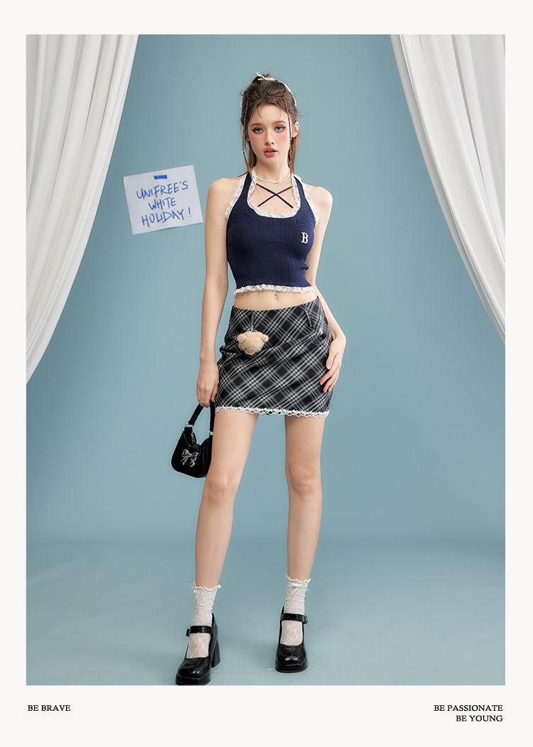 Camisola de verano para chica sexy, estilo nuevo, prenda exterior, dulce, sexy, sin espalda, corta, sin mangas, de punto, con encaje, costuras ajustadas.