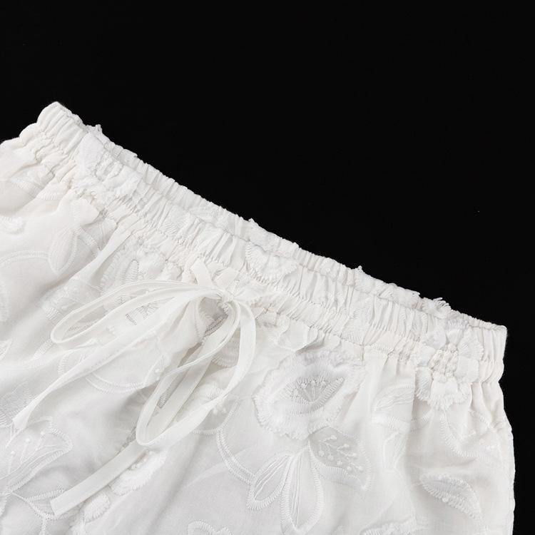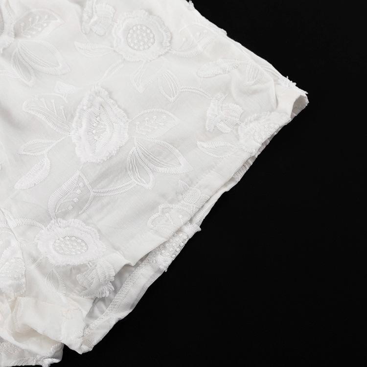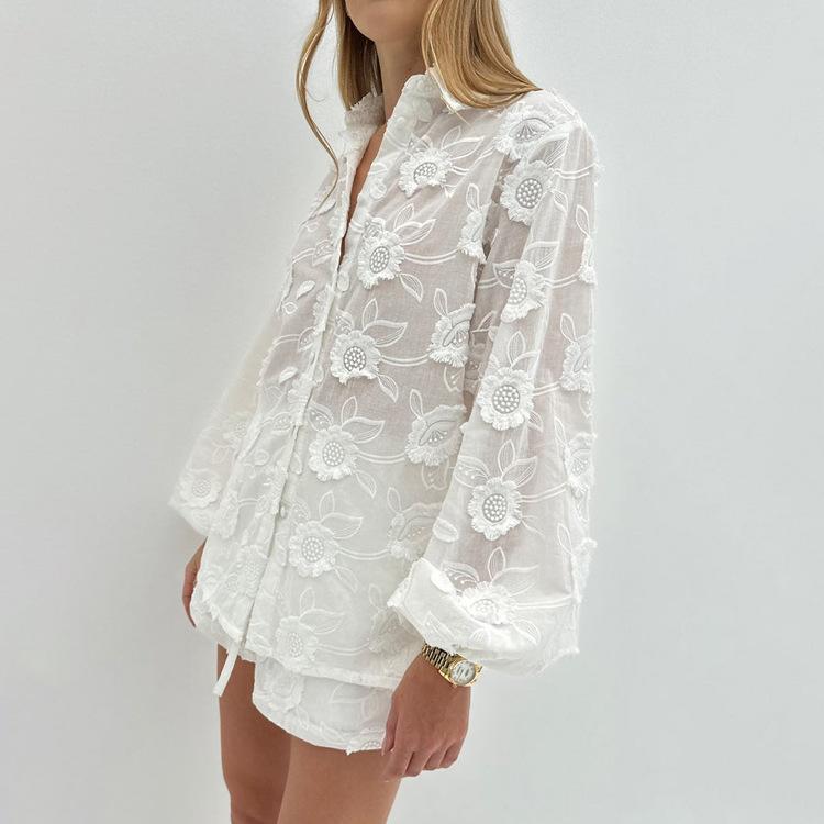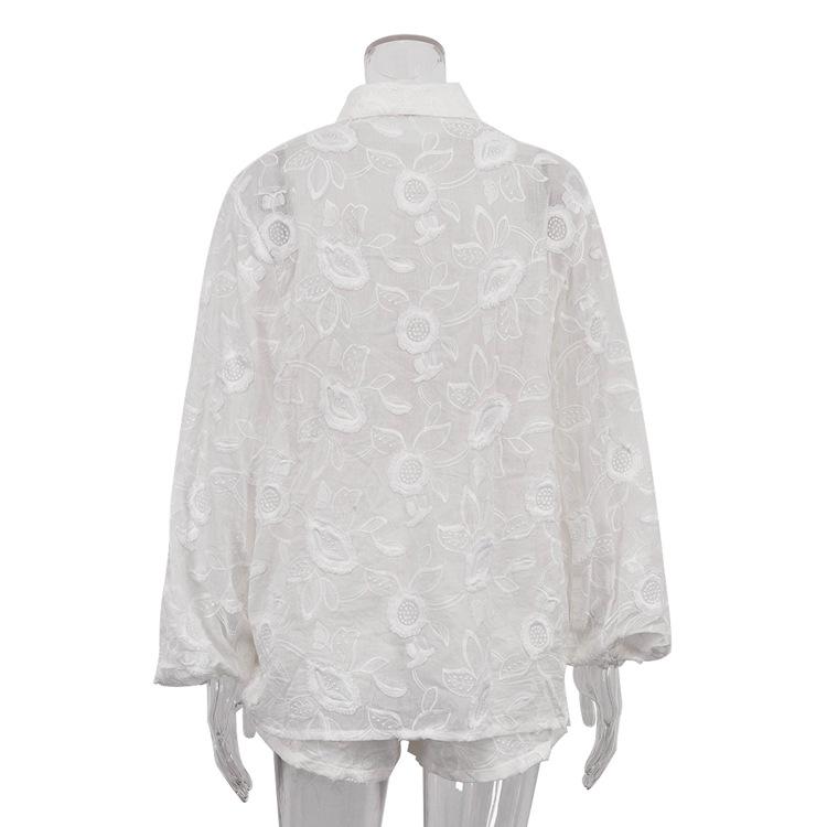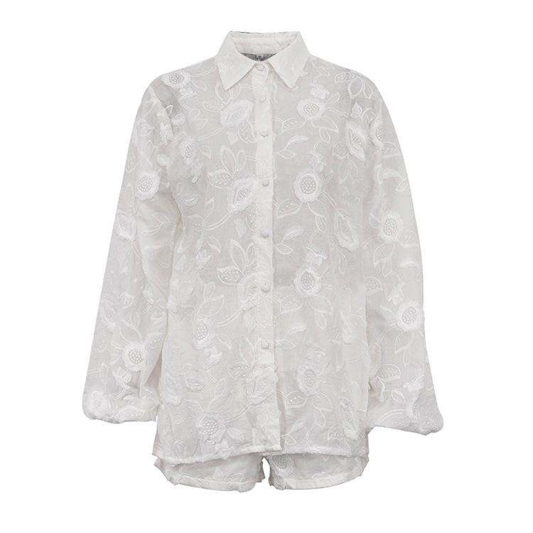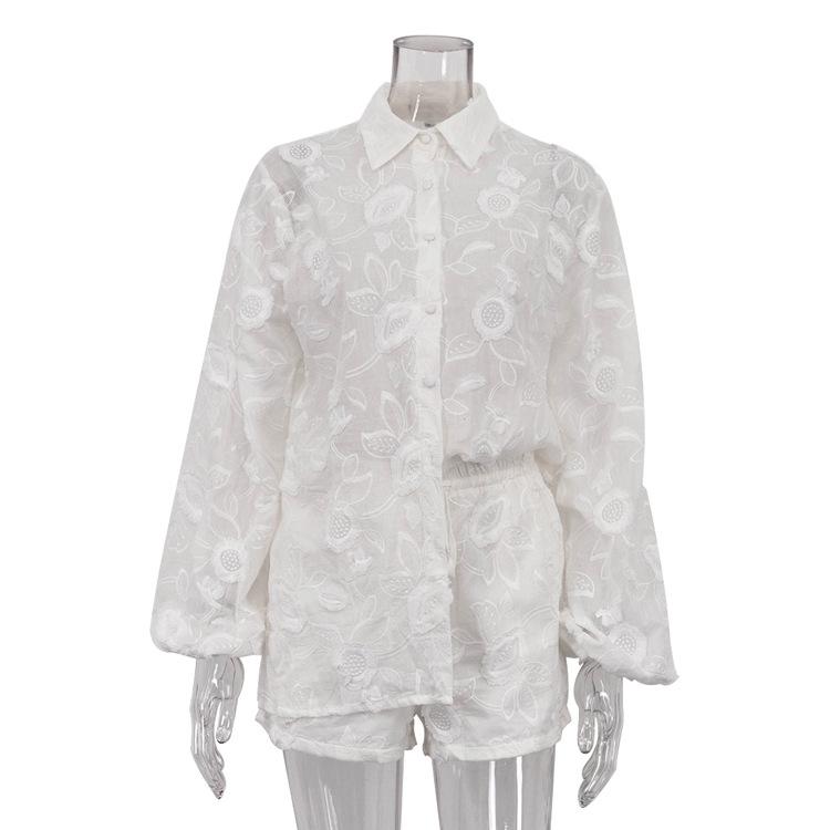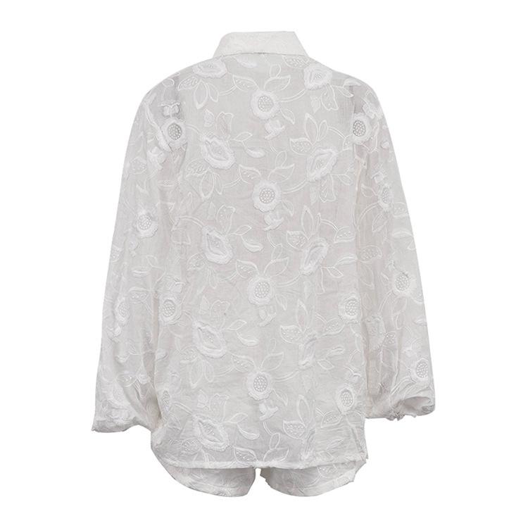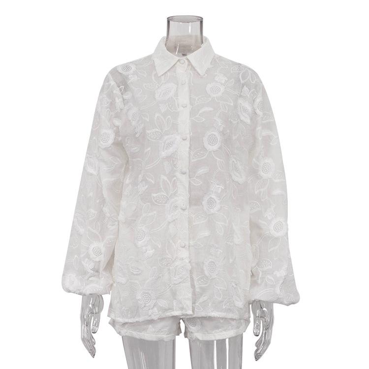 Traje sexy transfronterizo de Europa y Estados Unidos, primavera y otoño de 2024, nueva moda, camisa con perspectiva de bordado de algodón, pantalones cortos de cintura alta