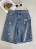 Pantalones cortos vaqueros de cintura alta y cinco puntos, novedad de verano de 2024, rotos, sueltos, de cintura alta, adelgazantes, de corte A, de pierna ancha, de longitud media.