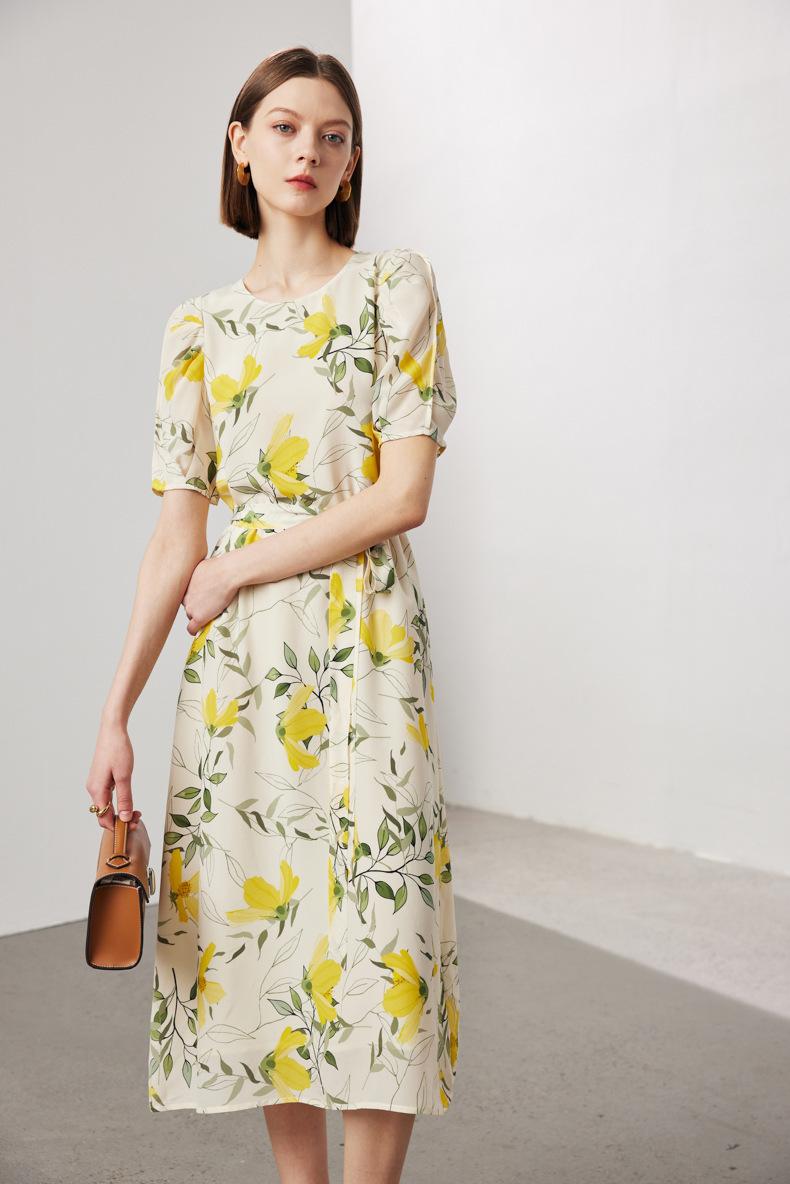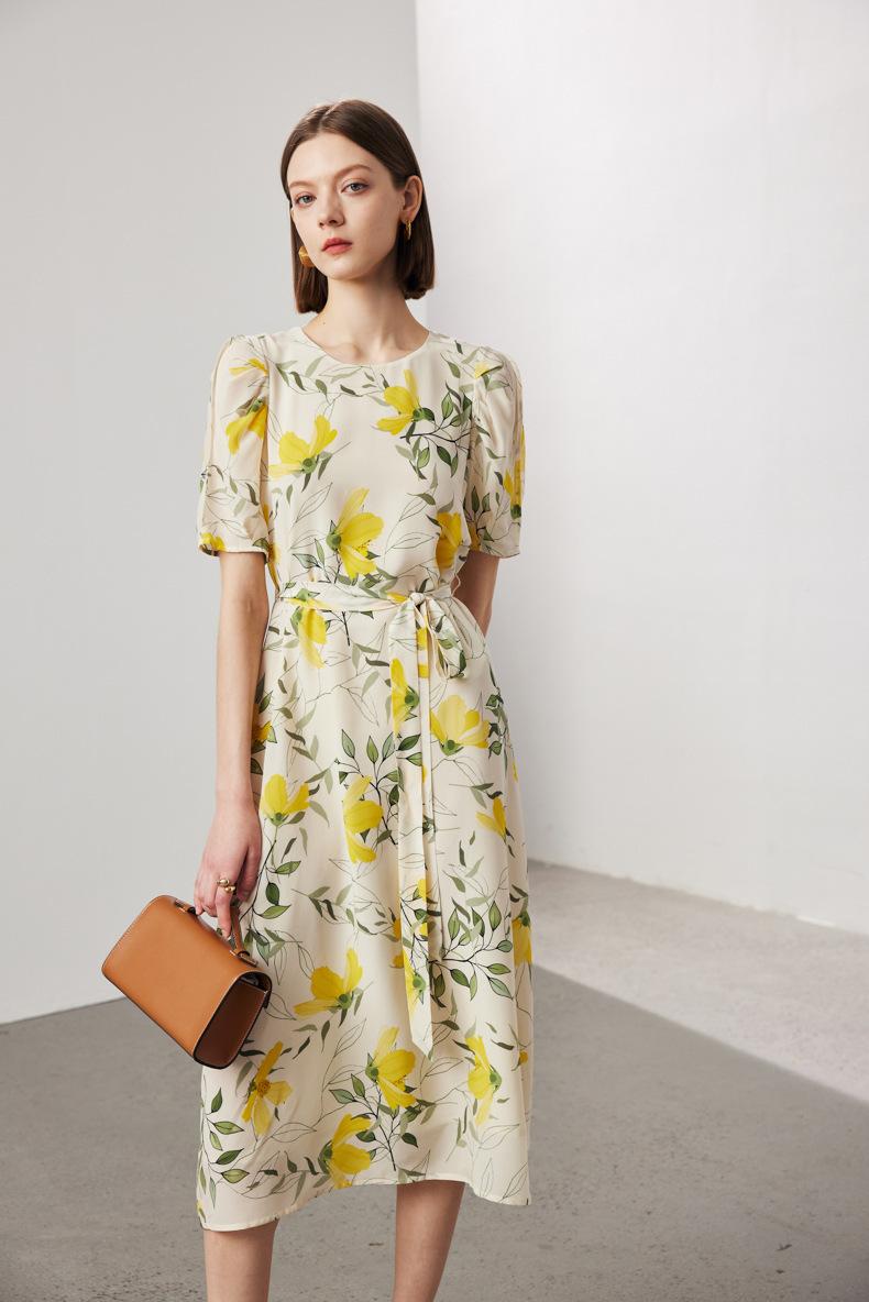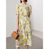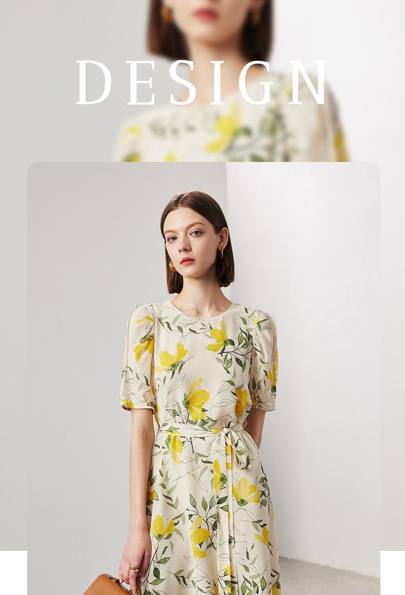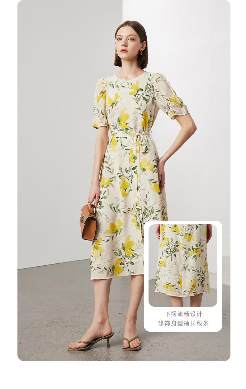 Vestido de Seda de Manga Corta para Mujer 2025 Primavera y Verano Nuevo Estilo Cintura con Cordones Ropa de Trabajo Floral Crepé de China Falda de Seda de Morera 100%