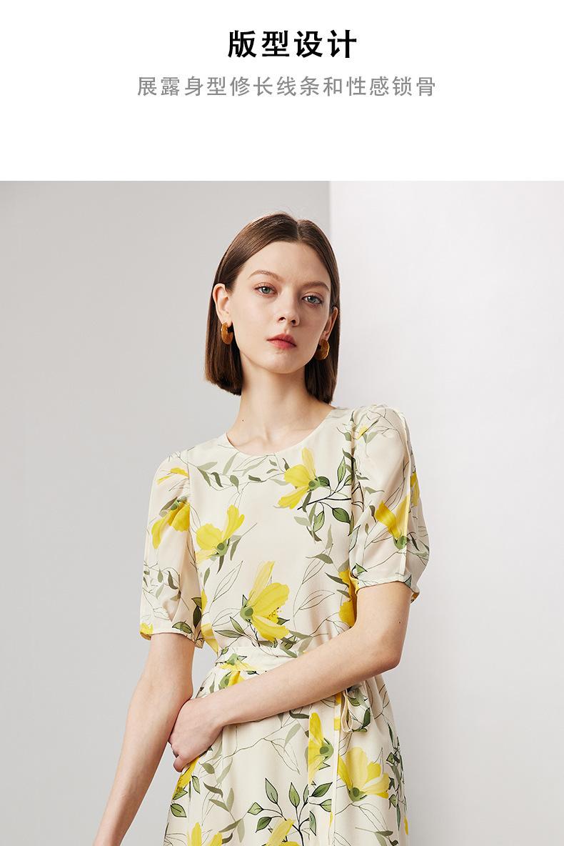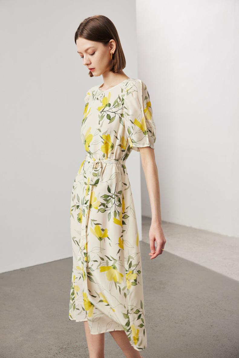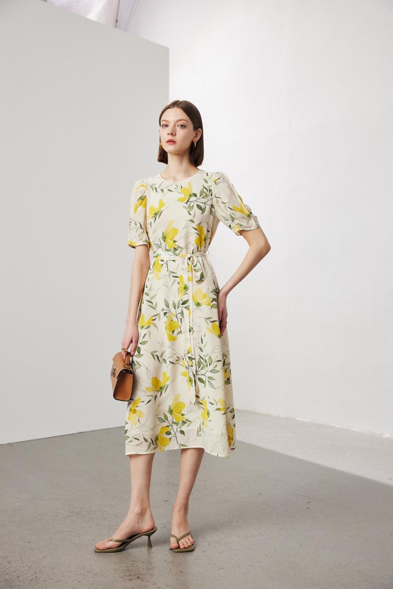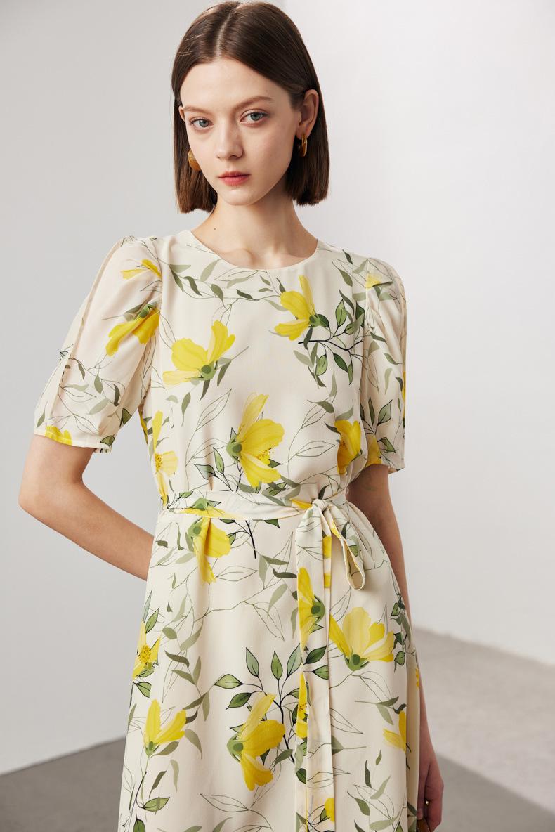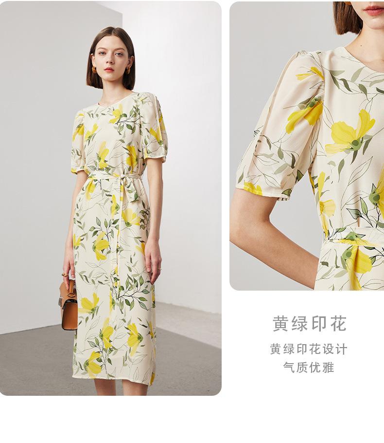 Vestido de Seda de Manga Corta para Mujer 2025 Primavera y Verano Nuevo Estilo Cintura con Cordones Ropa de Trabajo Floral Crepé de China Falda de Seda de Morera 100%