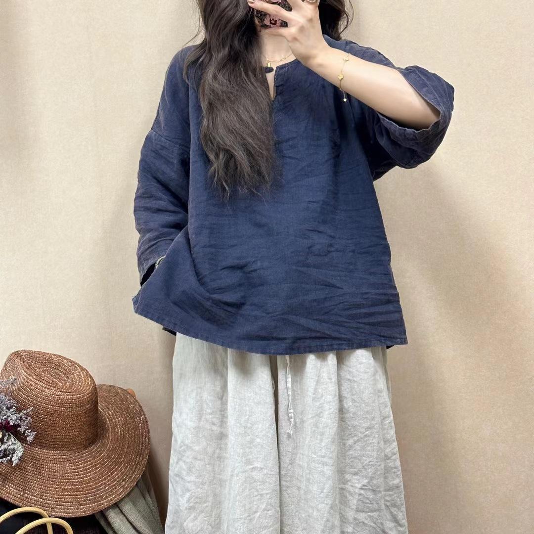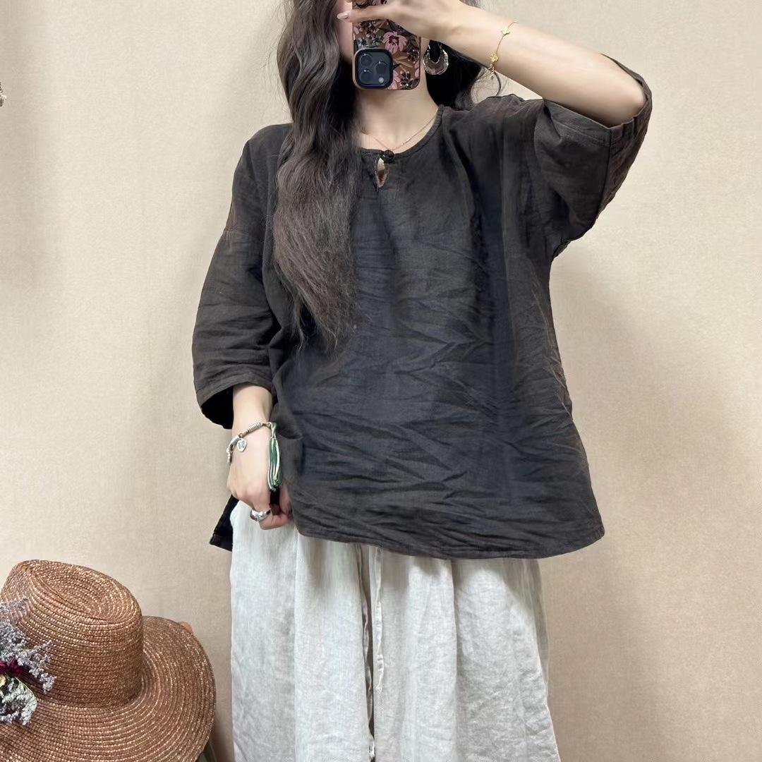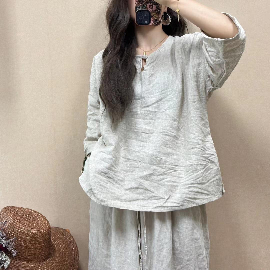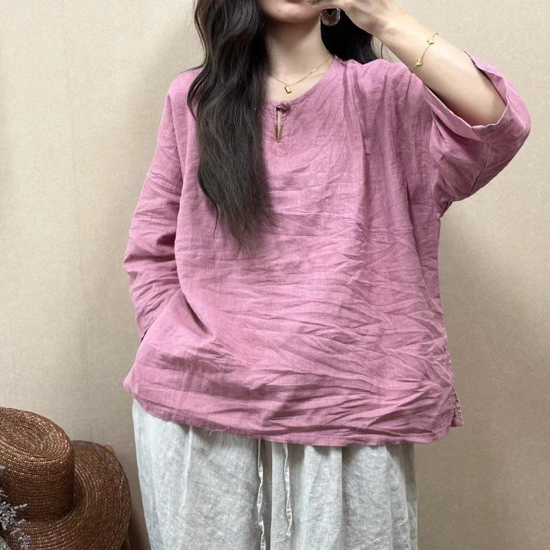 Camisa informal de lino de color liso, holgada, con cuello redondo y estilo artístico, novedad de verano de 2024