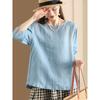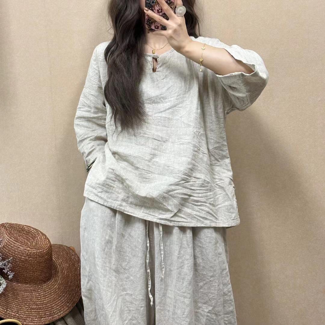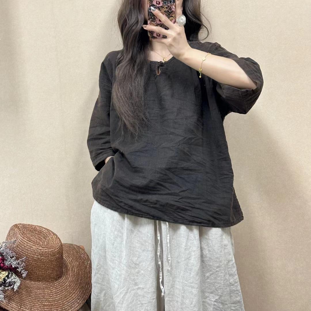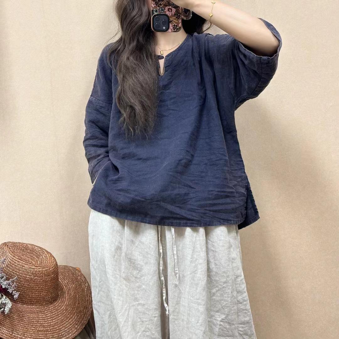Camisa informal de lino de color liso, holgada, con cuello redondo y estilo artístico, novedad de verano de 2024