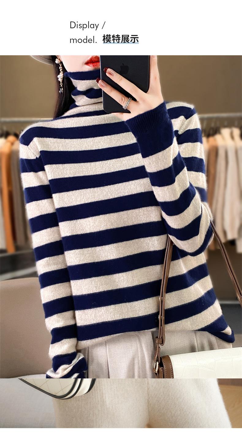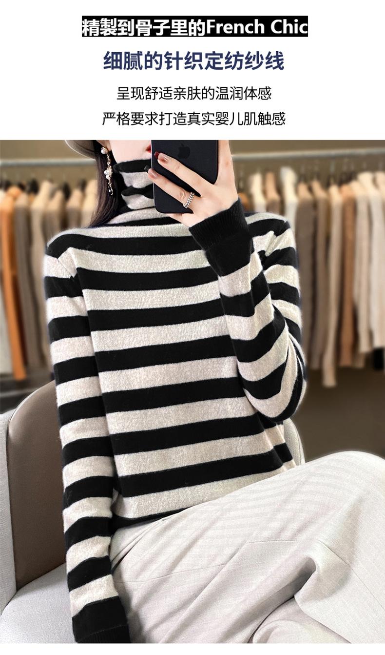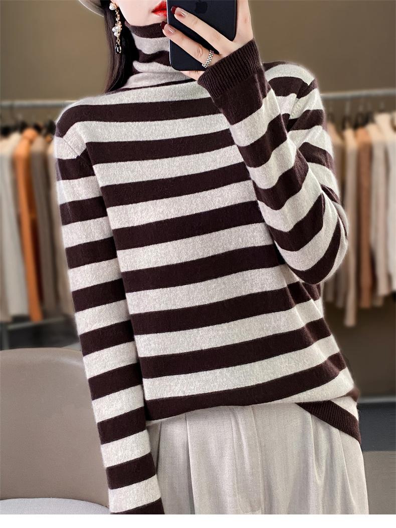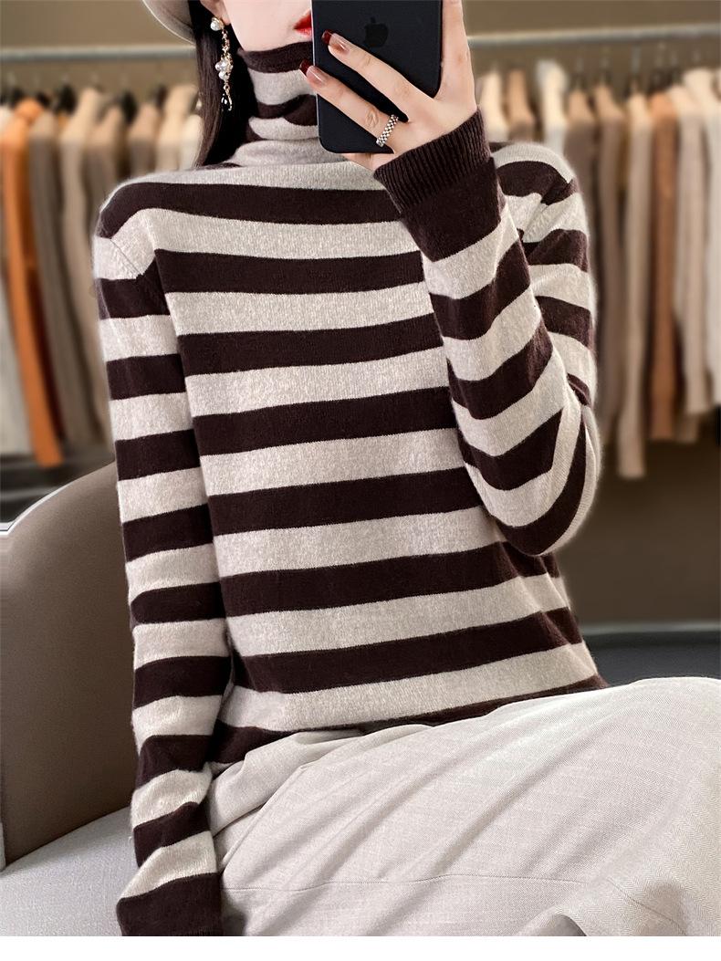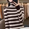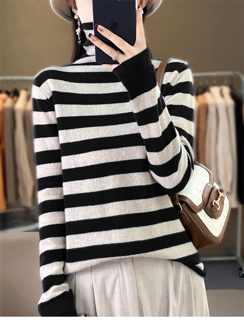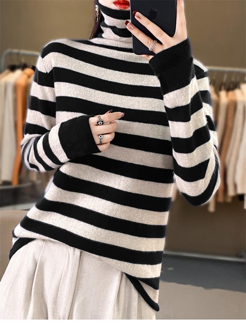 Otoño e Invierno Nuevo Suéter de Base de Cuello Alto de Pila a Rayas Negro y Blanco de Manga Larga para Mujer Suéter de Cuello Alto Holgado Estilo Occidental para Mujer