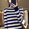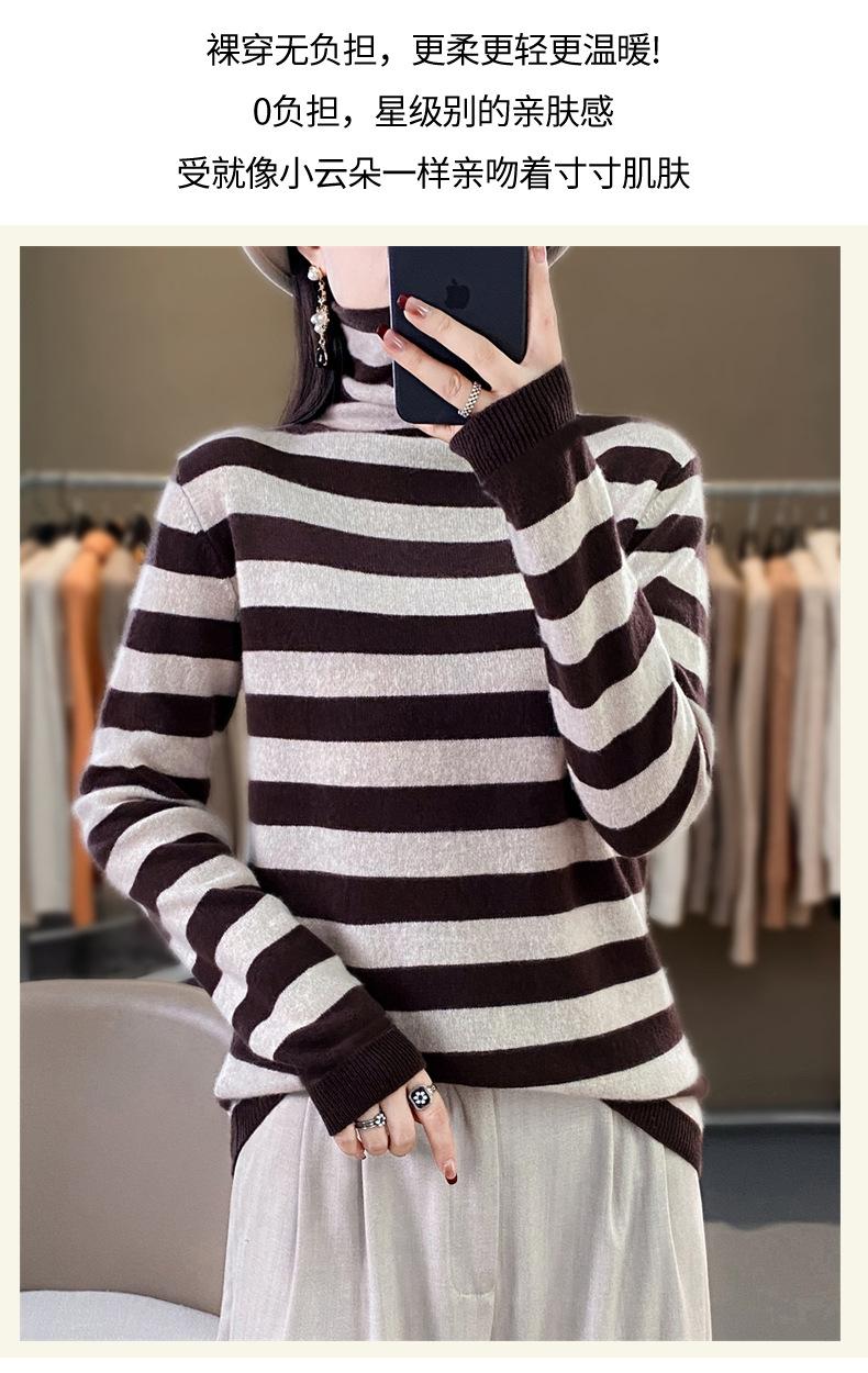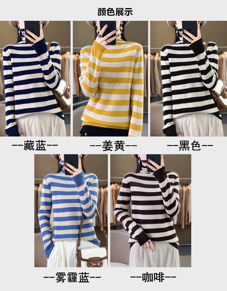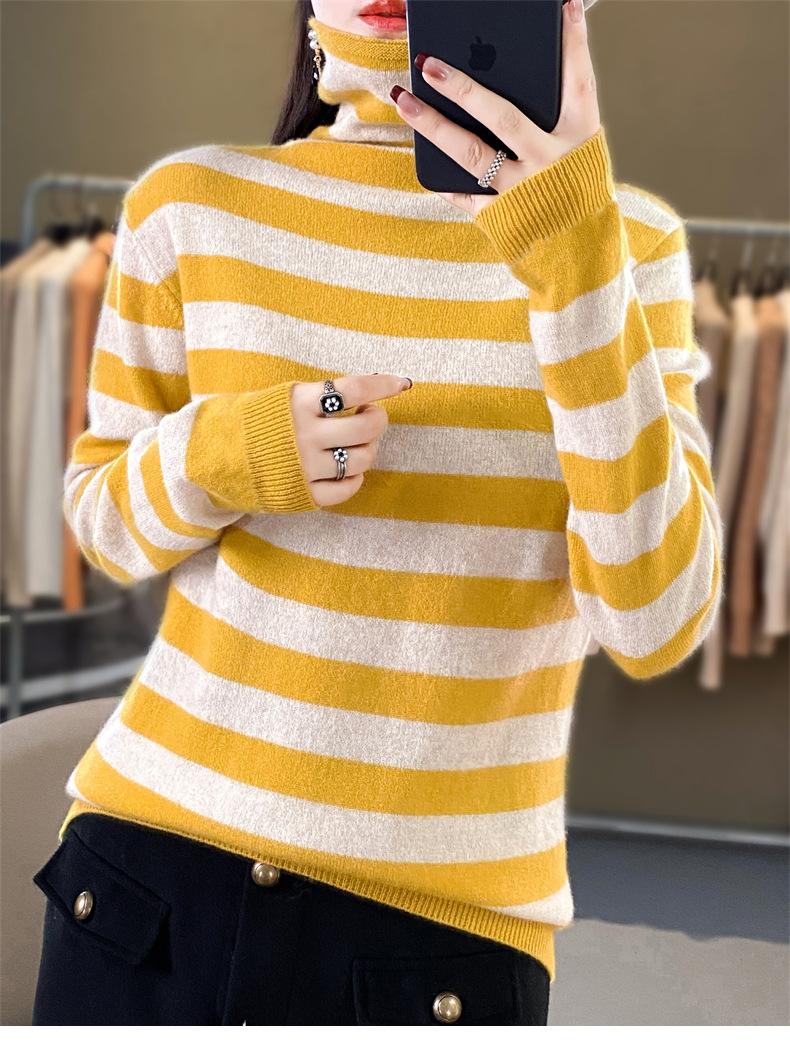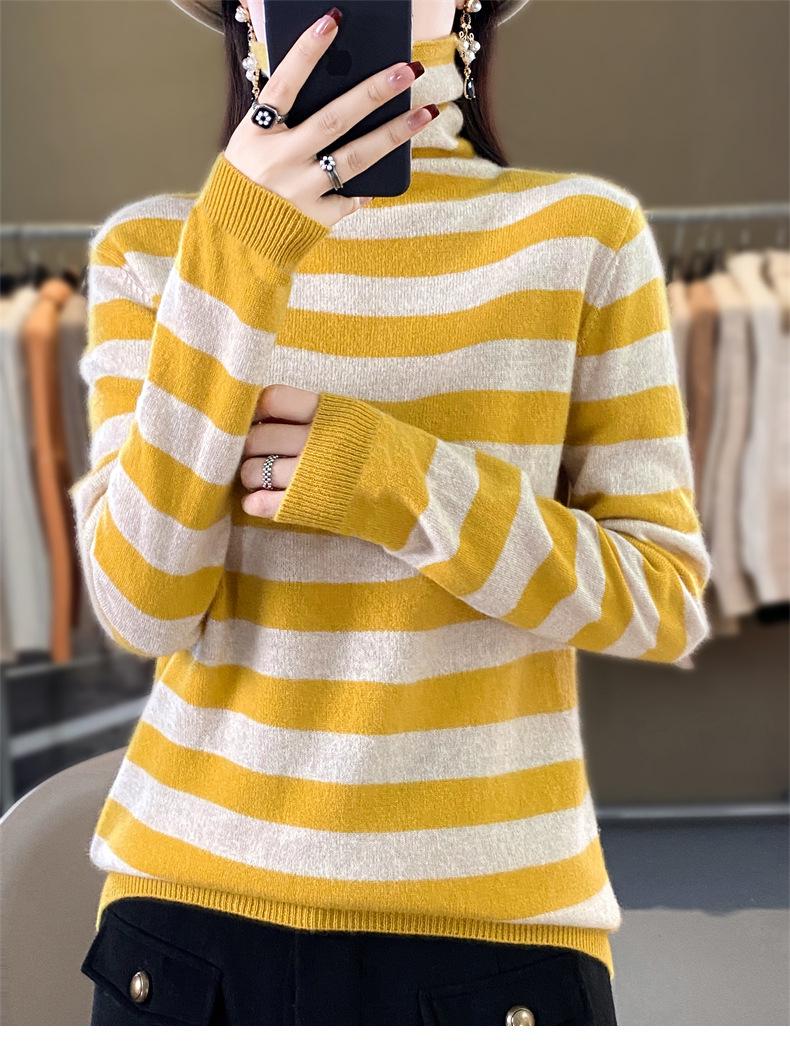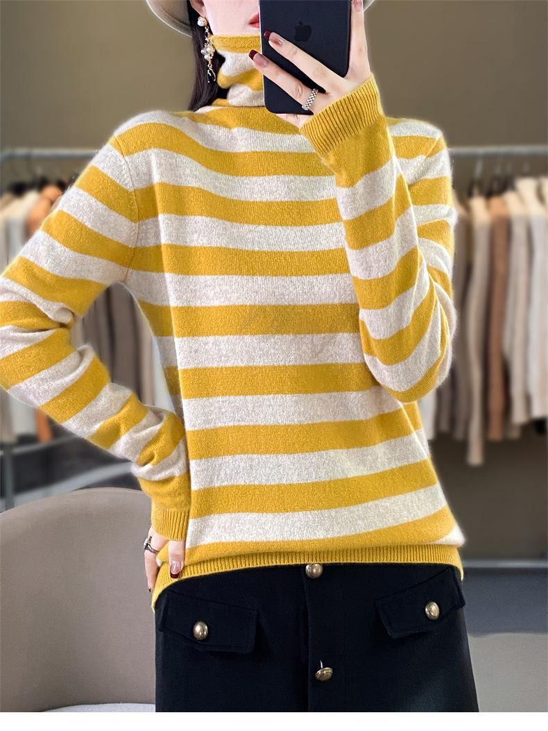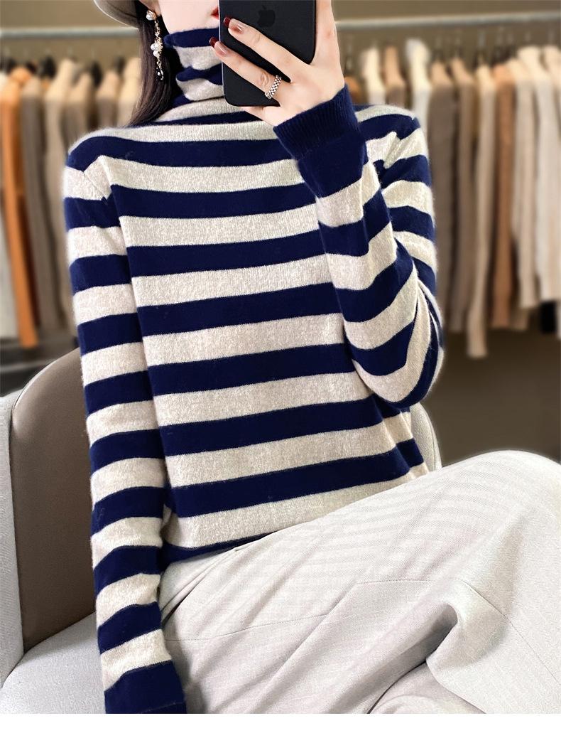 Otoño e Invierno Nuevo Suéter de Base de Cuello Alto de Pila a Rayas Negro y Blanco de Manga Larga para Mujer Suéter de Cuello Alto Holgado Estilo Occidental para Mujer