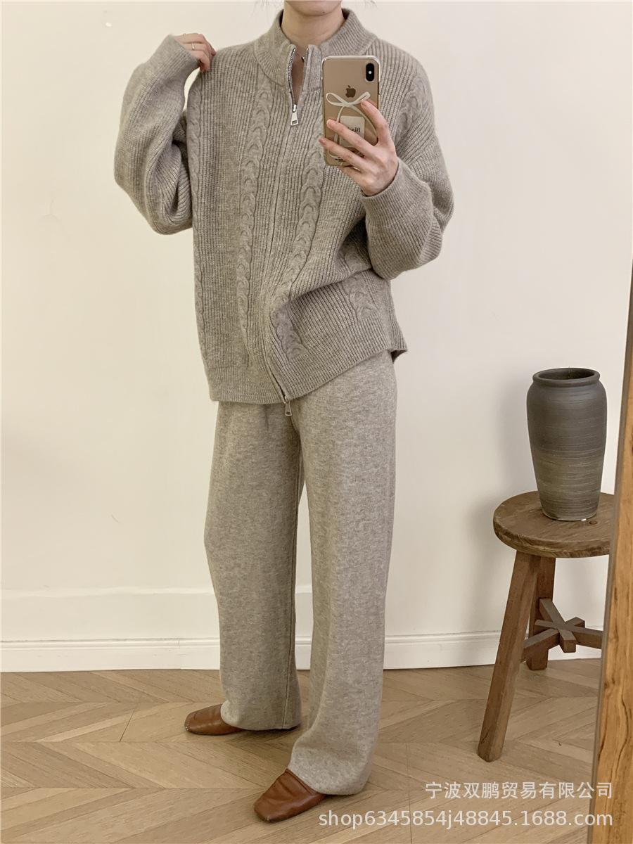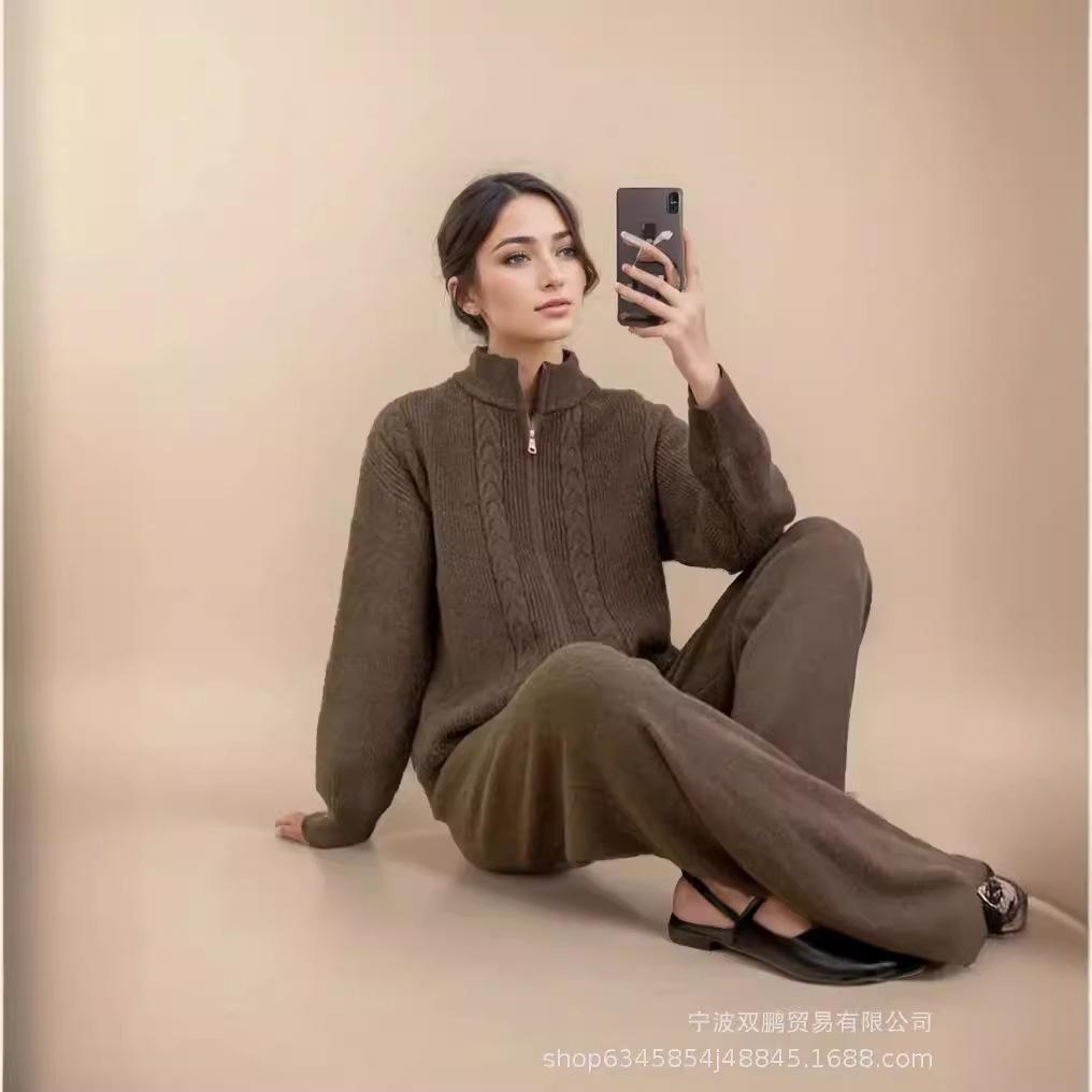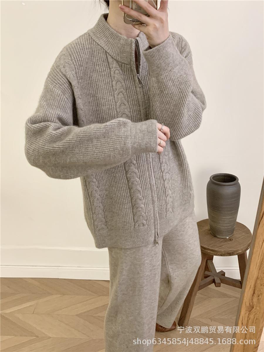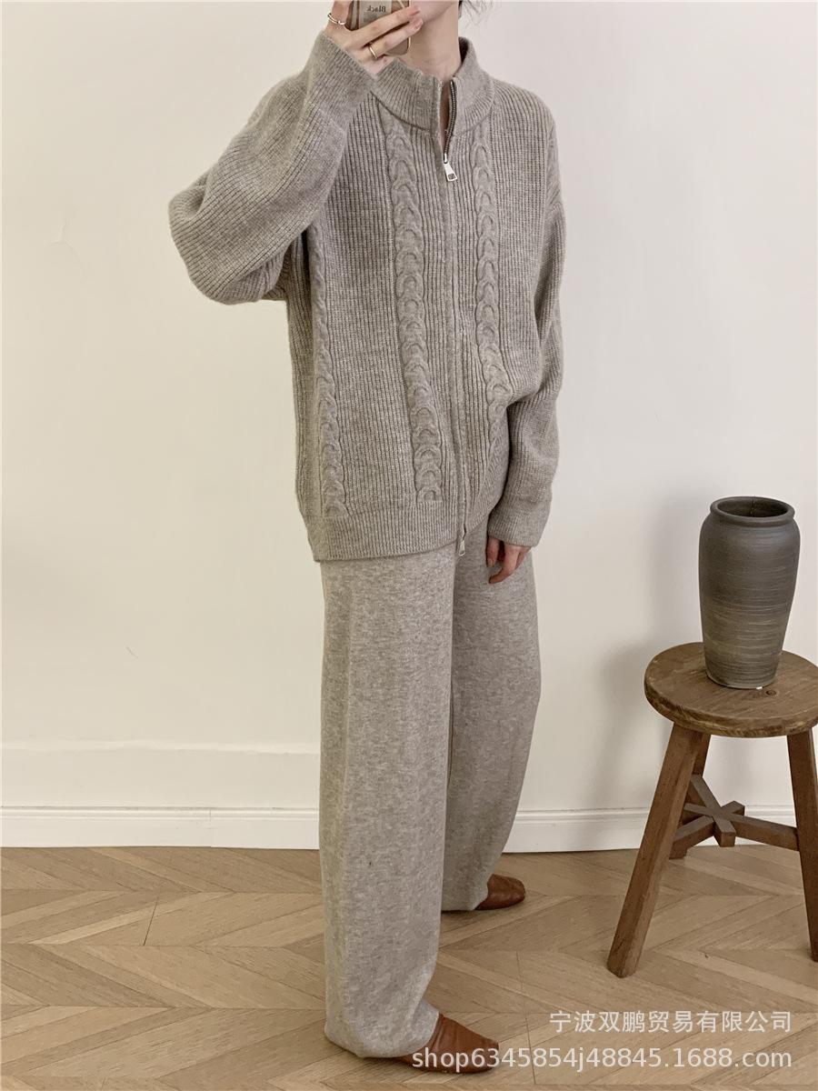 Traje de punto suelto de estilo europeo y americano transfronterizo de gran venta para mujer 2025 Otoño e Invierno Nuevo Suéter con cremallera Cárdigan + Pantalones de pierna ancha