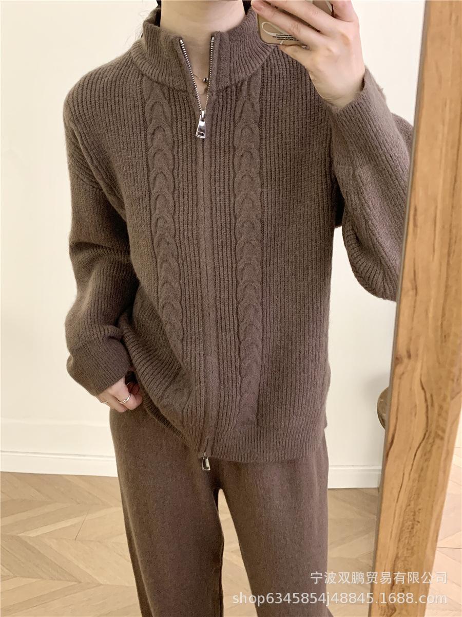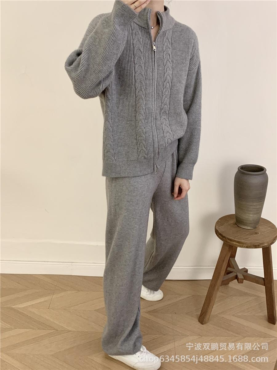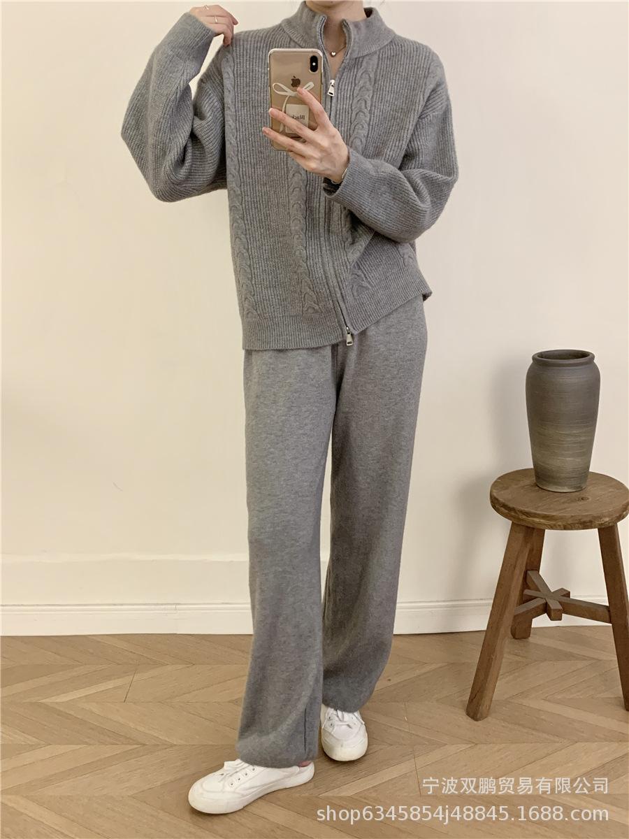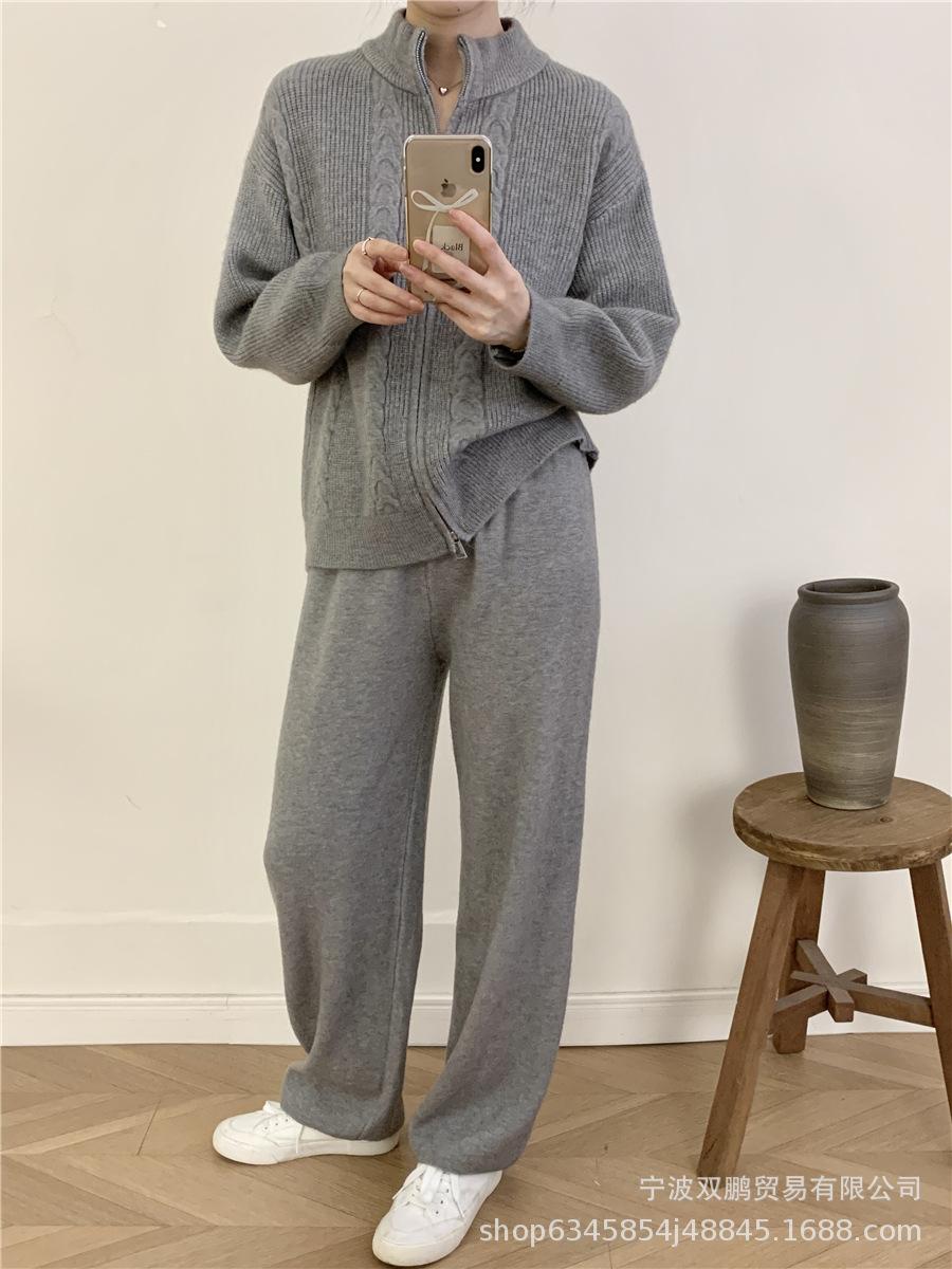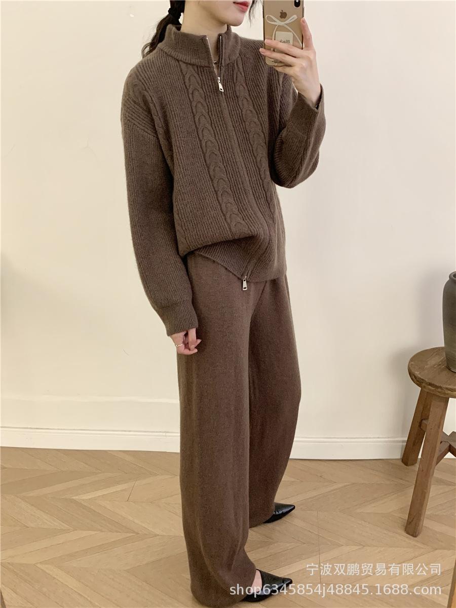 Traje de punto suelto de estilo europeo y americano transfronterizo de gran venta para mujer 2025 Otoño e Invierno Nuevo Suéter con cremallera Cárdigan + Pantalones de pierna ancha
