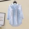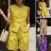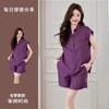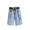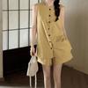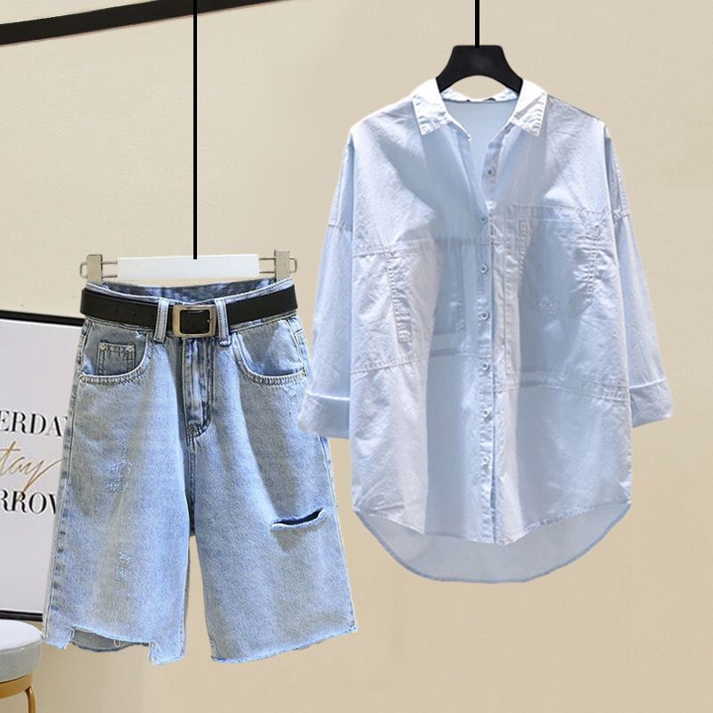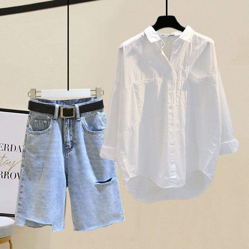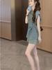 Traje de verano para mujer 2024 Nueva Moda Camisa Protector Solar Chaleco Rayado Shorts de Mezclilla con Aberturas Conjunto de Tres Piezas Estilo Hong Kong
