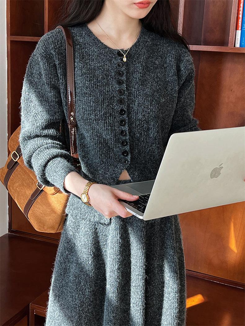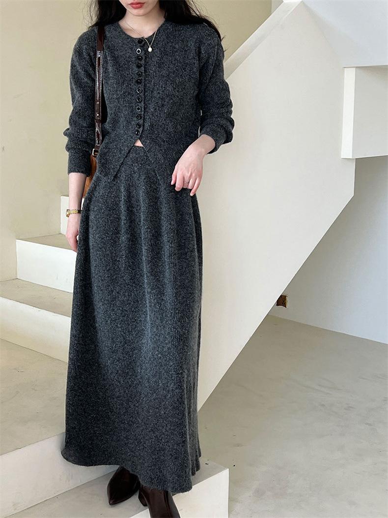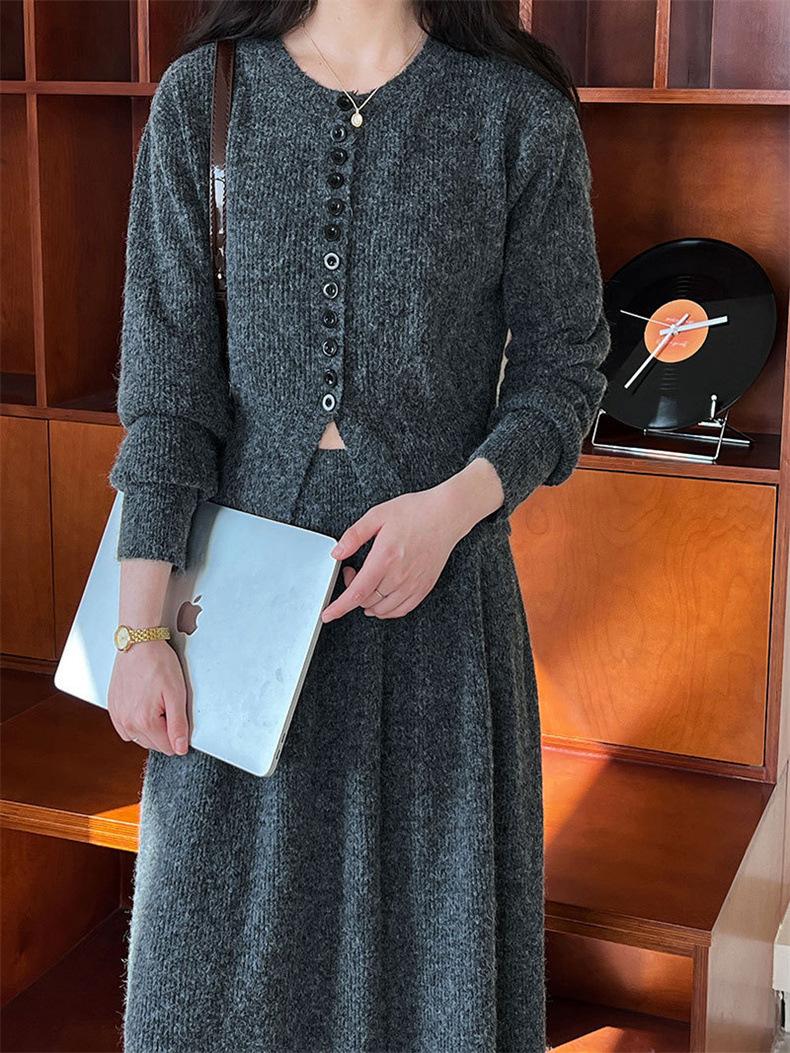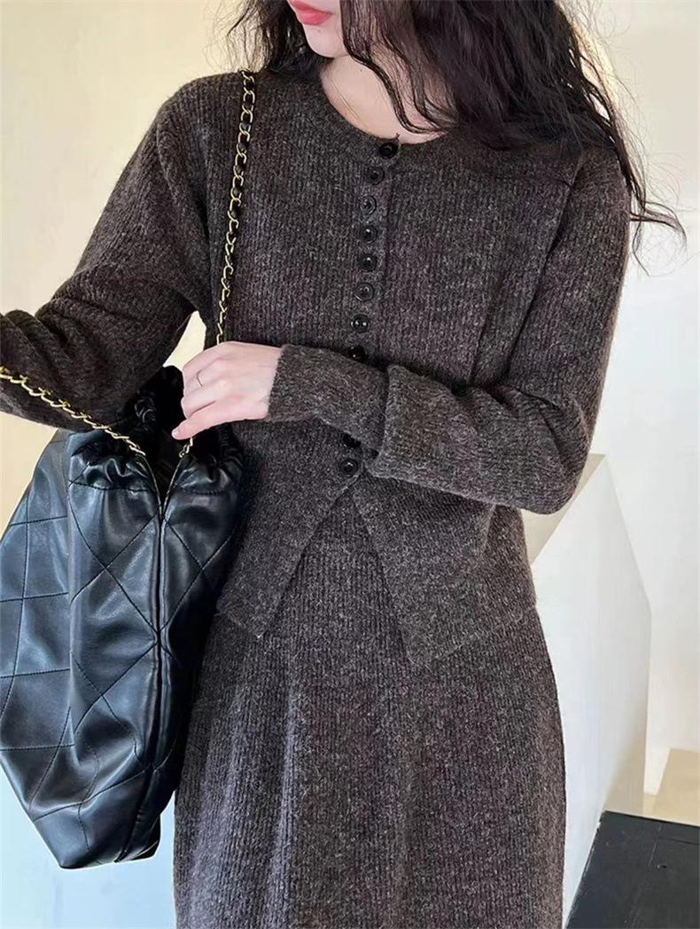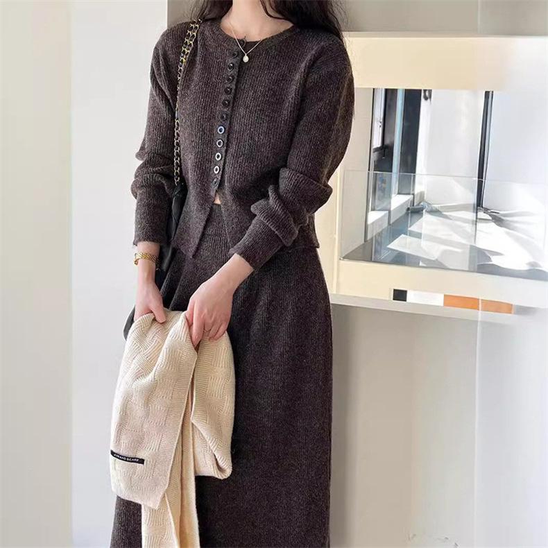 Otoño e invierno nuevo estilo suave traje de punto casual suéter de mujer cárdigan falda moda suave ceroso antiedad conjunto de dos piezas
