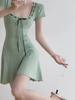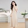 Vestido de Punto de Color Sólido de Manga Corta con Pliegues Cinturón Estilo Coreano Verano para Mujer Nuevo de Alta Gama Slim Falda Larga