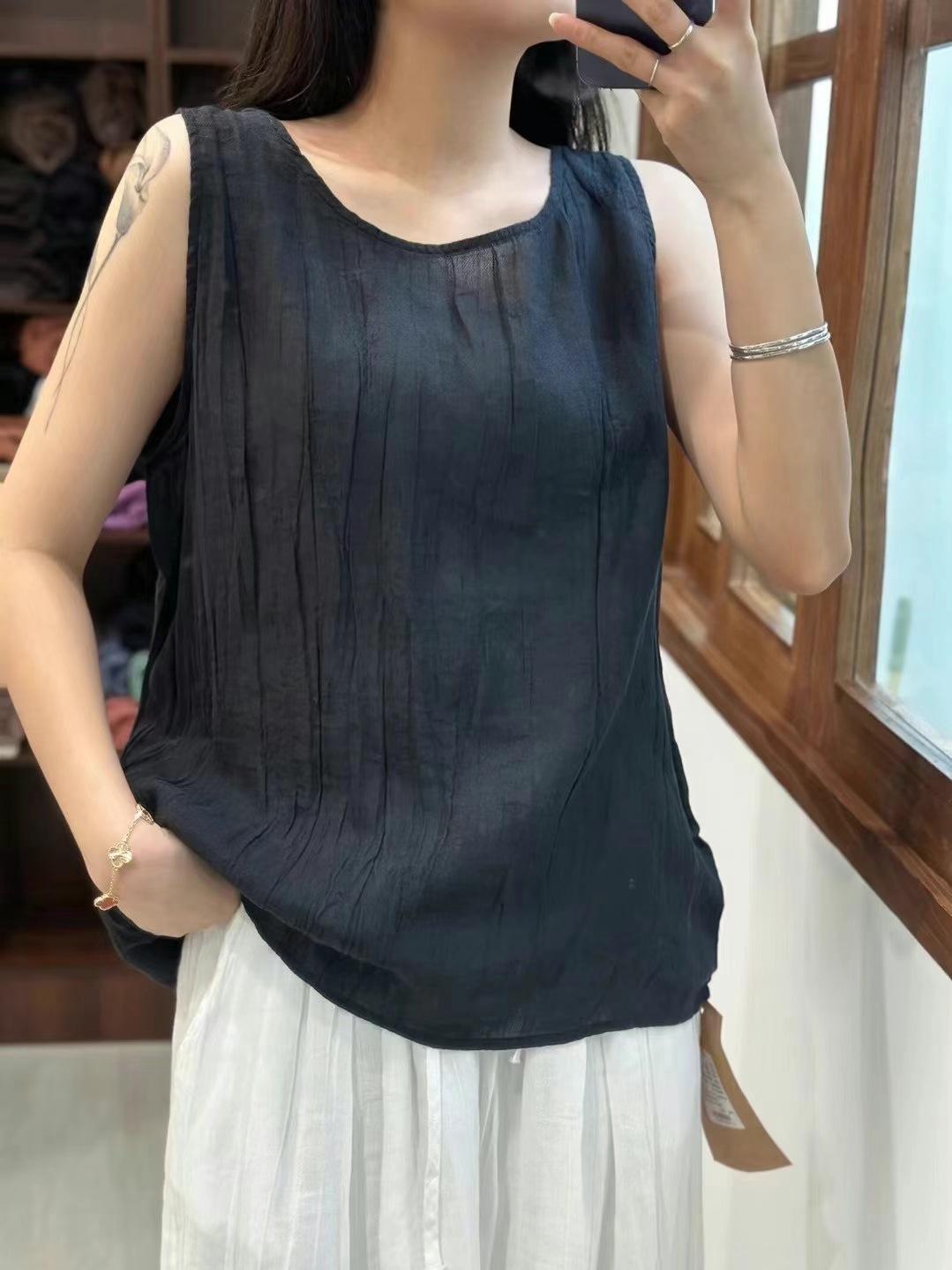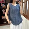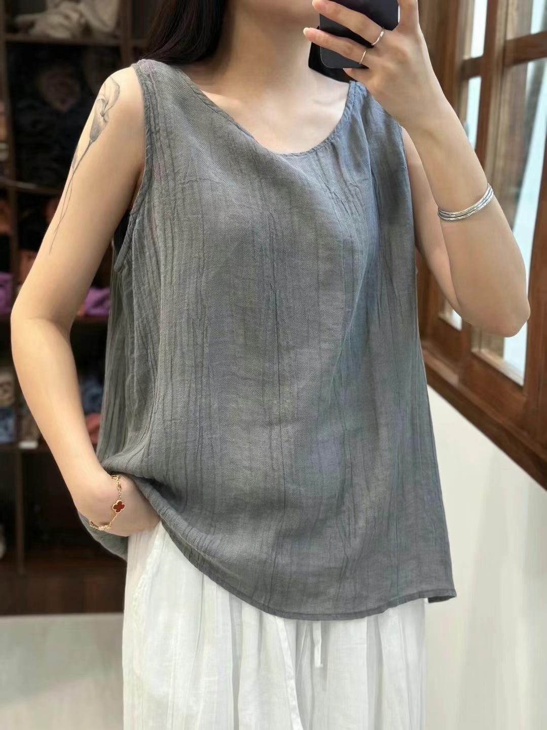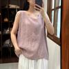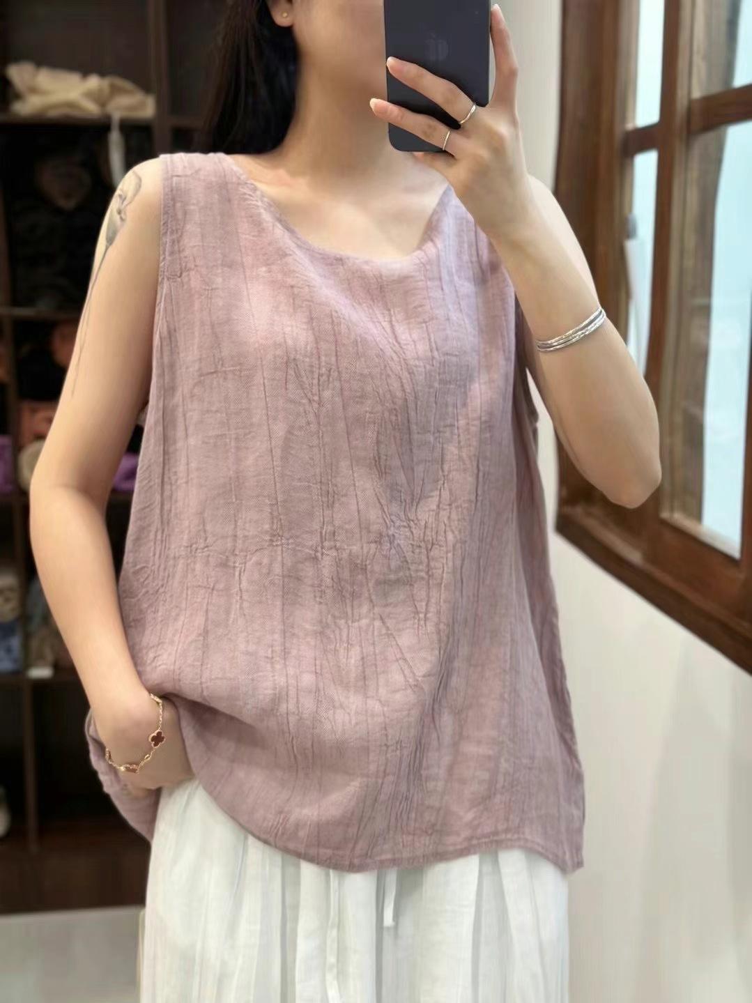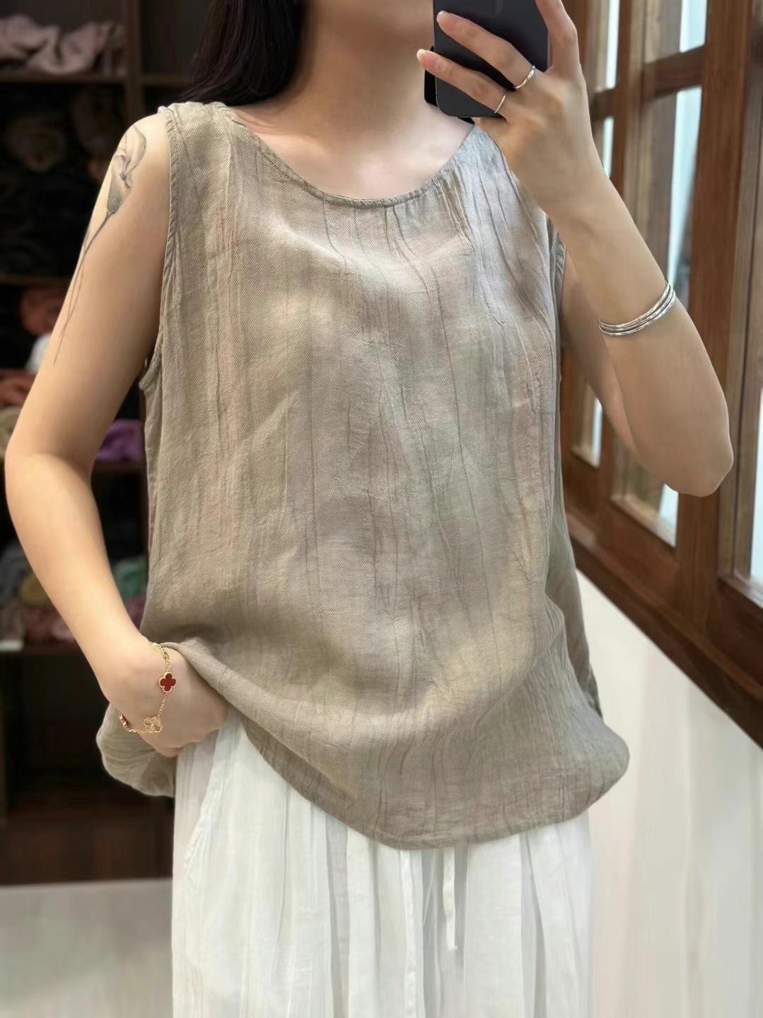 Verano Nuevo Estilo Artístico Cuello Redondo Camisa de Ramio sin Mangas Versión Suelta Camiseta Chaleco Aspecto Adelgazante 2024