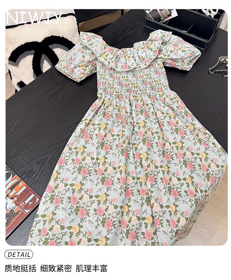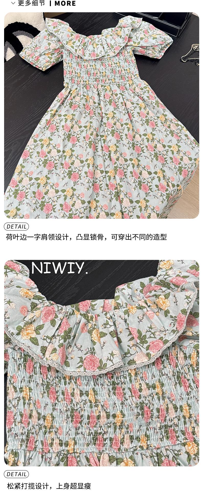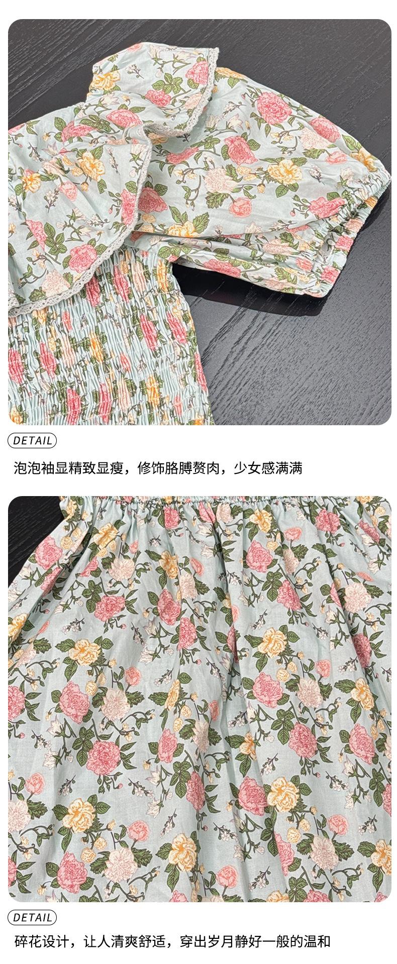 Vestido francés dulce con escote cuadrado, hombros descubiertos, estampado floral, mangas abullonadas, cintura plisada y elástico, estilo retro de verano