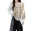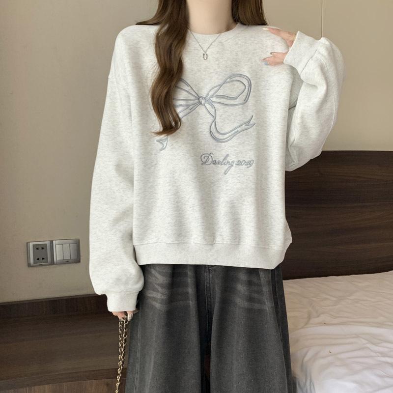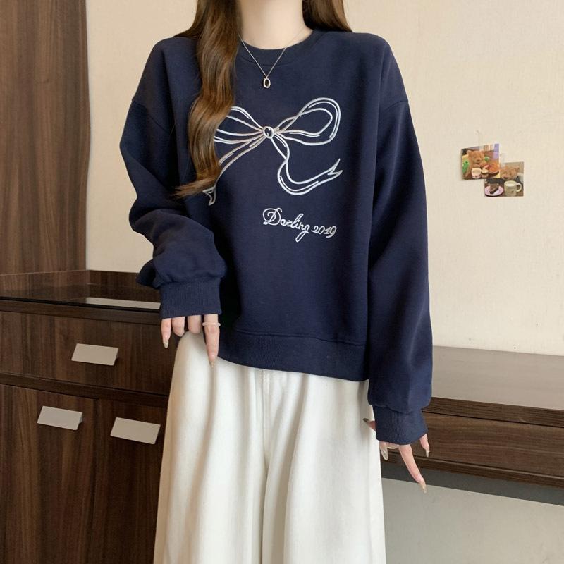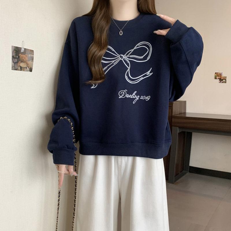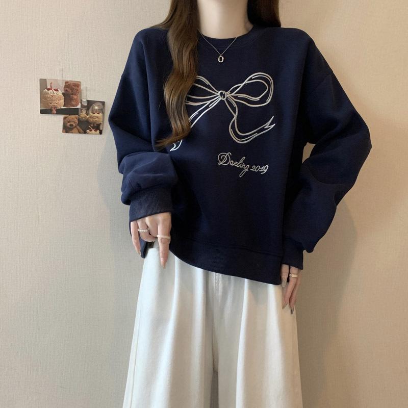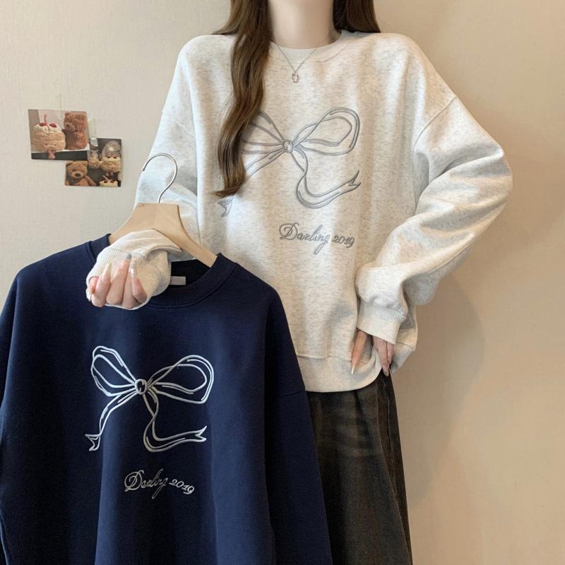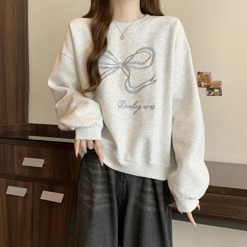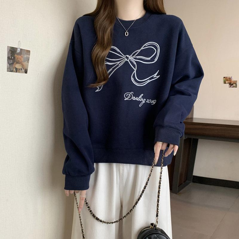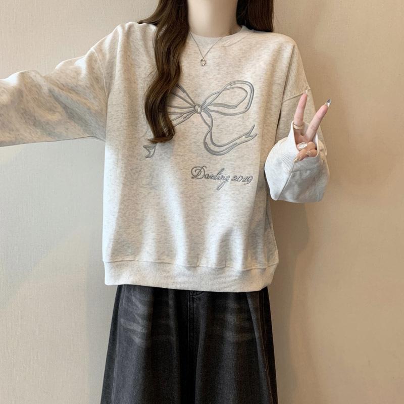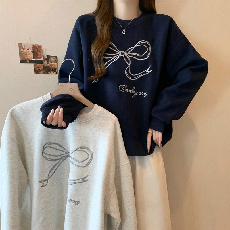 Sudadera de Punto Real Transfronteriza para Mujer Primavera y Otoño Nueva Holgada Estilo Coreano Versátil Lazo Bordado Cuello Redondo Top con Capucha