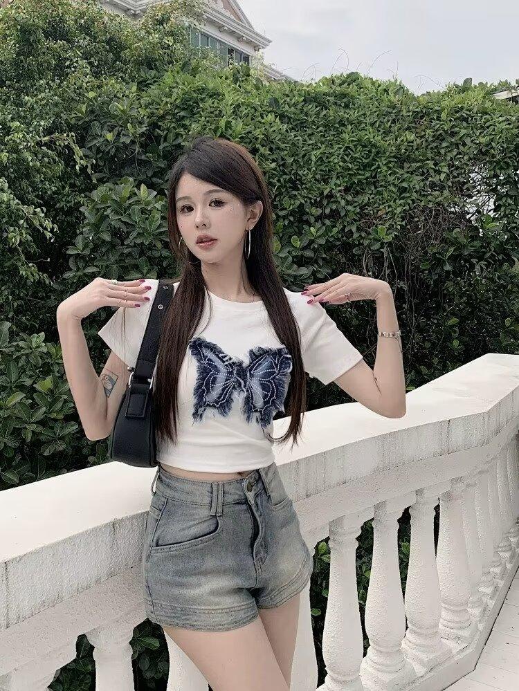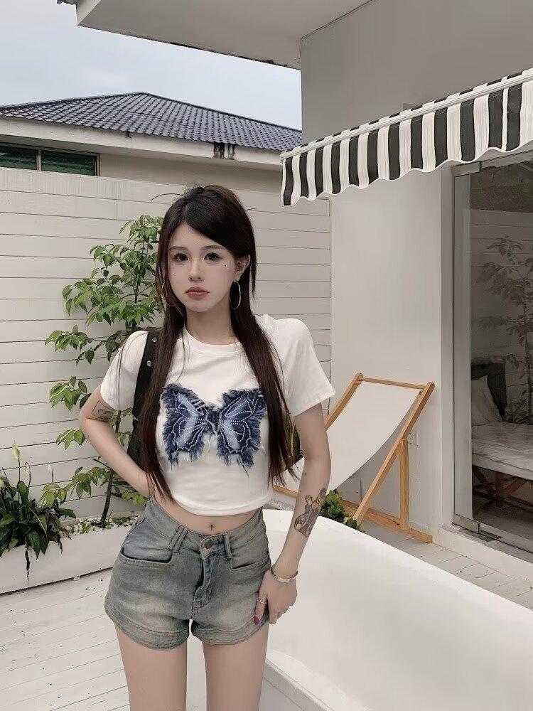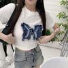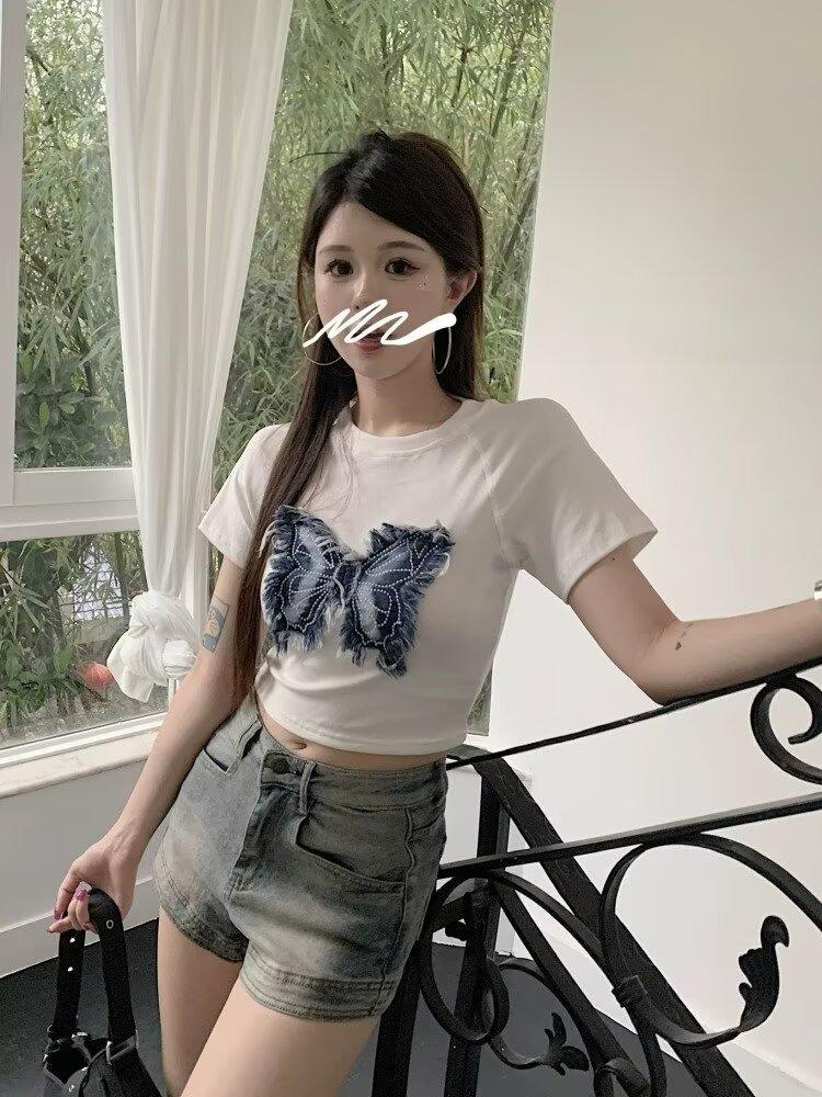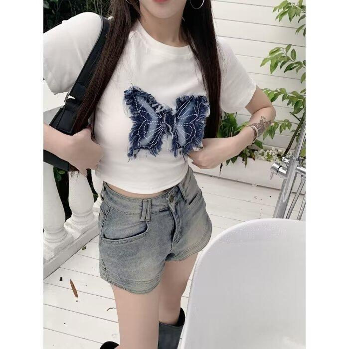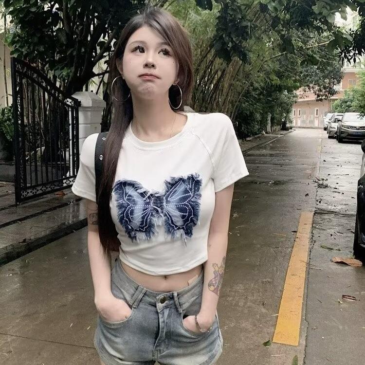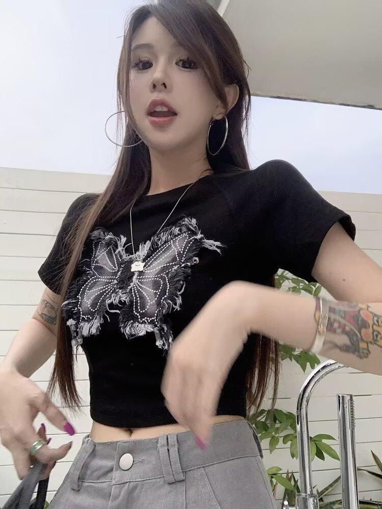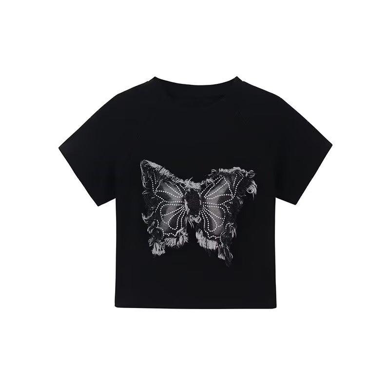 Camiseta de mariposa tridimensional estilo americano para mujer, diseño retro, estilo nicho, corte entallado, novedad de 2024, top corto dulce y sexy de manga corta.