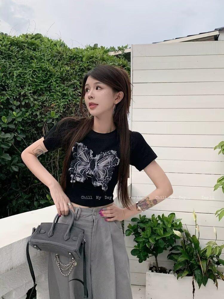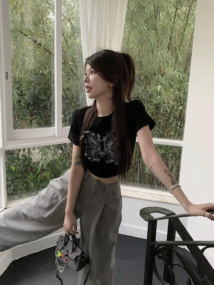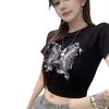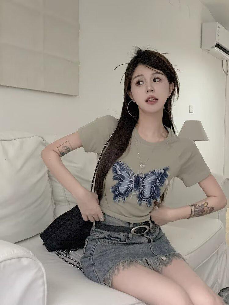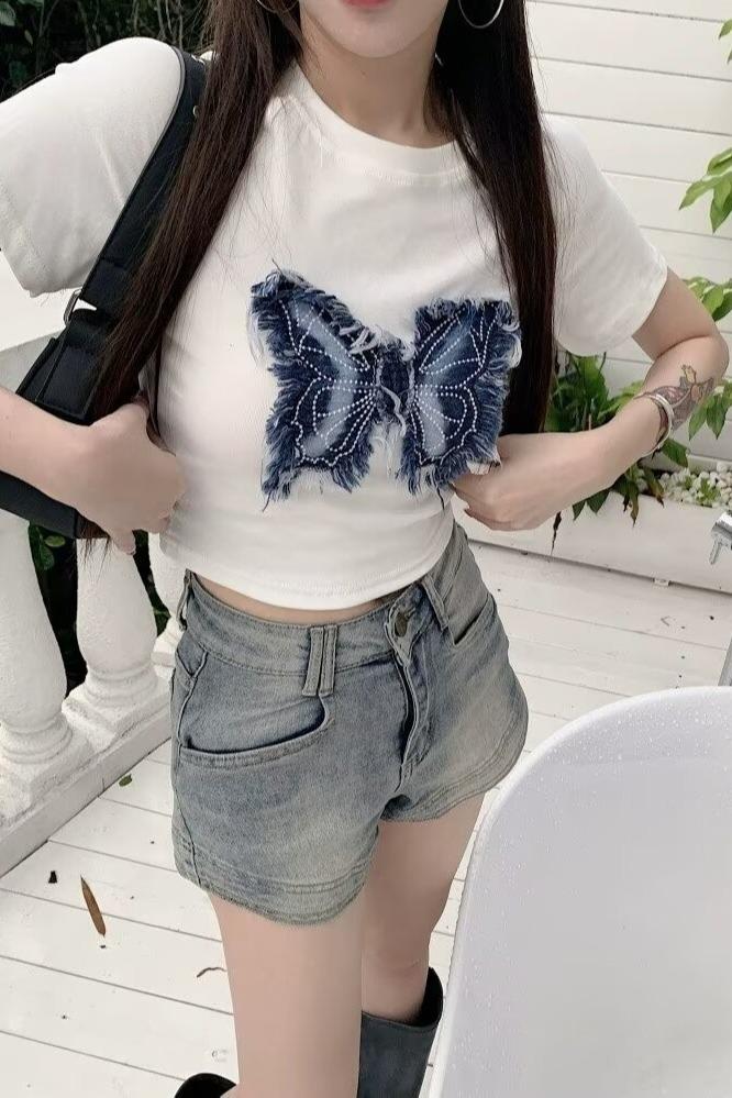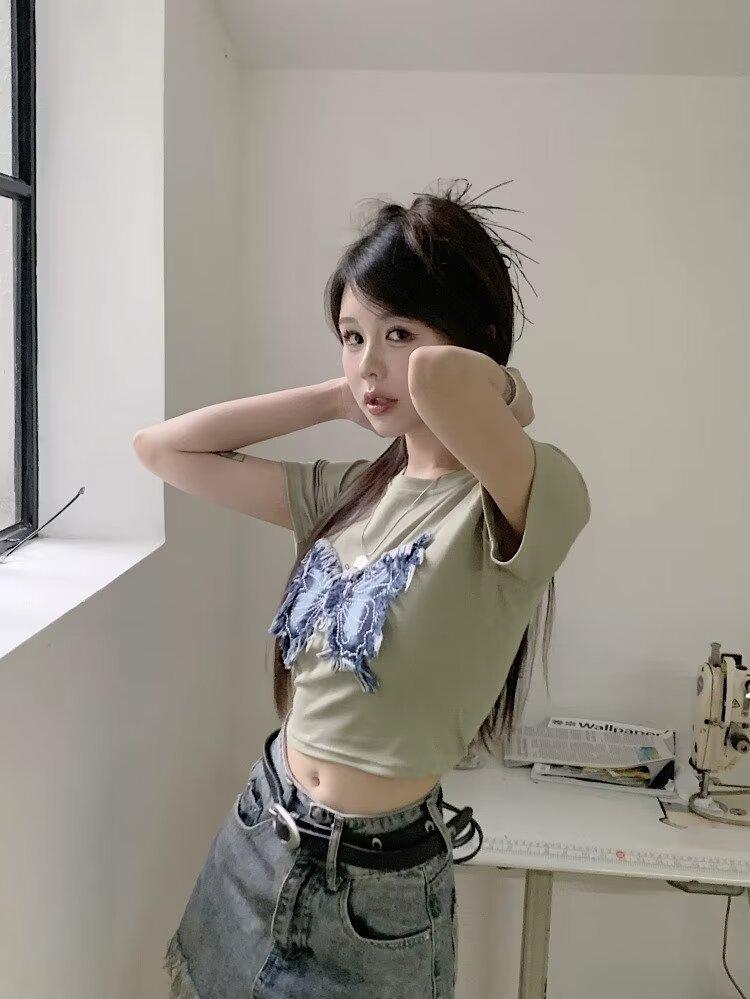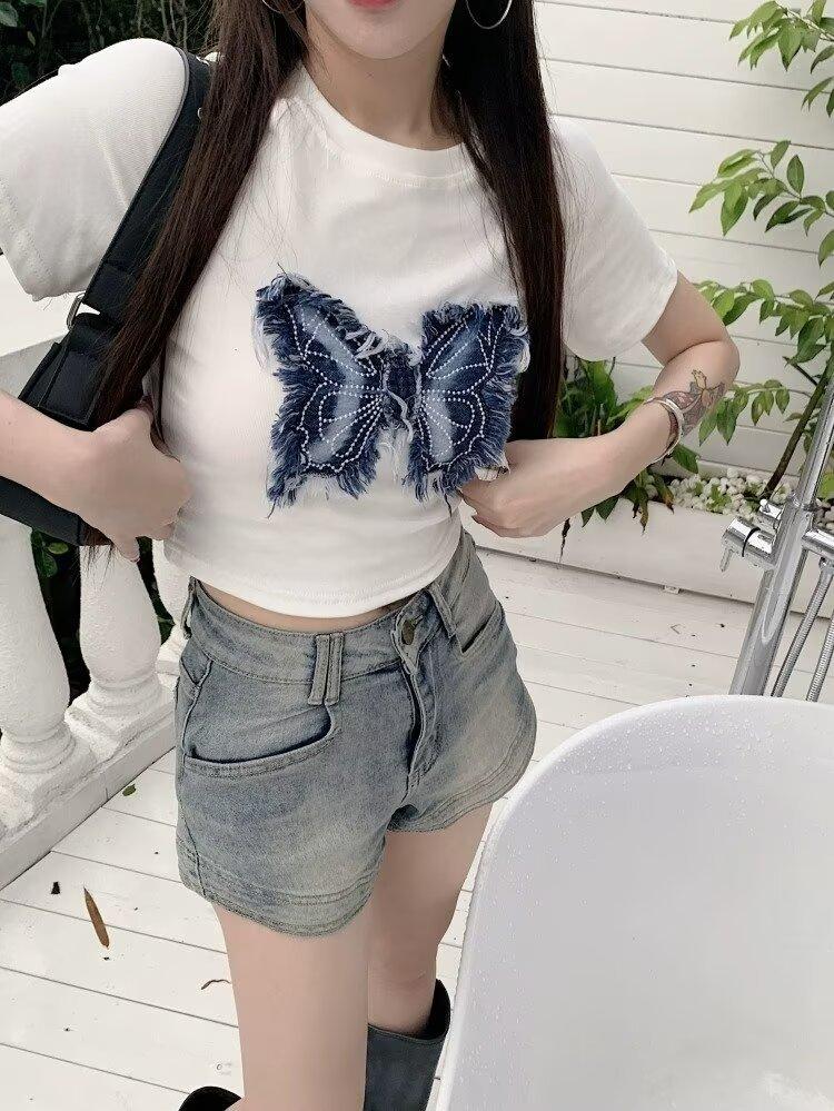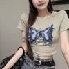 Camiseta de mariposa tridimensional estilo americano para mujer, diseño retro, estilo nicho, corte entallado, novedad de 2024, top corto dulce y sexy de manga corta.