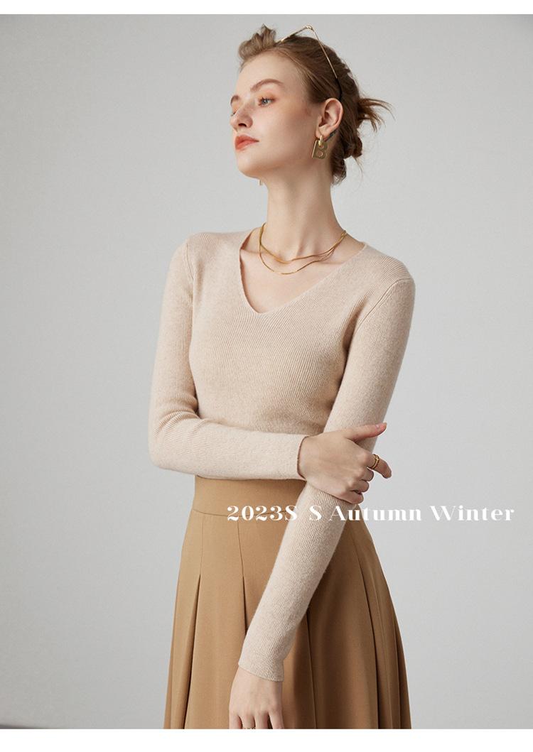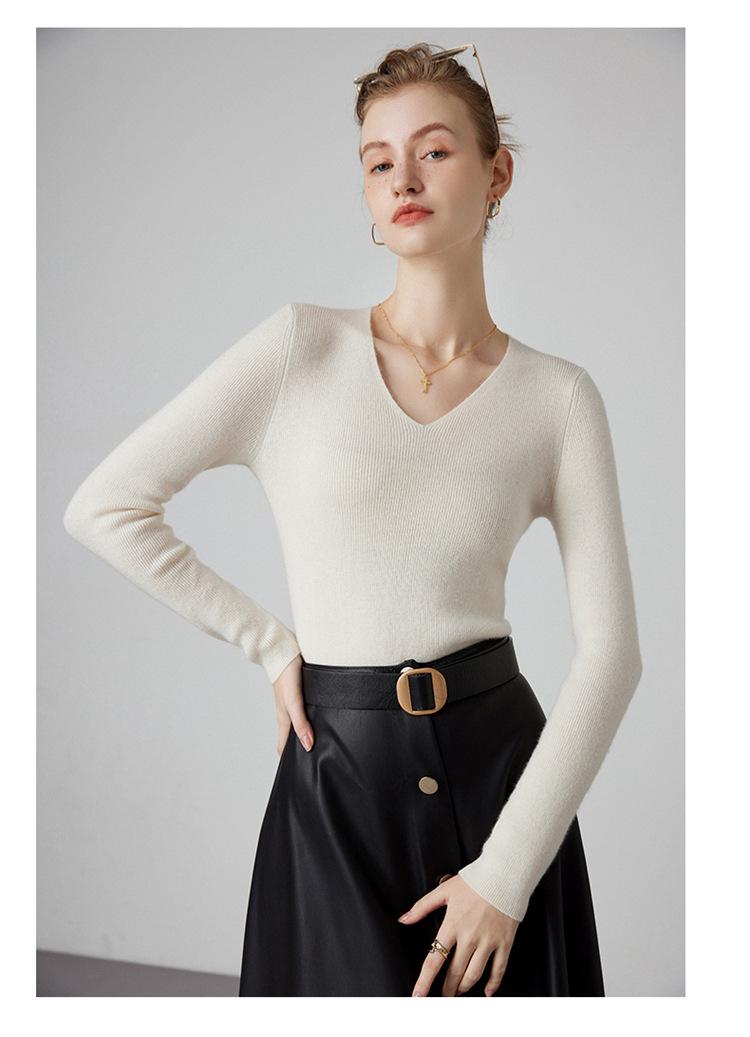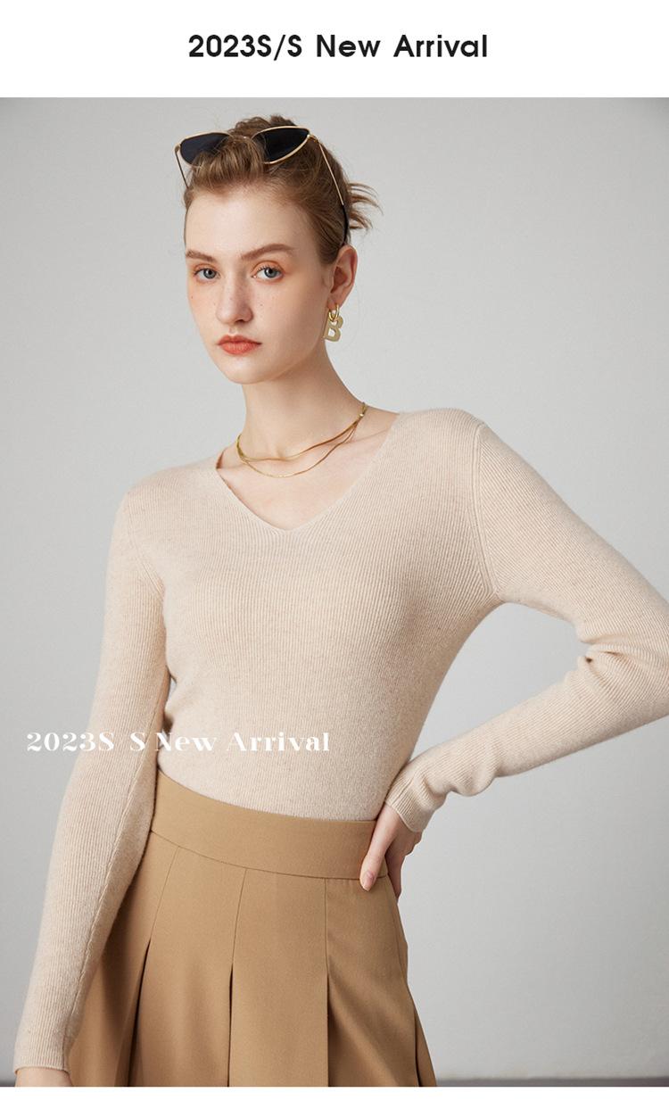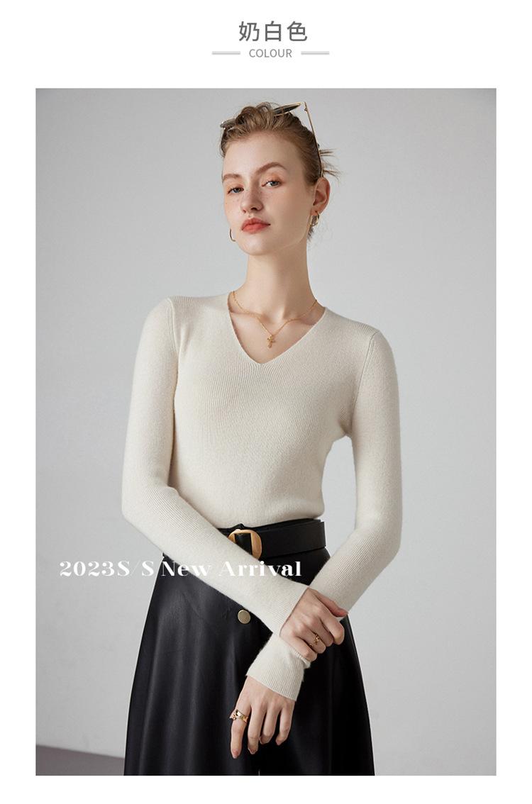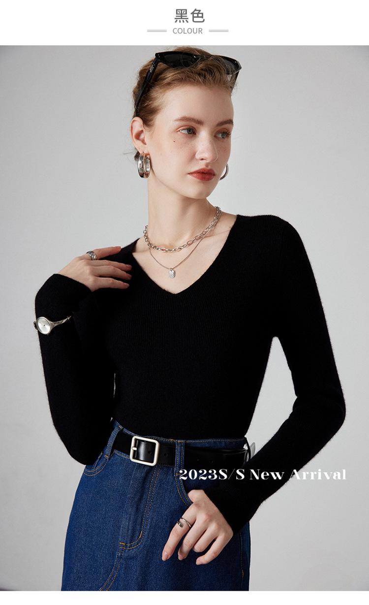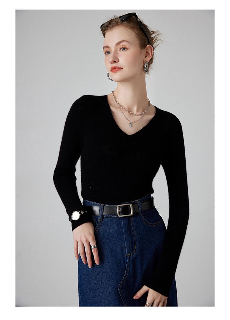 Suéter de Cachemira para Mujer Cuello en V Manga Larga Jersey Primavera y Otoño Nuevo Corte Ajustado Lana Tejido Suéter de Fondo Top Casual