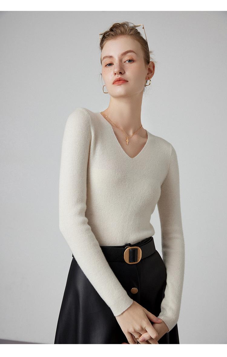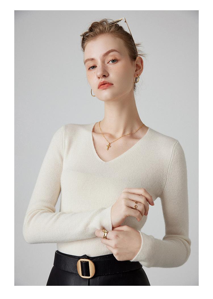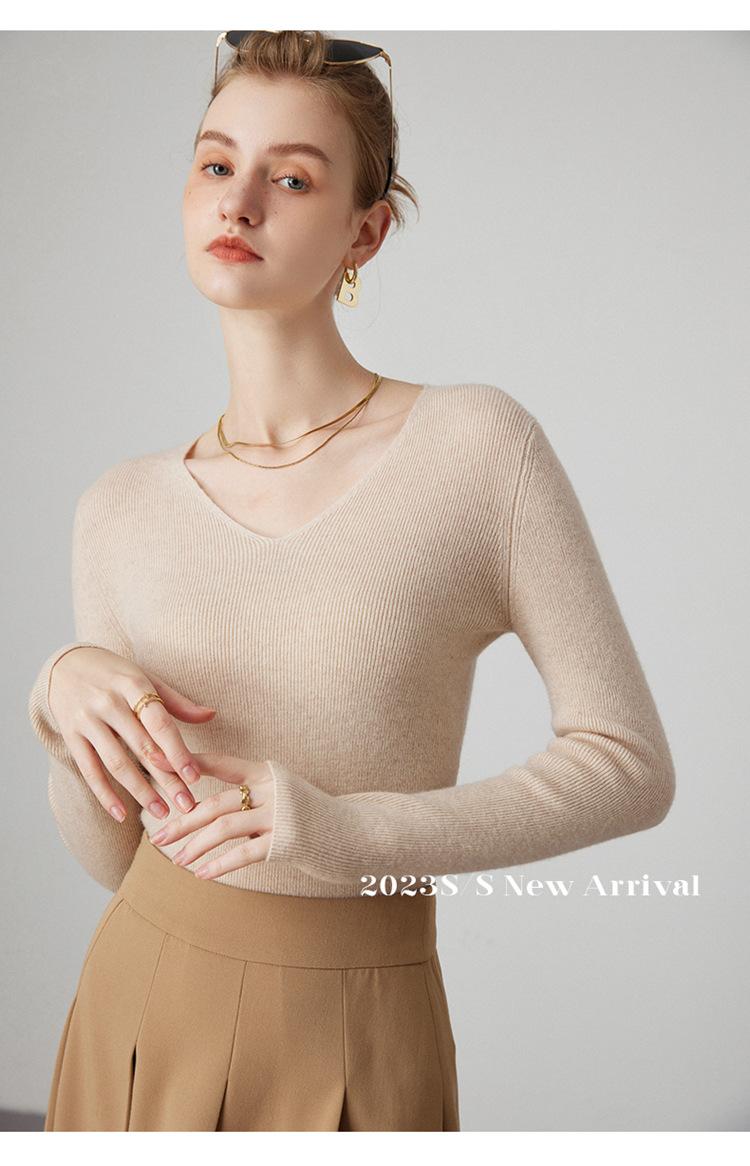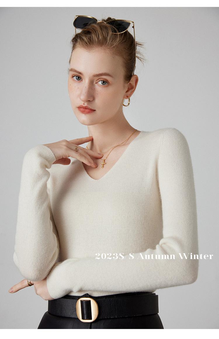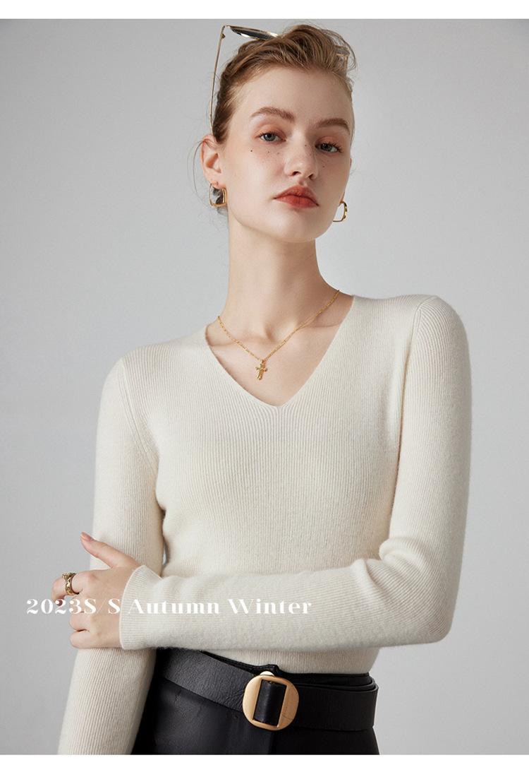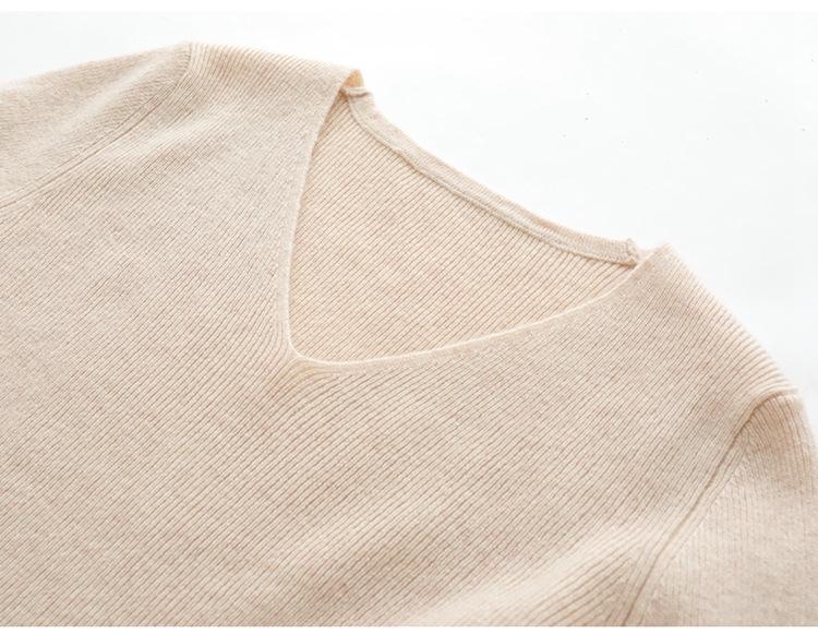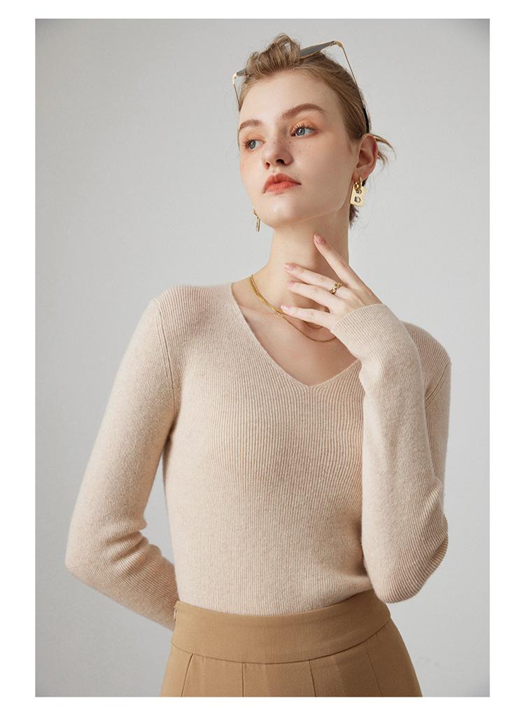 Suéter de Cachemira para Mujer Cuello en V Manga Larga Jersey Primavera y Otoño Nuevo Corte Ajustado Lana Tejido Suéter de Fondo Top Casual