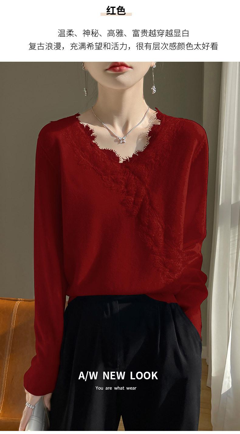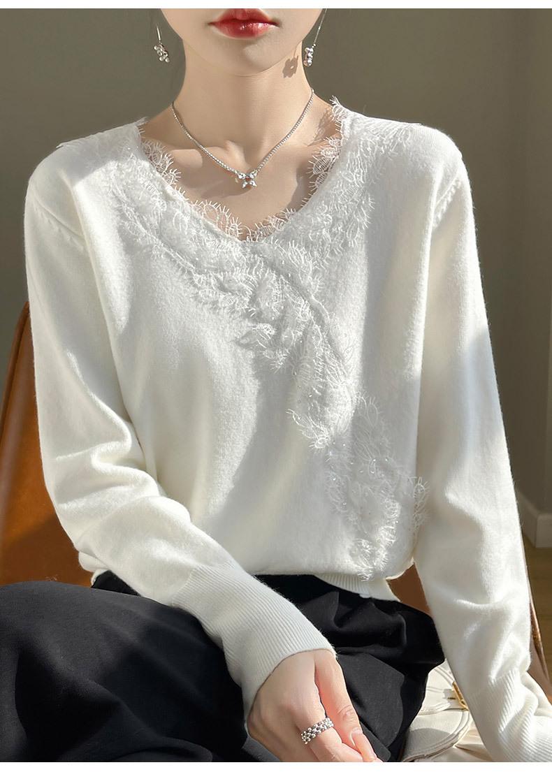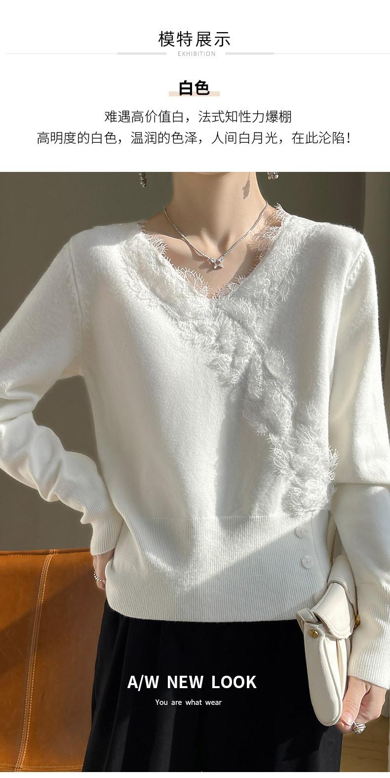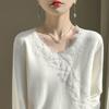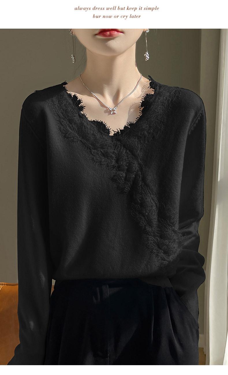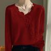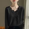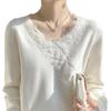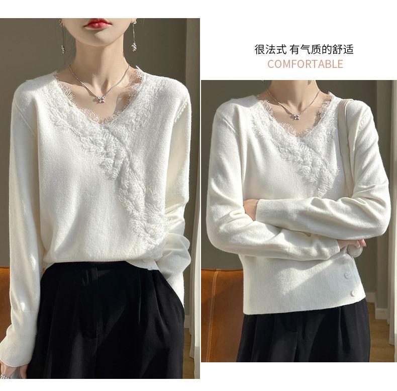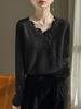 Suéter de cuello en V con encaje de estilo francés para mujer, otoño e invierno 2024, nueva camisa básica holgada de estilo occidental con textura suave y cerosa