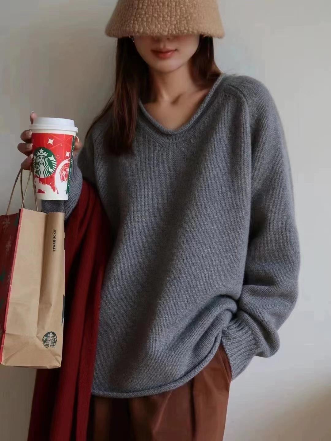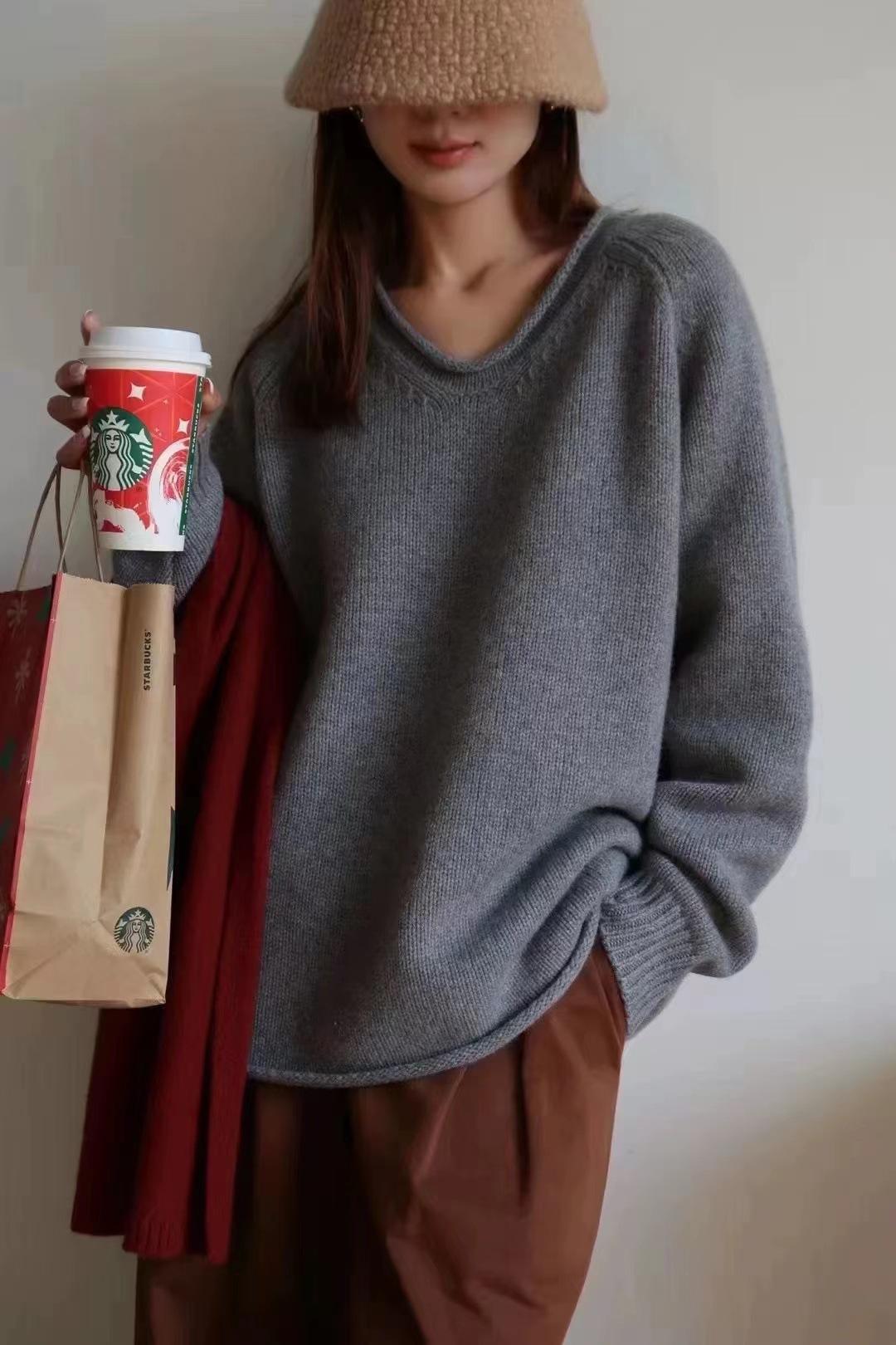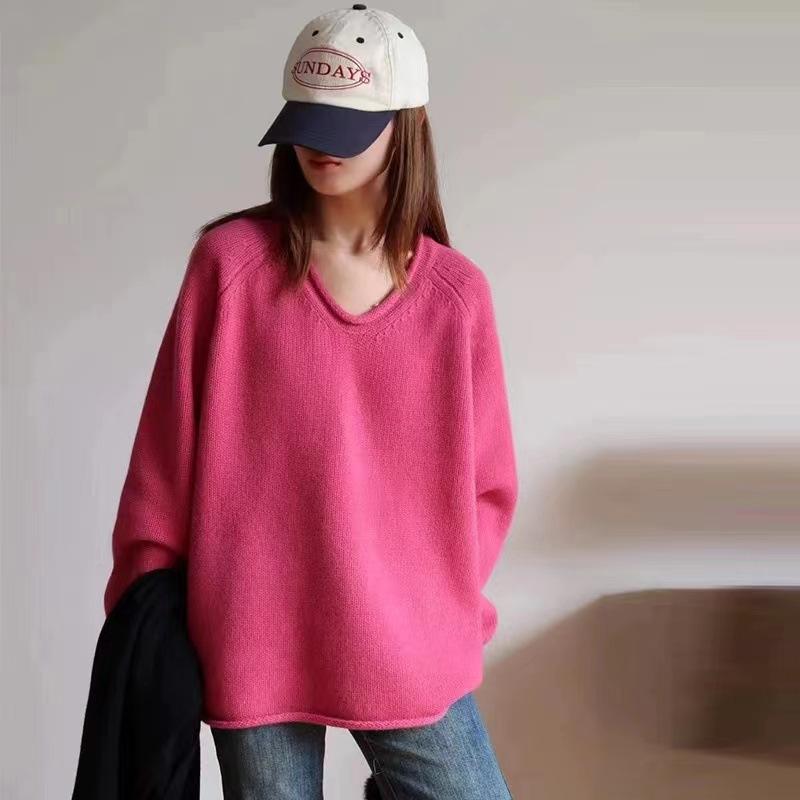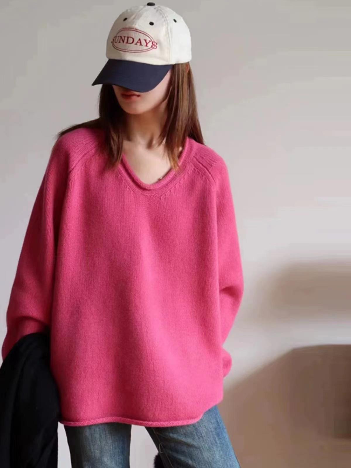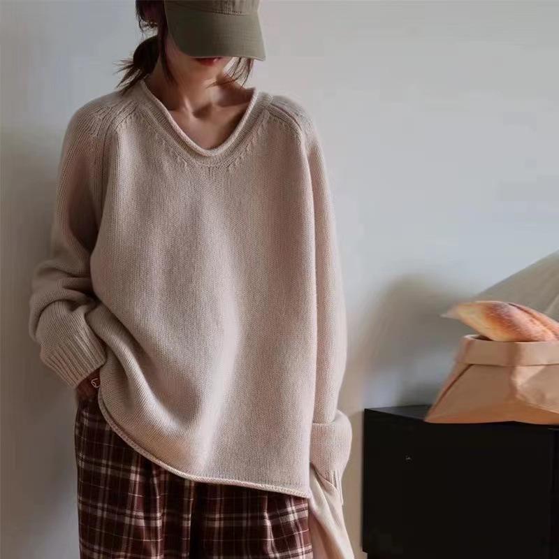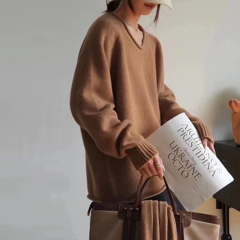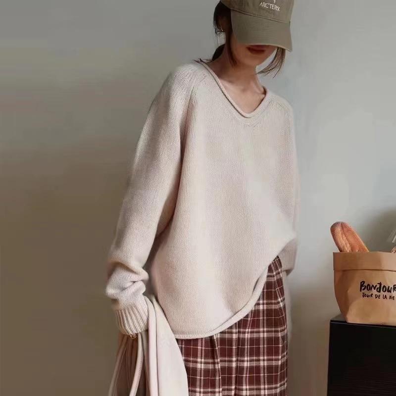 Estilo Coreano Nuevo Suéter de Punto de Lana Pura Rizo Cuello en V Base Tejida Suelta Simple Casual Otoño e Invierno Manga Larga para Mujer