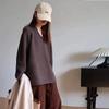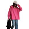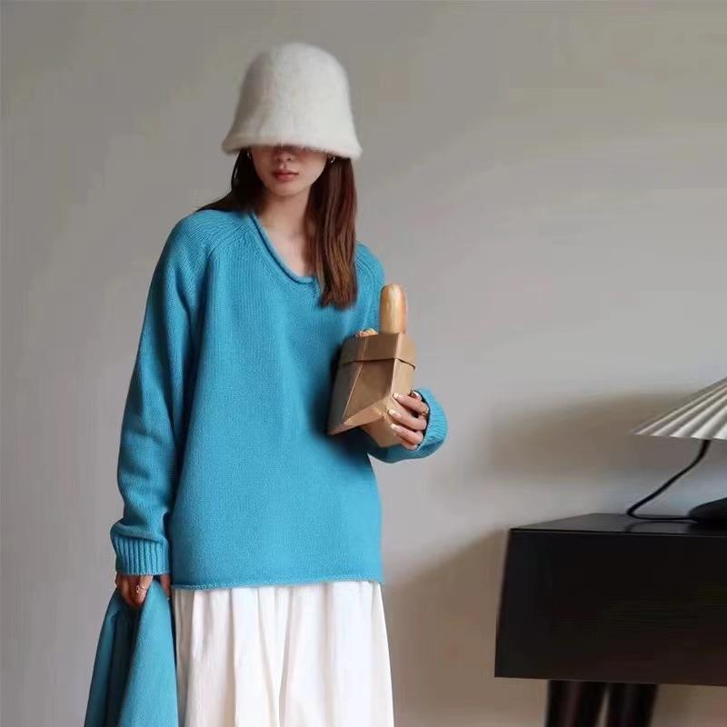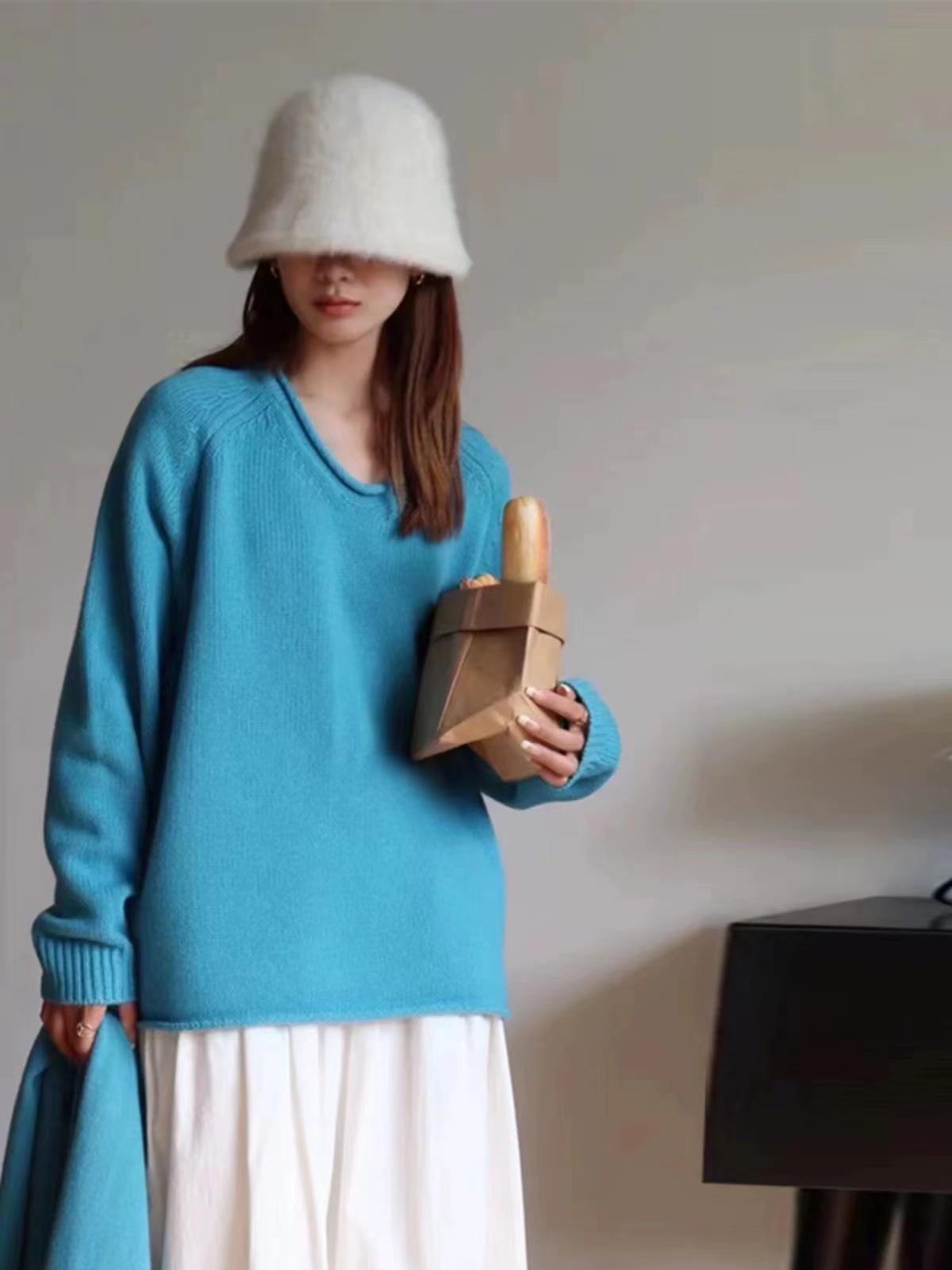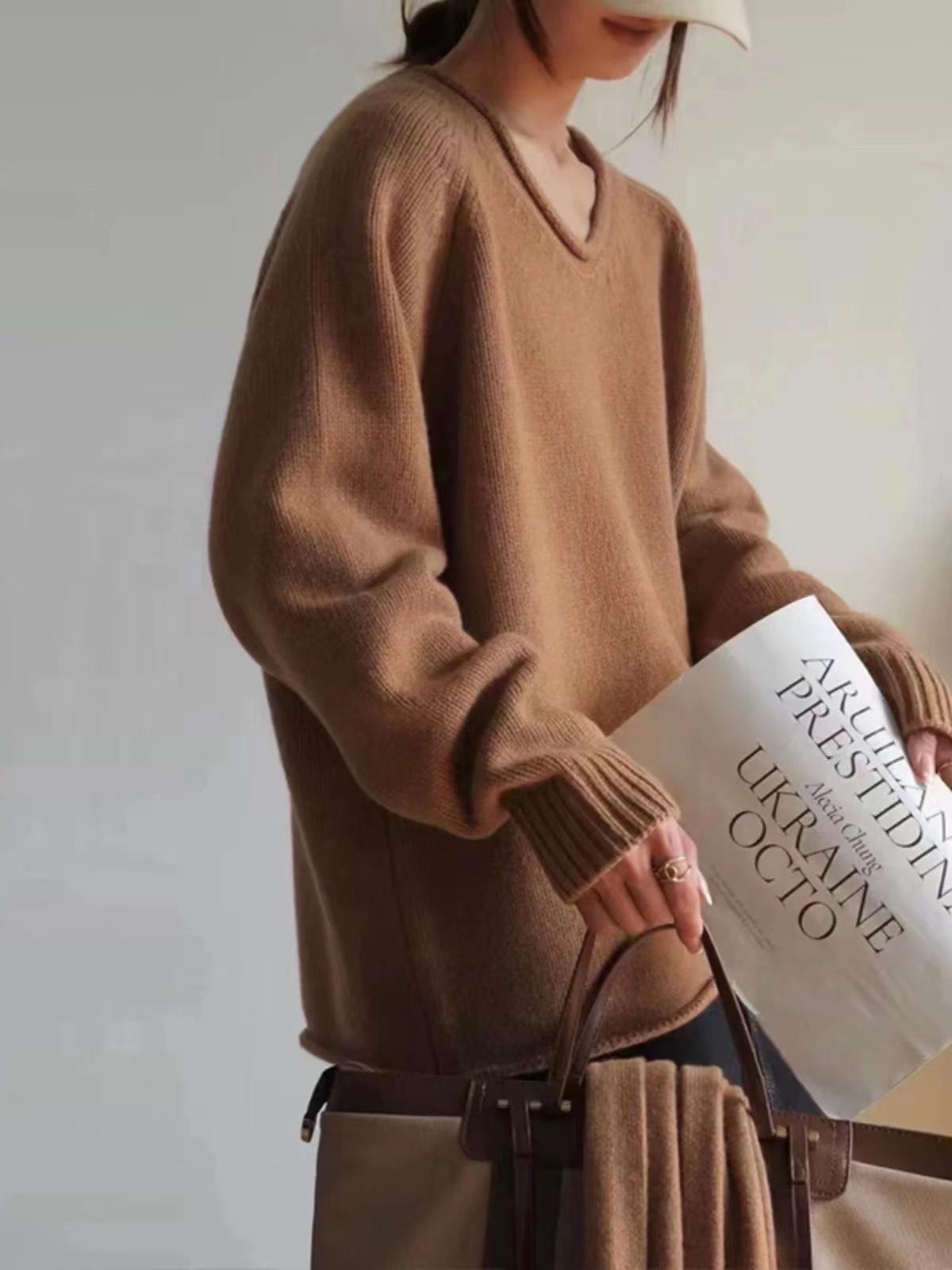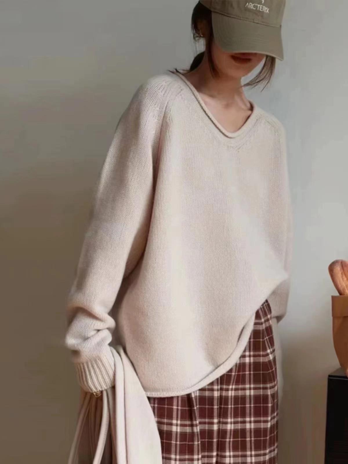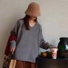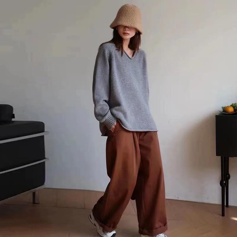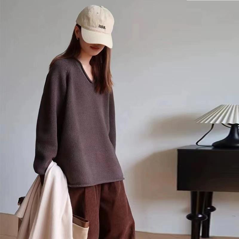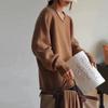 Estilo Coreano Nuevo Suéter de Punto de Lana Pura Rizo Cuello en V Base Tejida Suelta Simple Casual Otoño e Invierno Manga Larga para Mujer