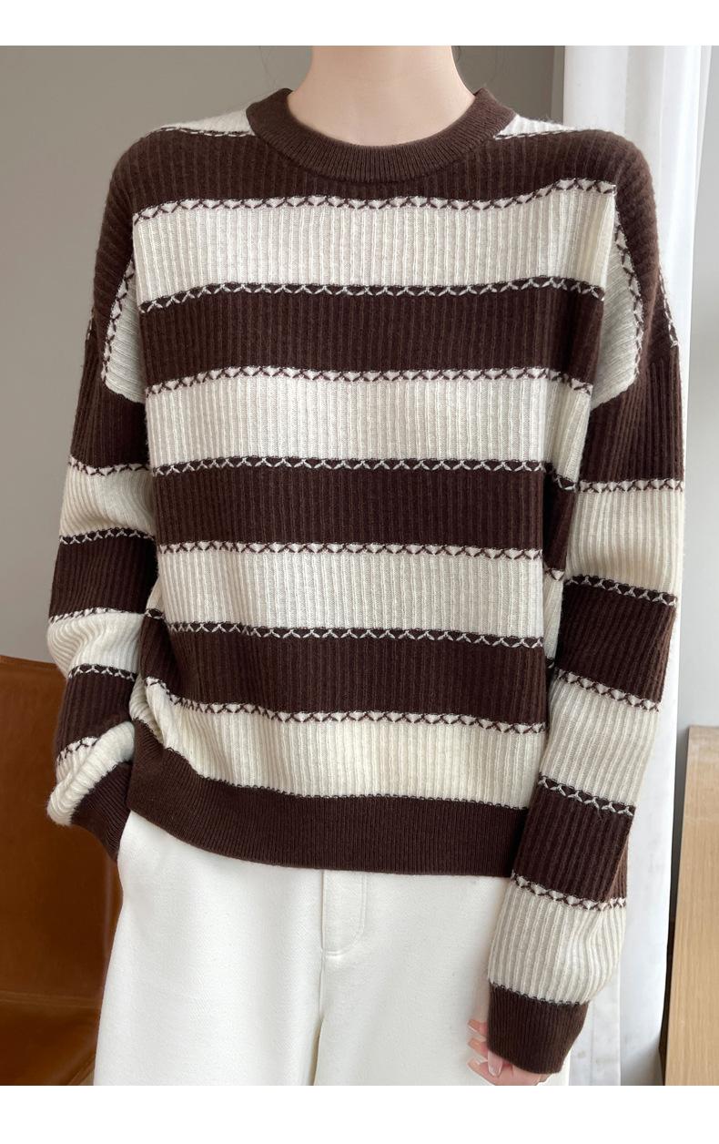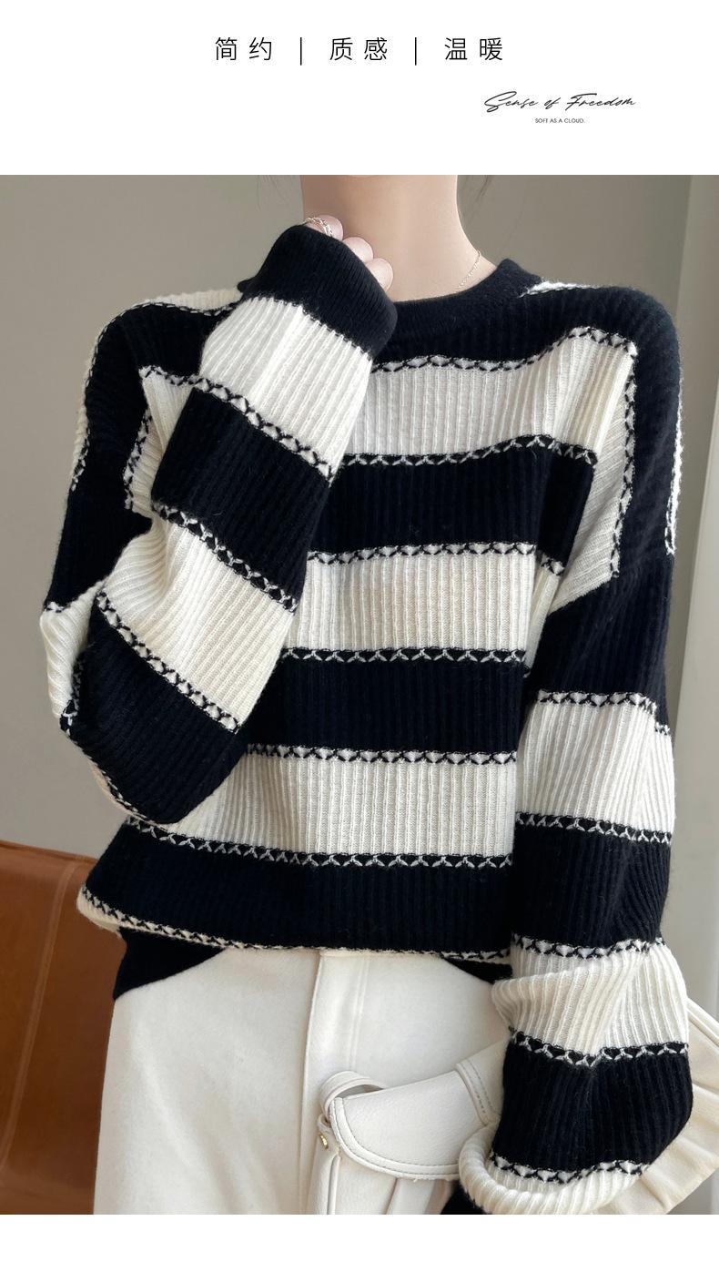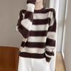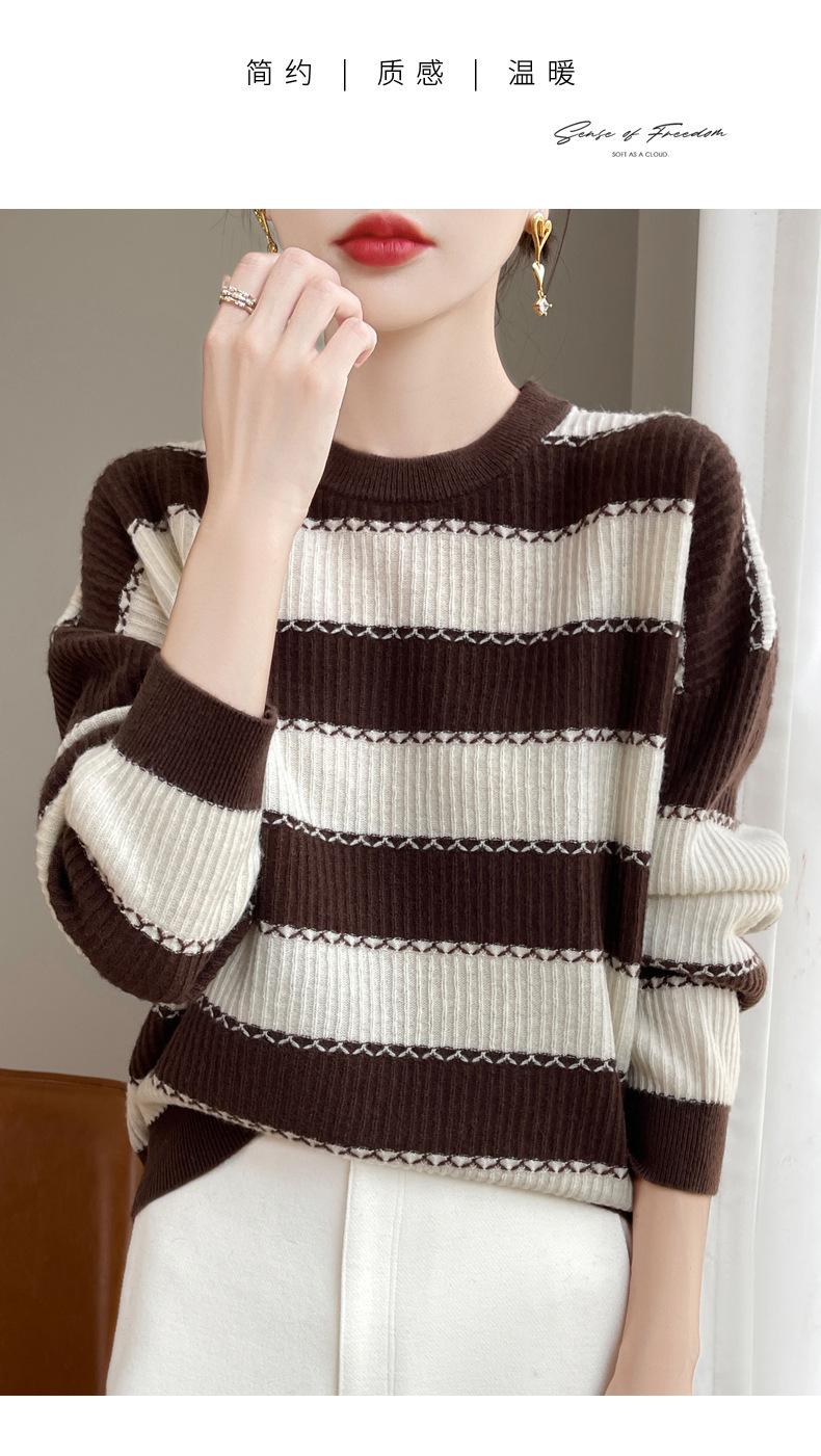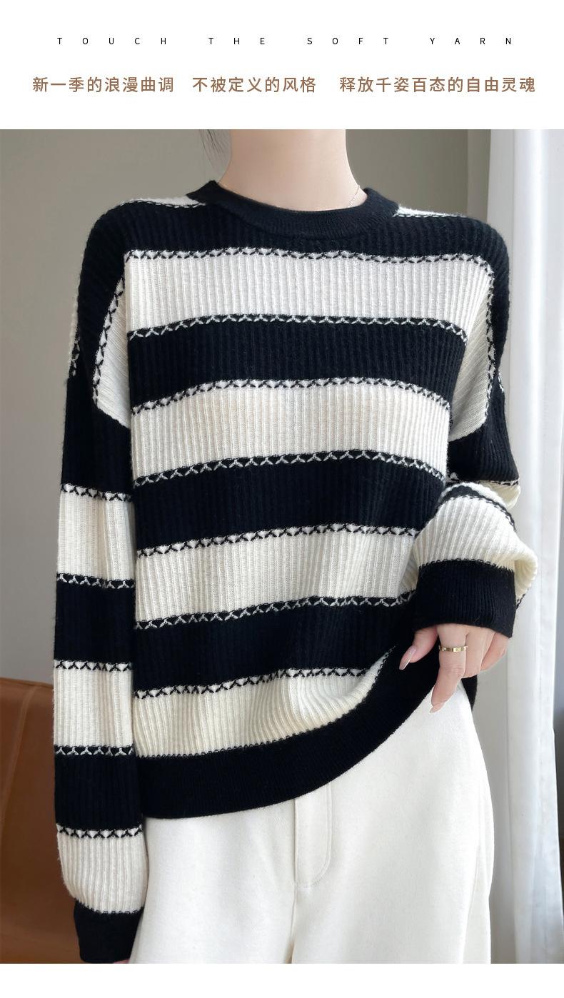 Suéter de Lana Nueva para Mujer de Cuello Redondo a Rayas, Suéter Pulóver Tejido, Camiseta Básica Ajustada de Moda y Versátil para Otoño e Invierno 2025