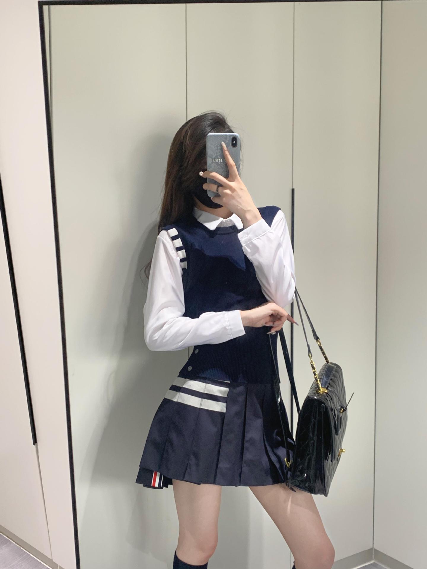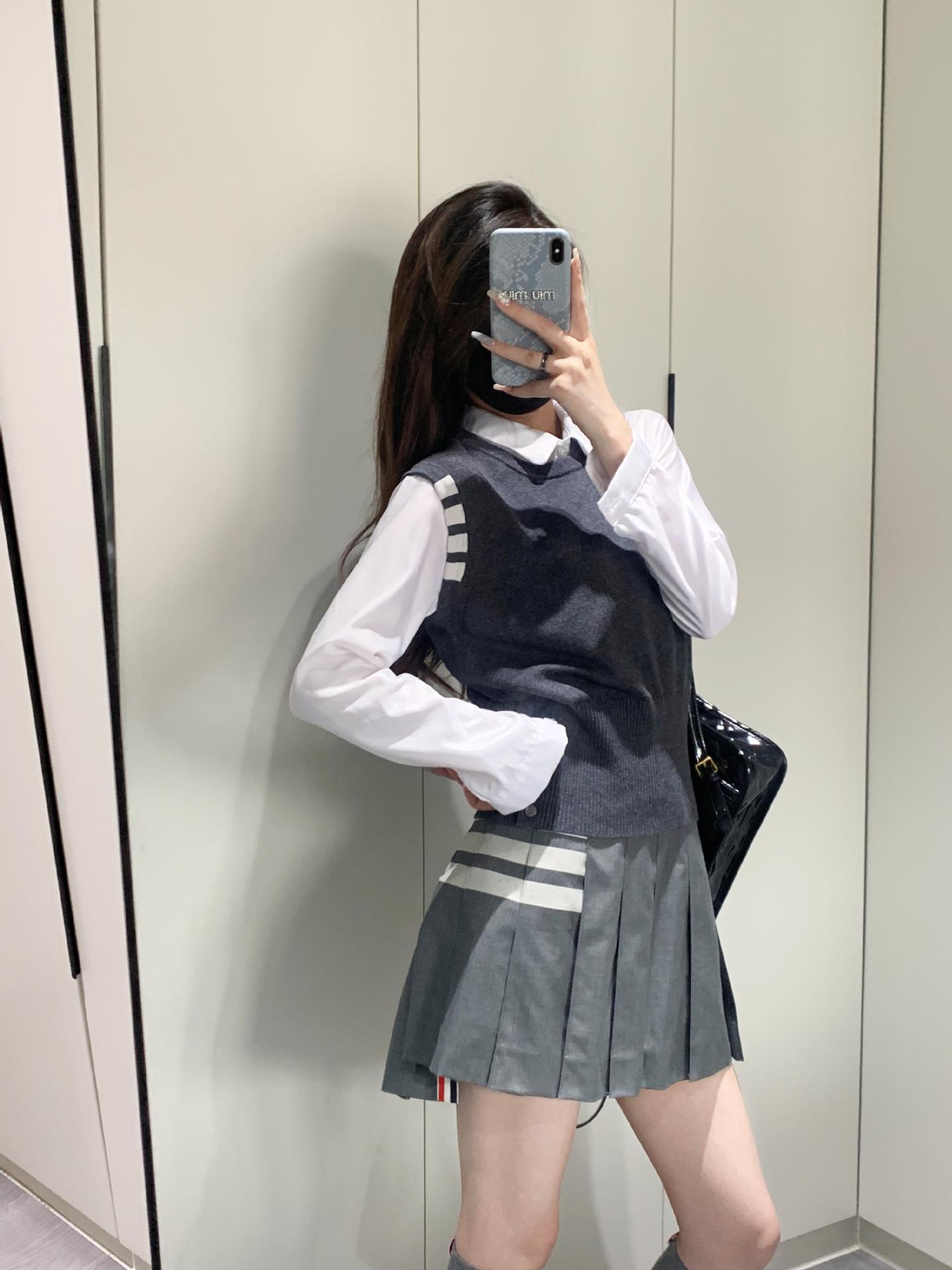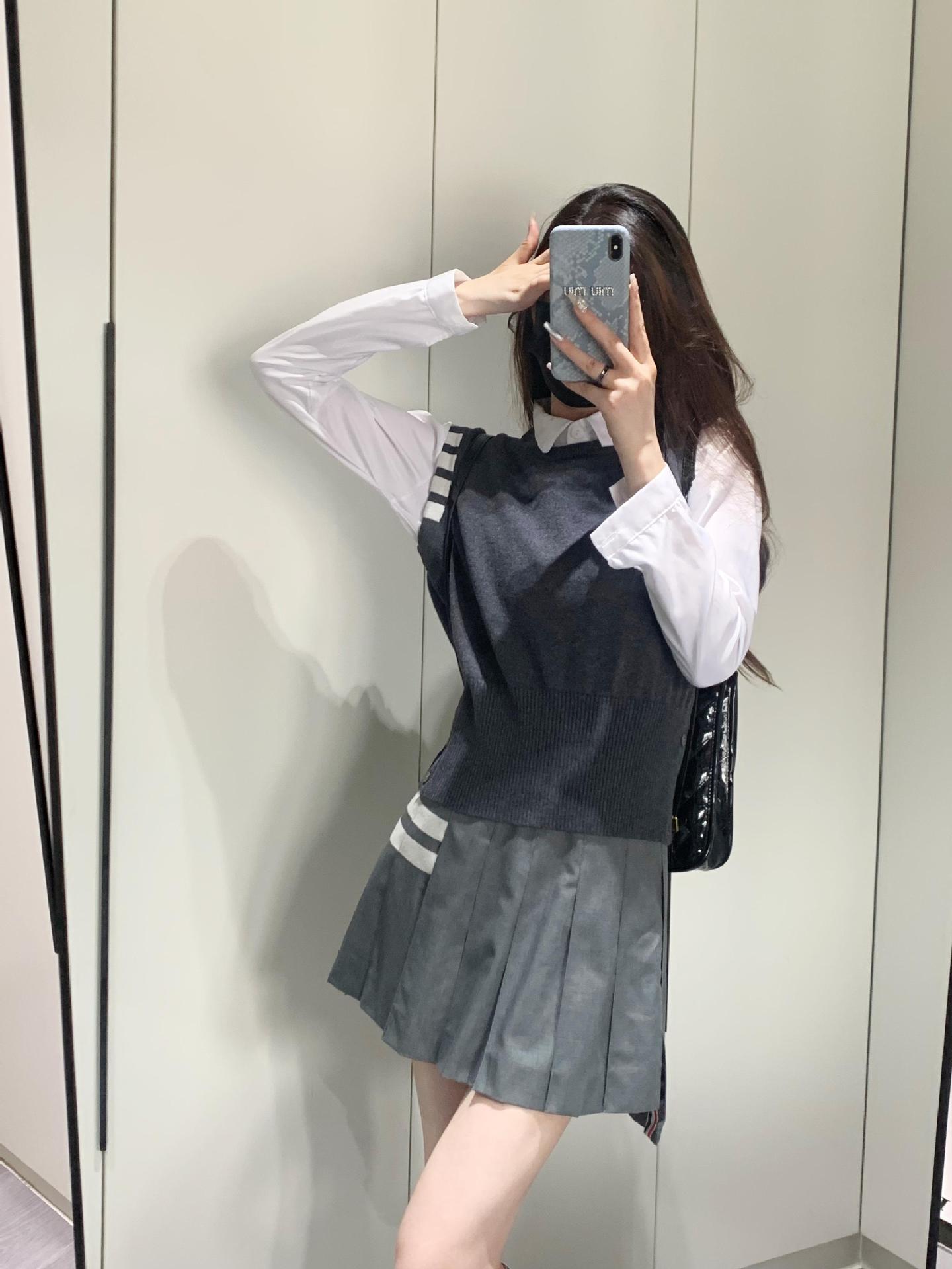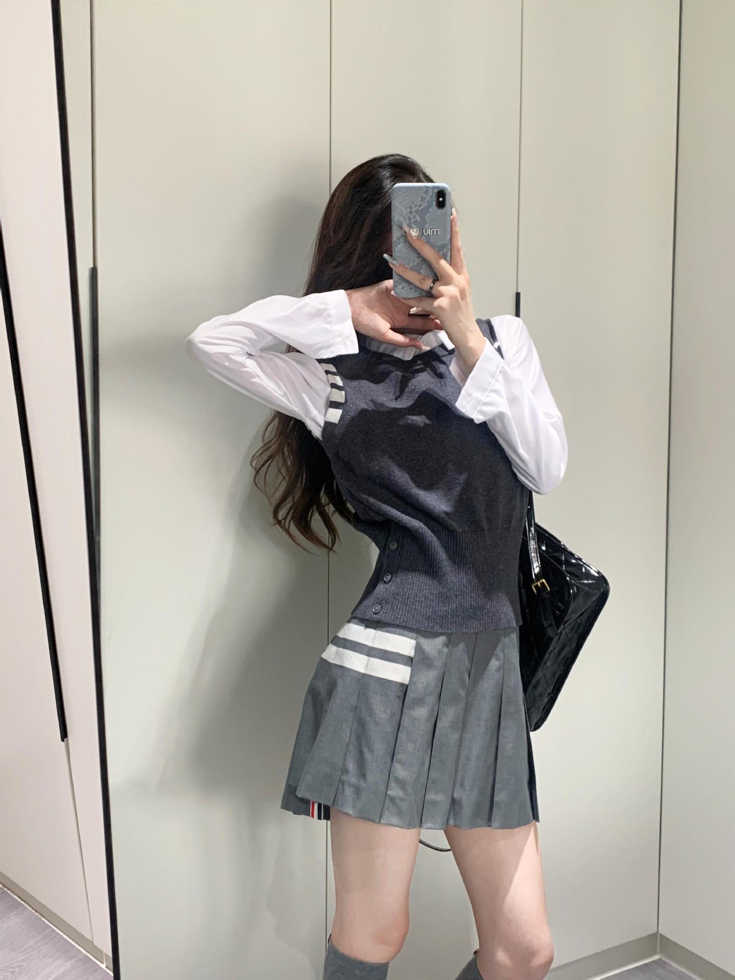 TB Primavera Otoño e Invierno Nuevo Chaleco de Punto de Cuello Redondo para Mujer Casual Combinable Estilo Academia Puño Cuatro Barras Chaleco de Punto
