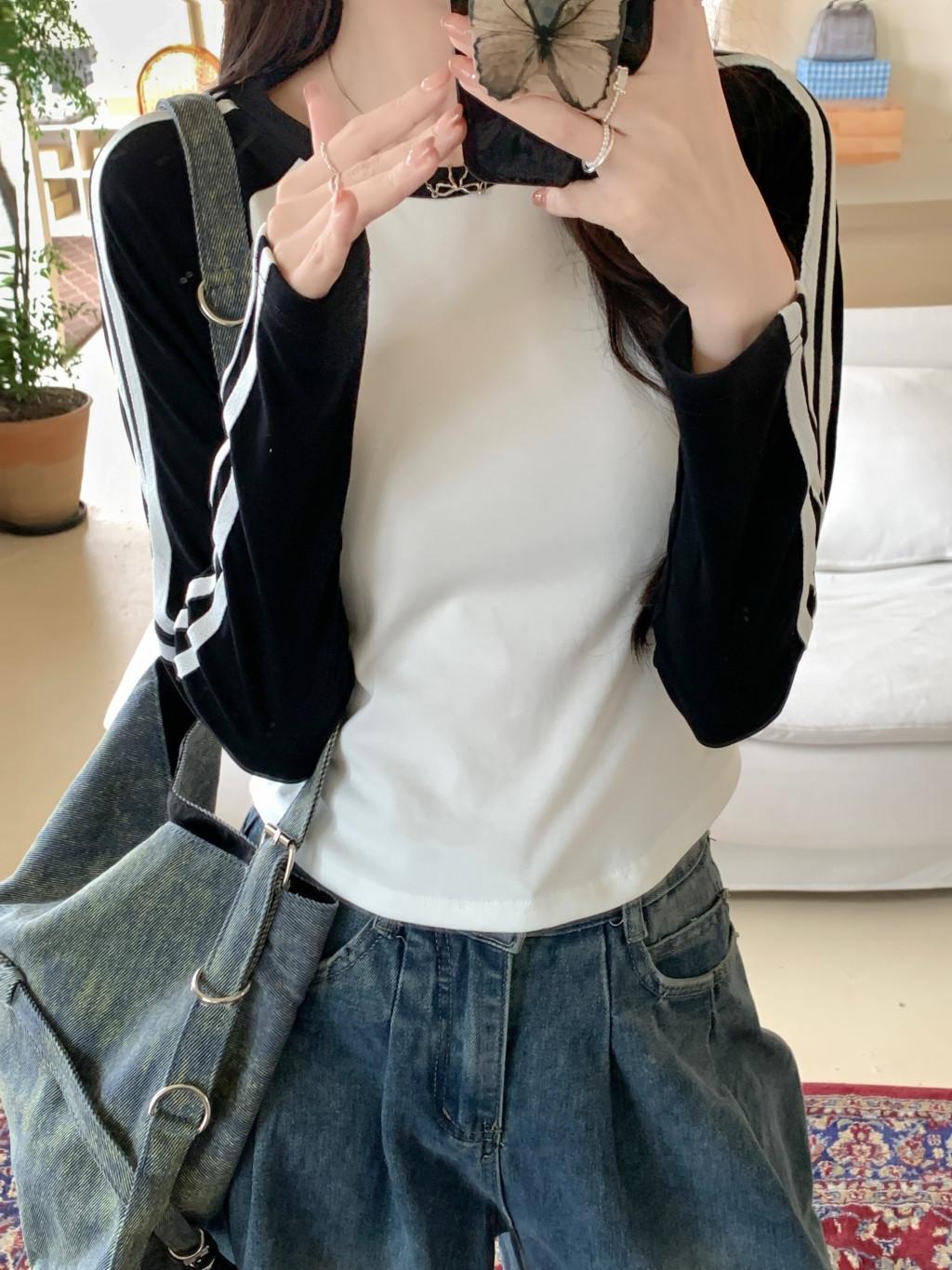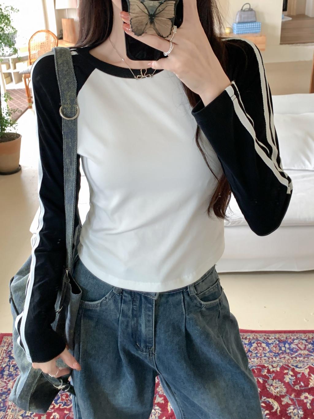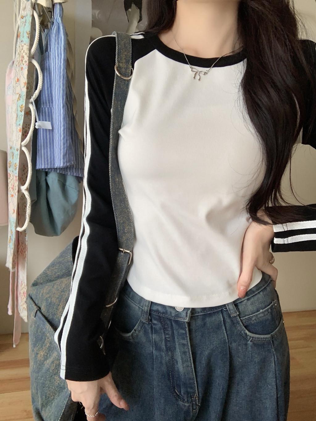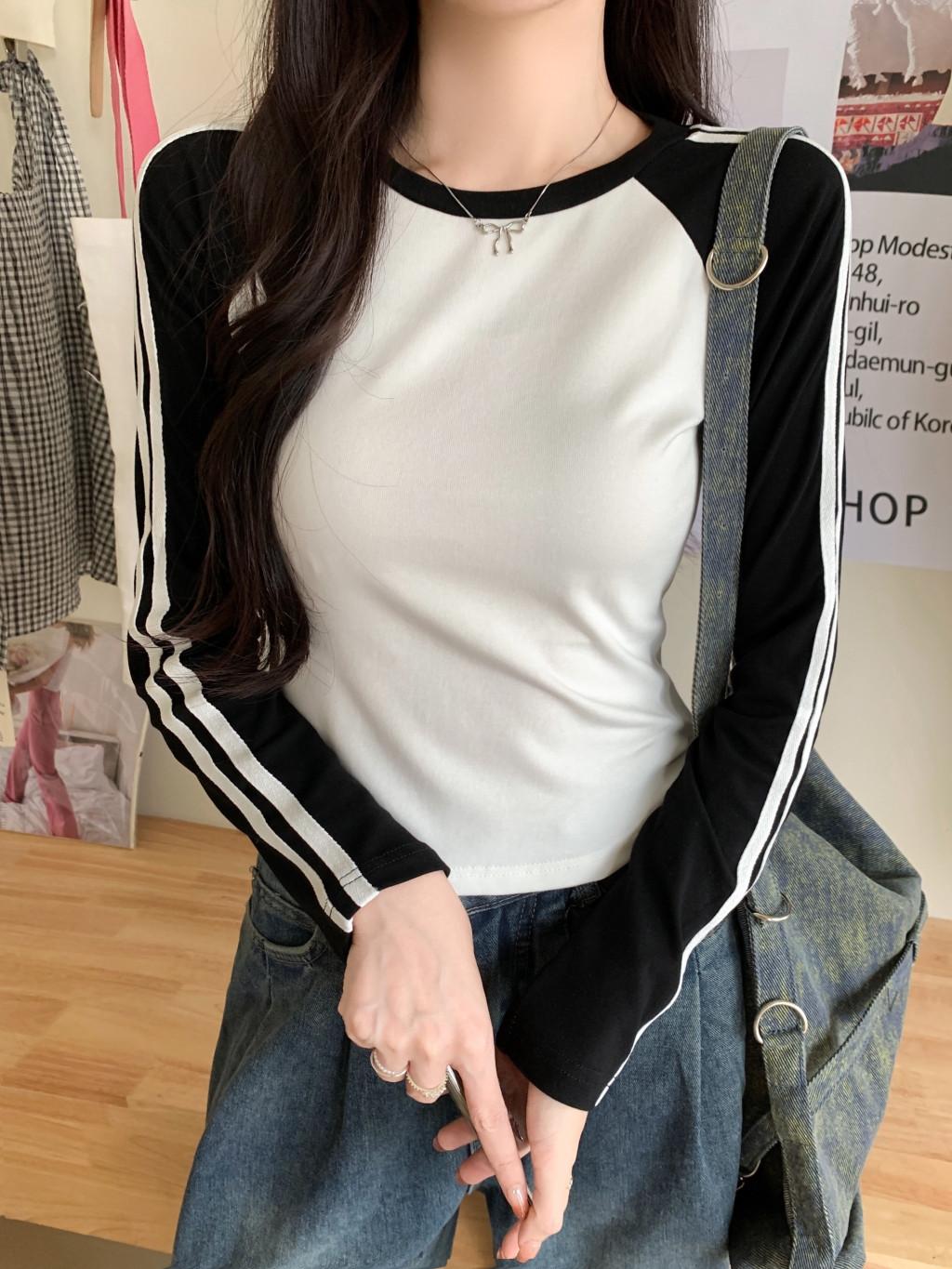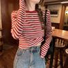 Camiseta de manga larga con hombros descubiertos y corte entallado para mujer, estilo coreano, estilo europeo y americano, con rayas de colores y costuras adelgazantes.