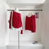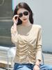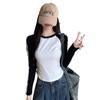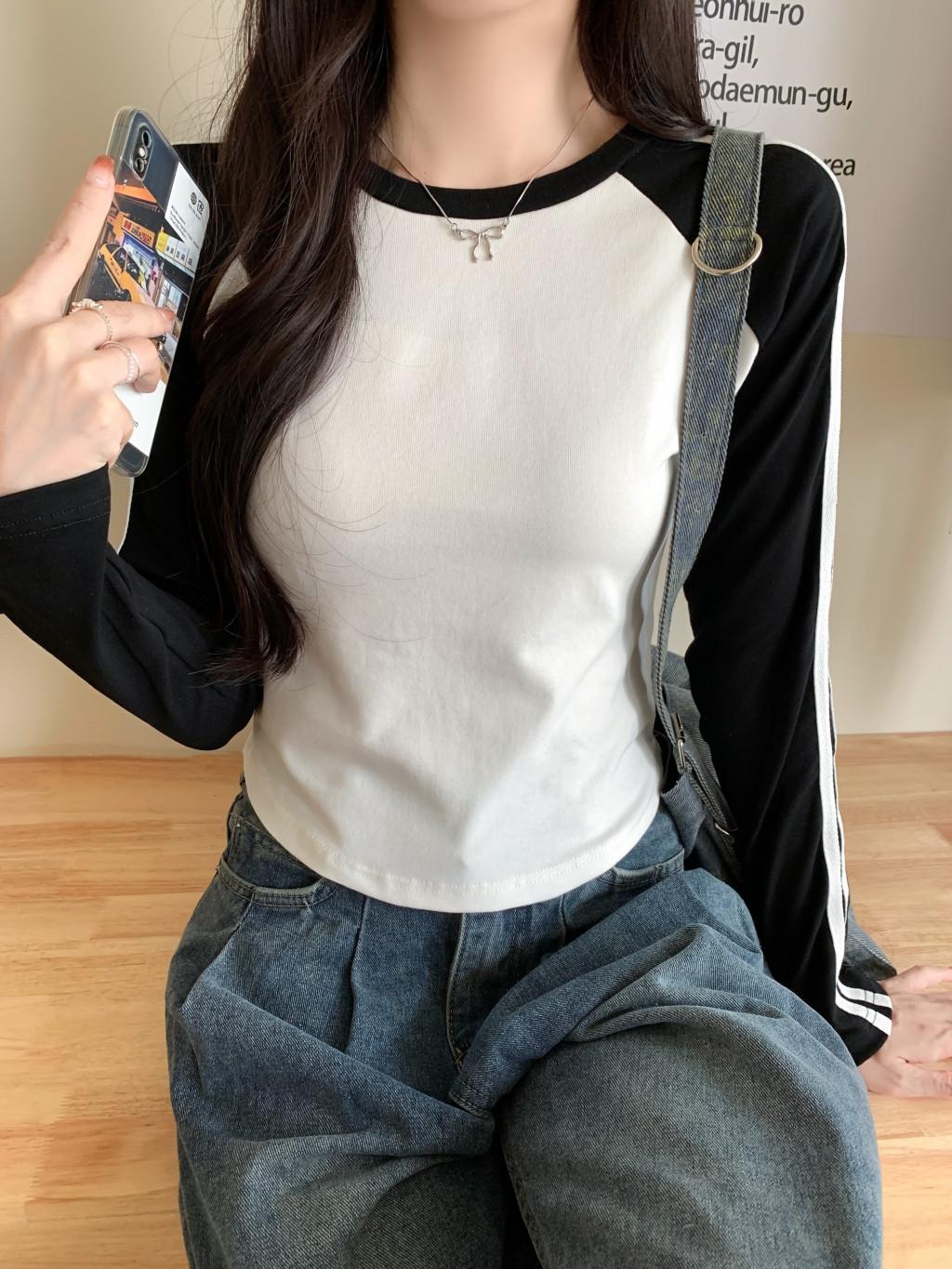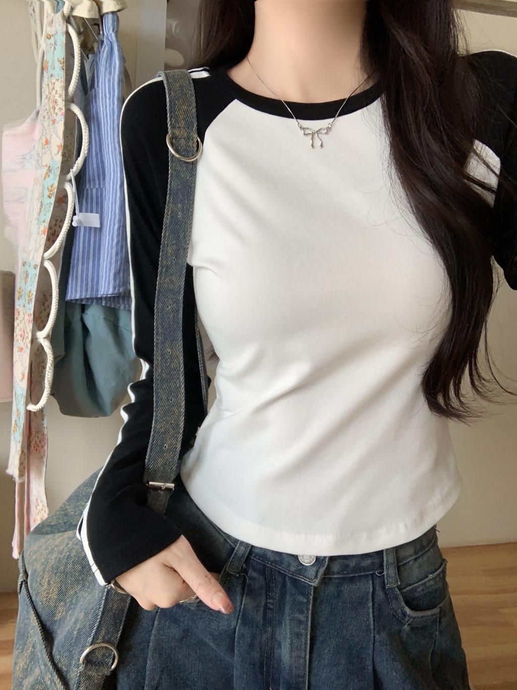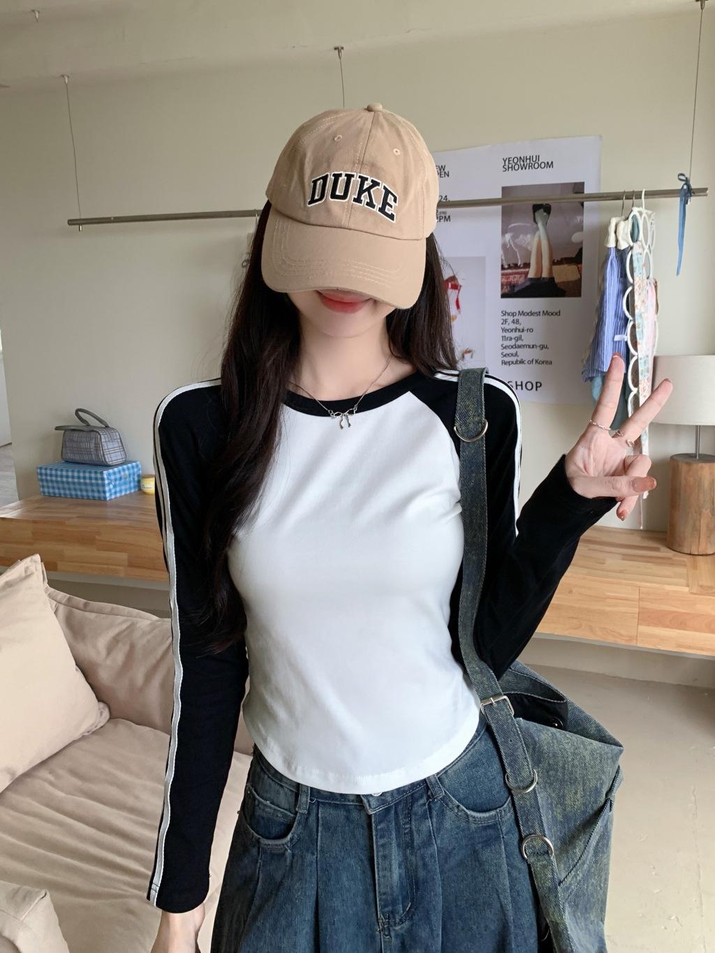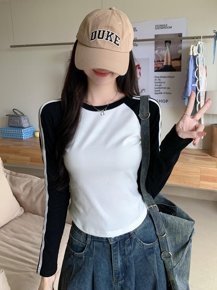 Camiseta de manga larga con hombros descubiertos y corte entallado para mujer, estilo coreano, estilo europeo y americano, con rayas de colores y costuras adelgazantes.
