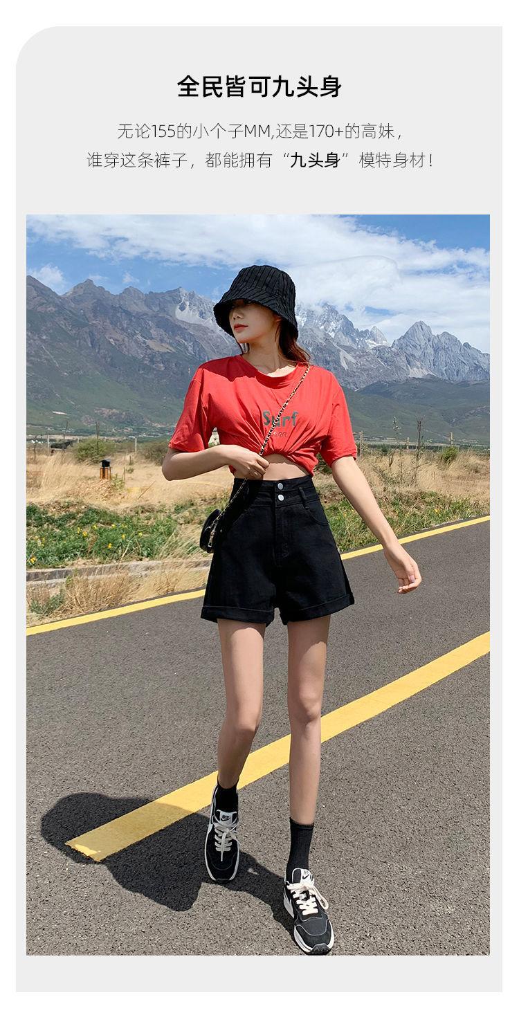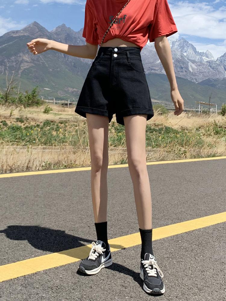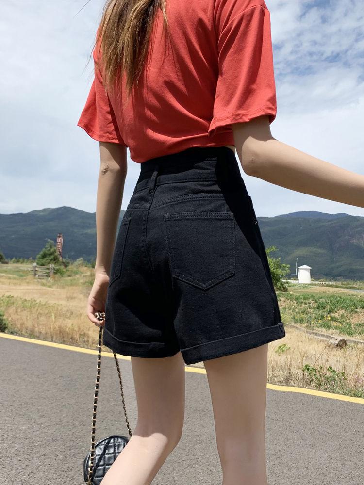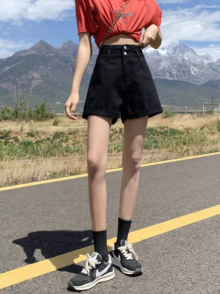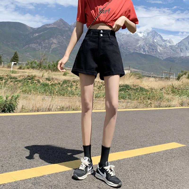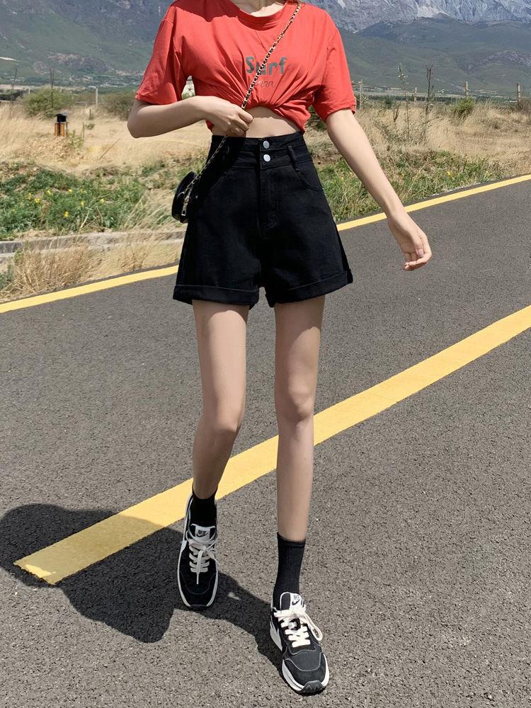 Cintura Shorts de mezclilla negros de mujer Verano 2022 Nuevo Look Slim Holgados Combinan con todo Pierna ancha Forma A Pantalones cortos de moda Ins