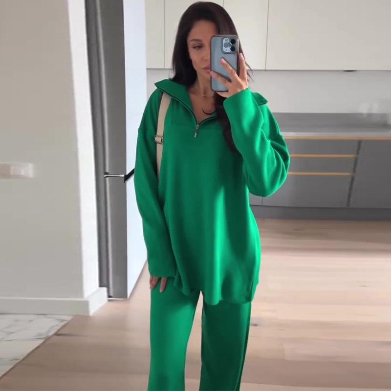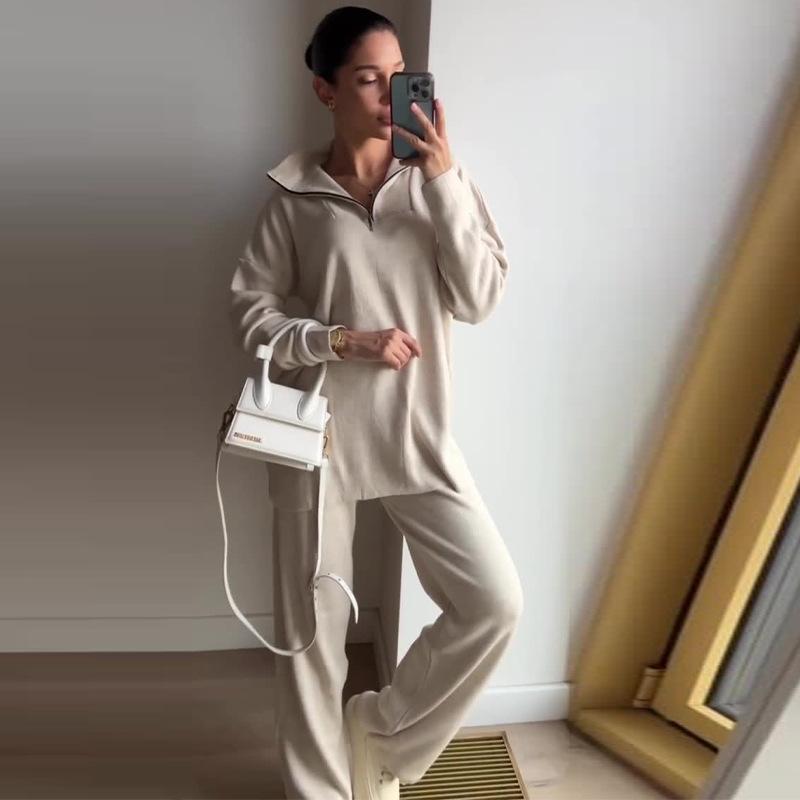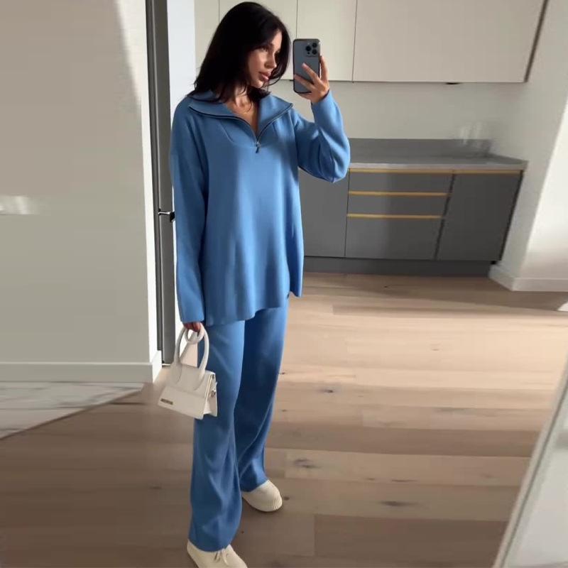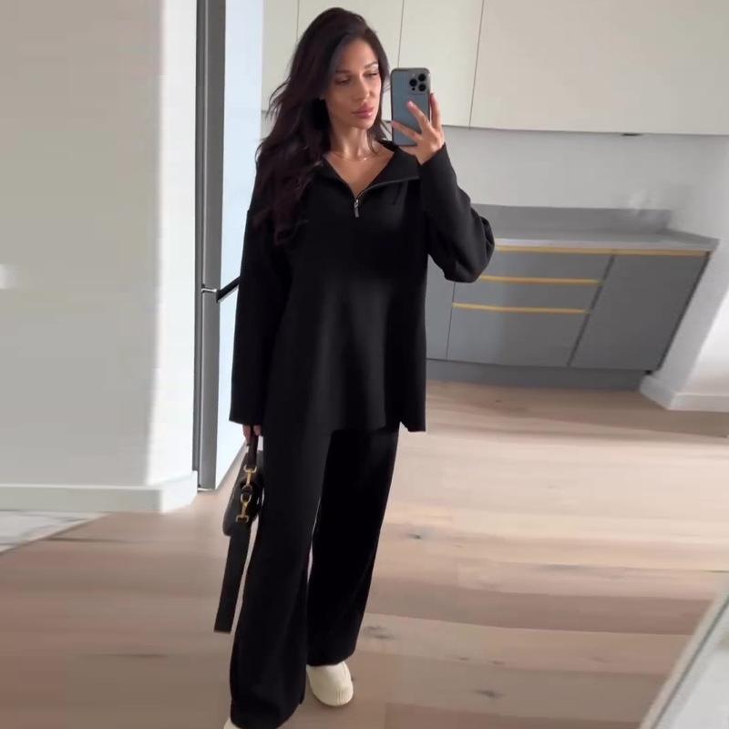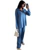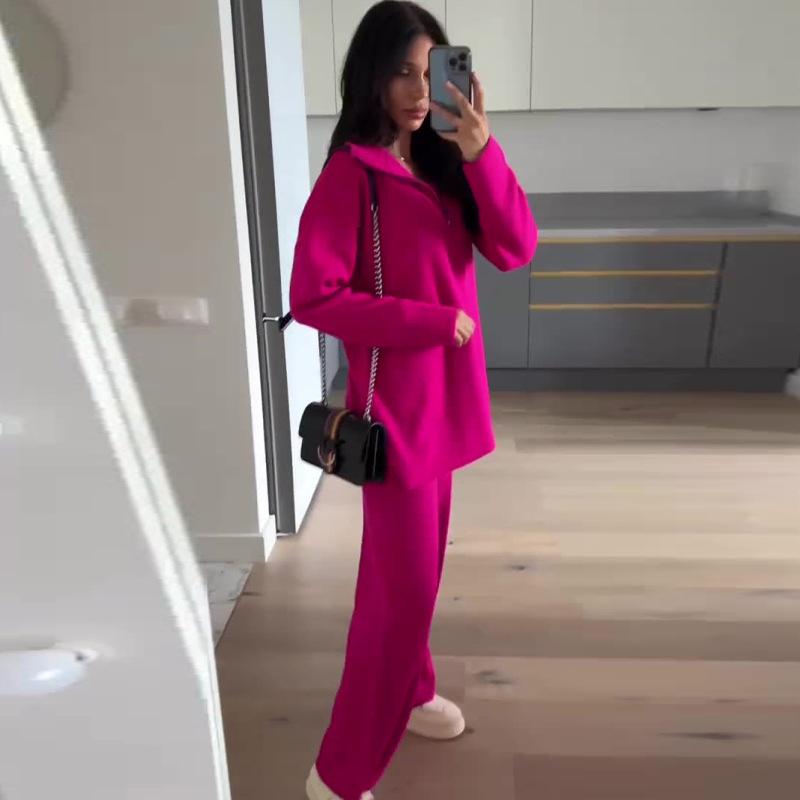Conjunto de dos piezas de pantalones de punto informales con solapa de color sólido para mujer, estilo Amazon transfronterizo de Europa y América, otoño de 2024