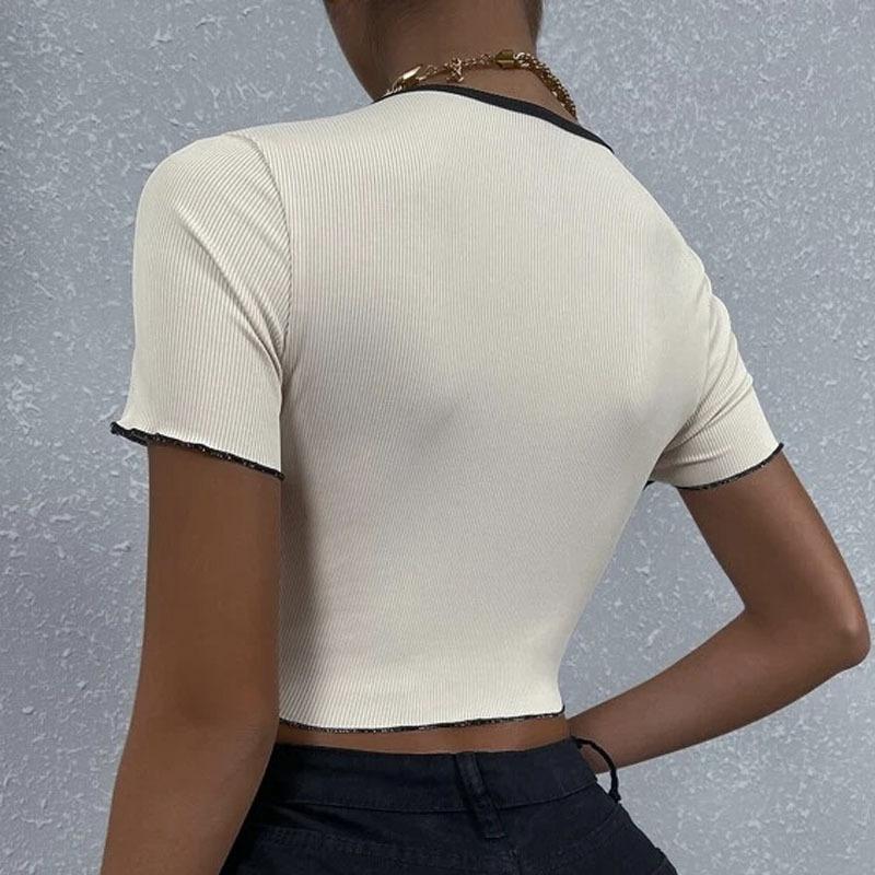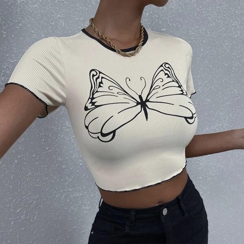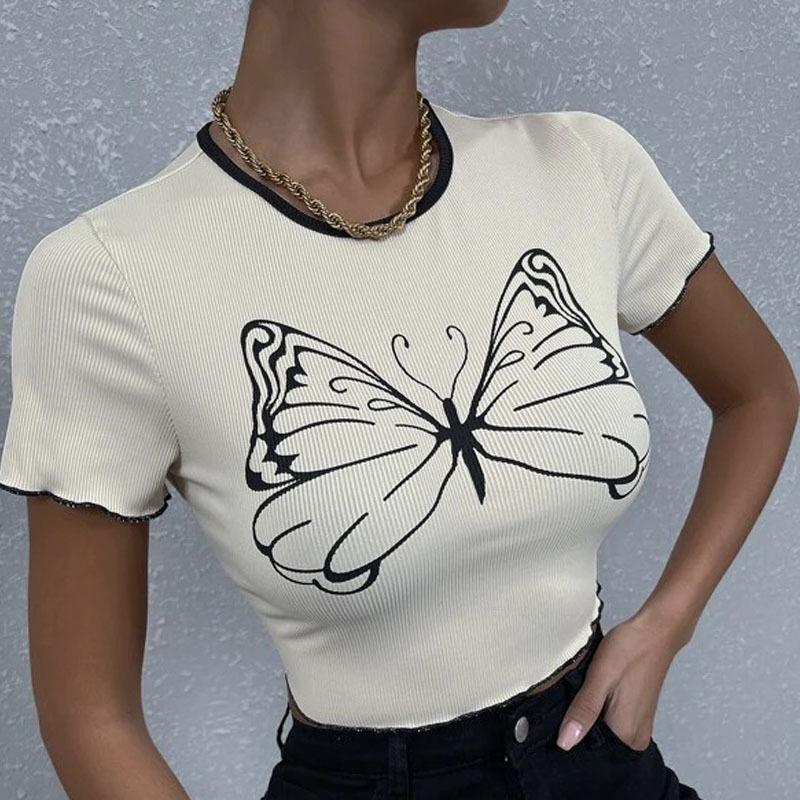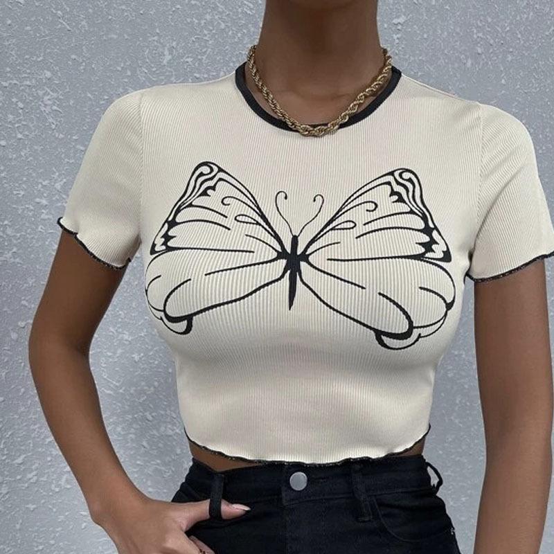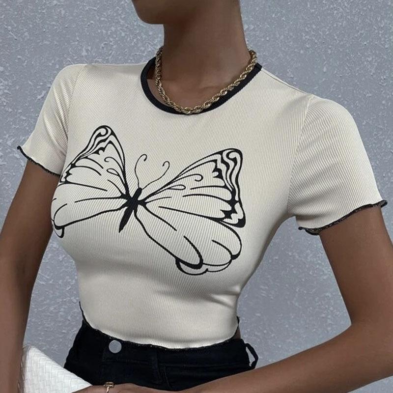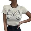 2023 Verano europeo y americano transfronterizo nueva camiseta versátil personalizada de mujer con estampado de mariposas Top ajustado casual urbano